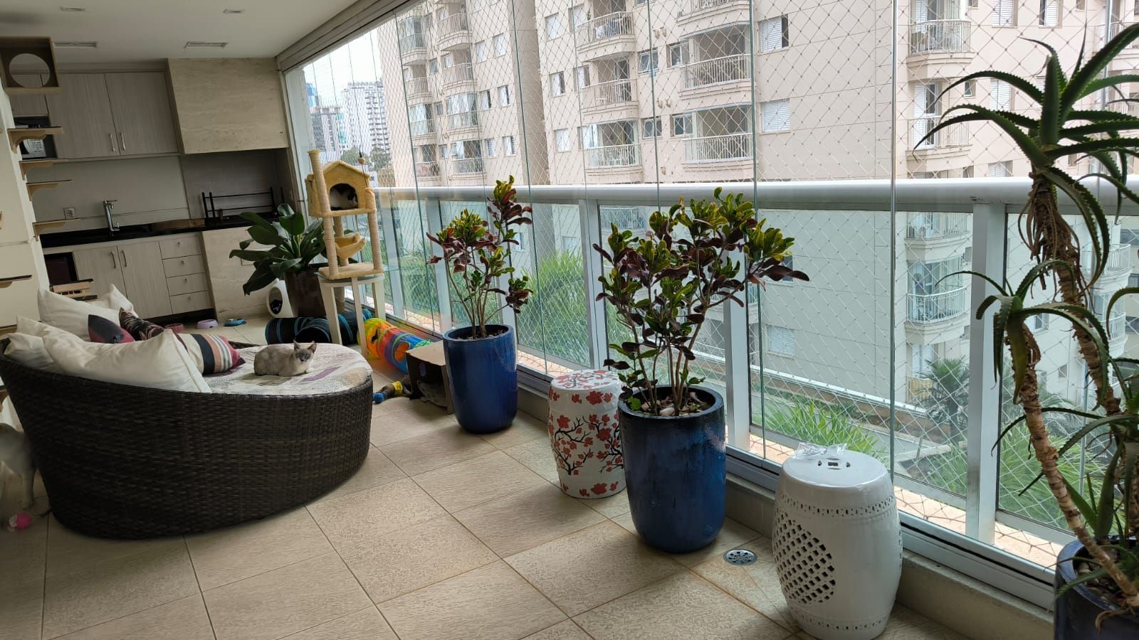 Varanda gourmet com churrasqueira em mármore puro, pia também em mármore, e fechamento em vidro – perfeita para receber com sofisticação