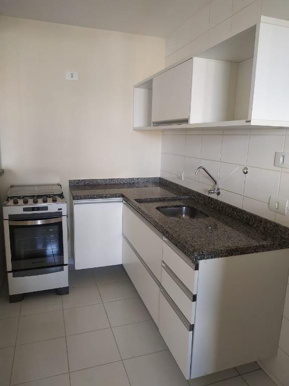 Cozinha completa com armários planejados, fogão e forno embutido