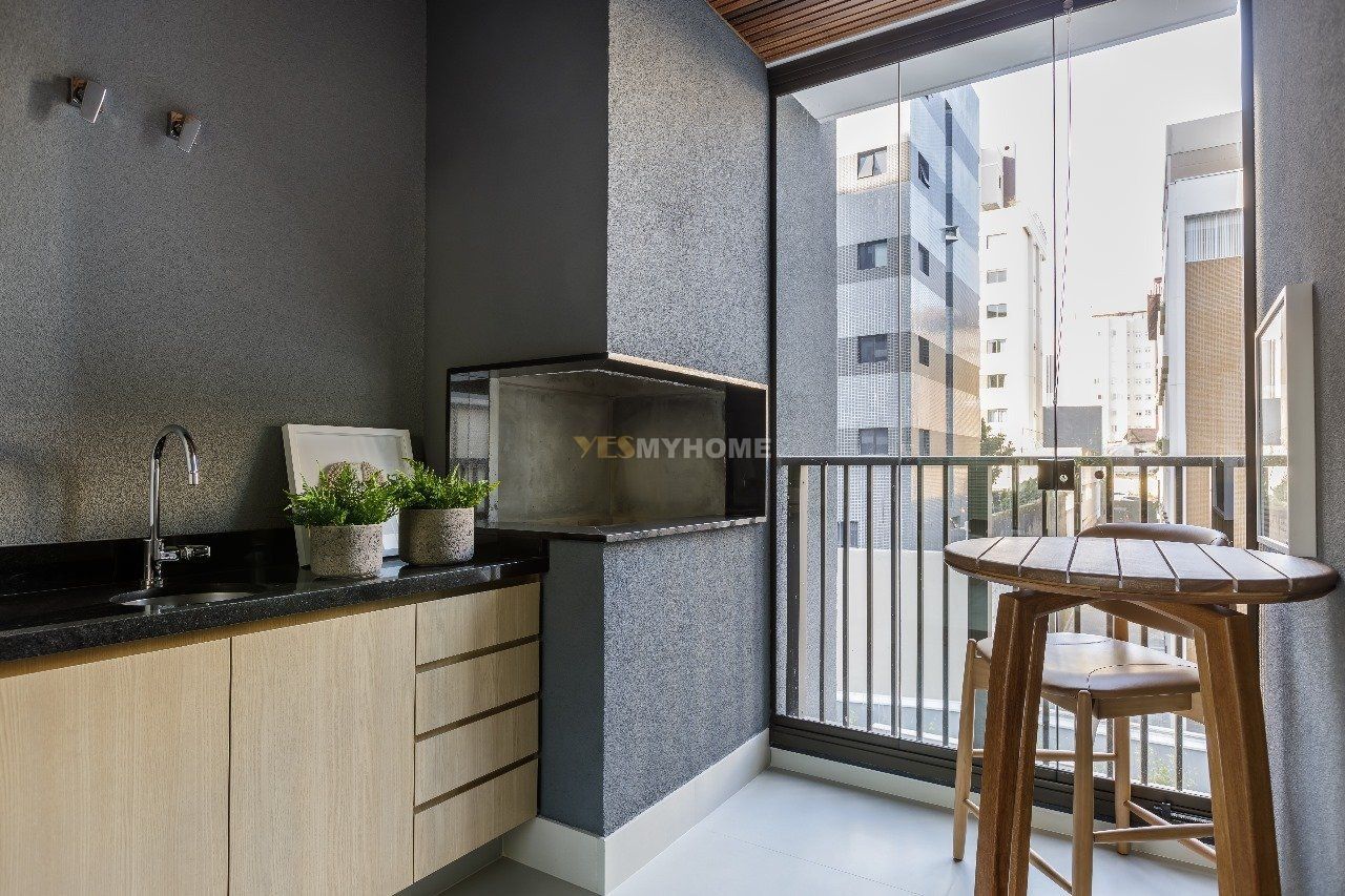Sacadas com churrasqueira a carvão, perfeitas para momentos de lazer.