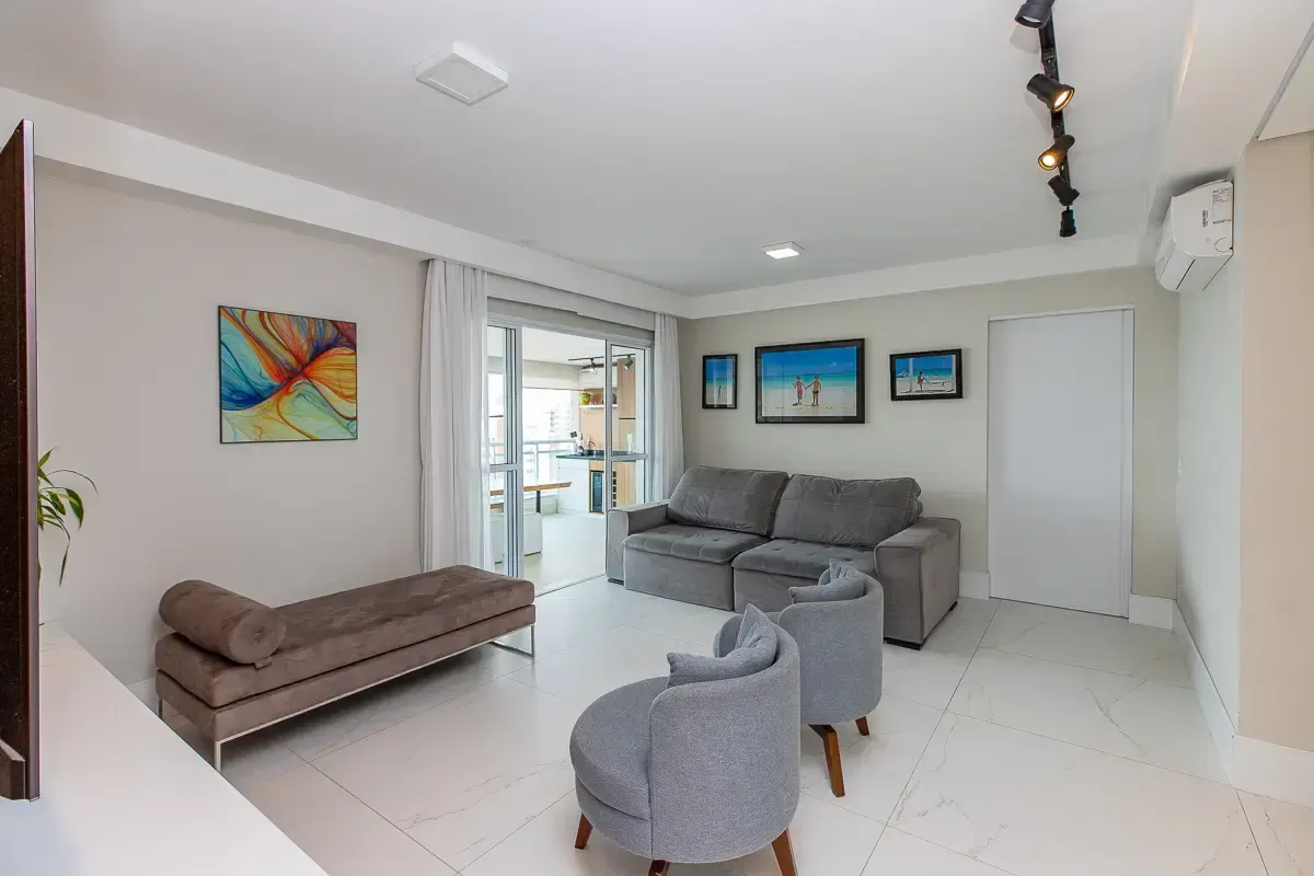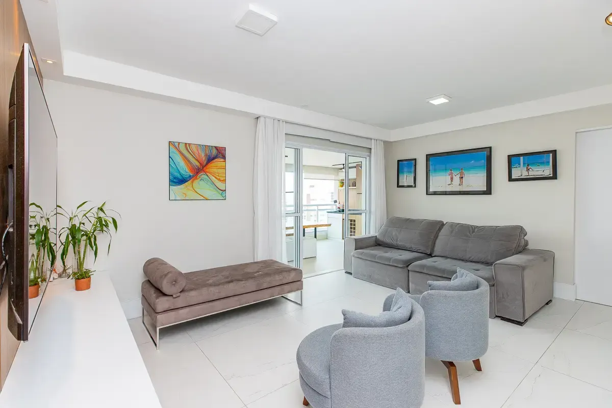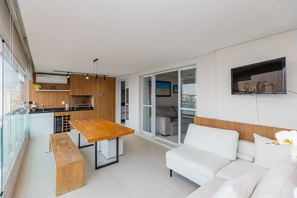 Características do imóvel: Área útil de 151m², 3 suítes espaçosas, garantindo privacidade e conforto, 5 banheiros bem distribuídos, incluindo lavabo e banheiro de serviço, 3 vagas determinadas de garagem, Ambientes planejados com móveis sob medida, piso de madeira e porcelanato, Living amplo, integrado ao home theater e home office, Varanda gourmet com churrasqueira, ideal para receber convidados, Cozinha funcional com despensa e área de serviço completa, Aquecimento de água em todo o apartamento