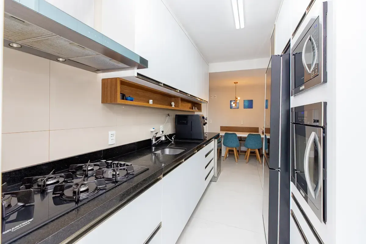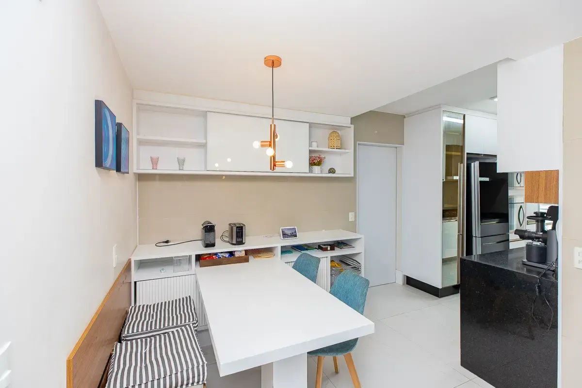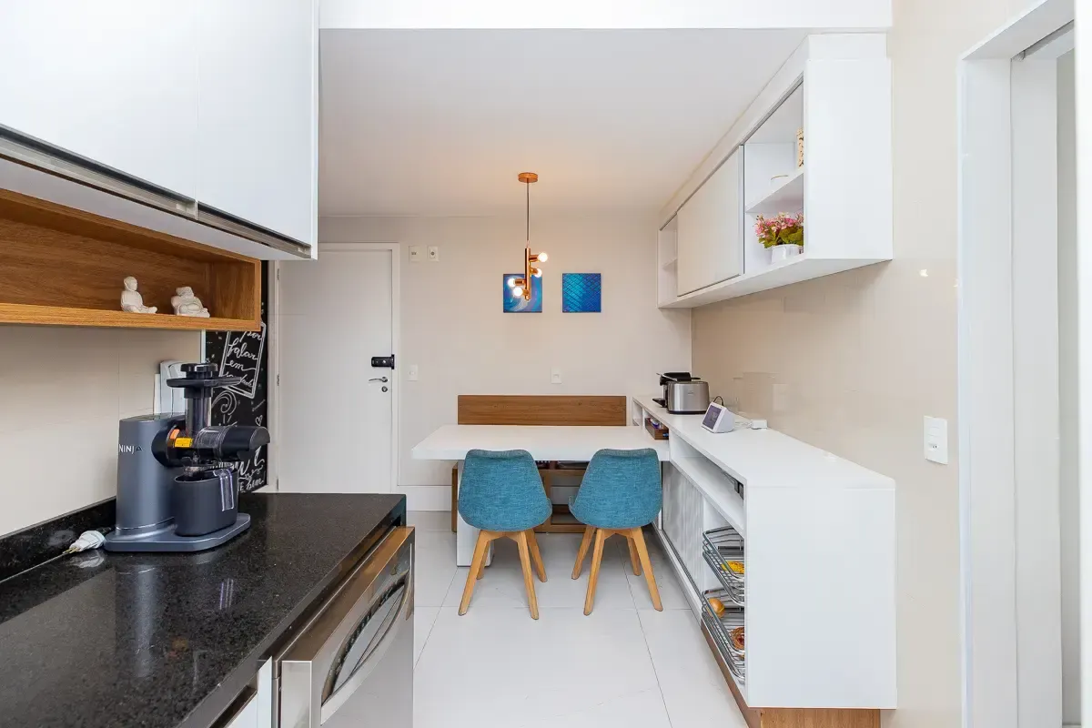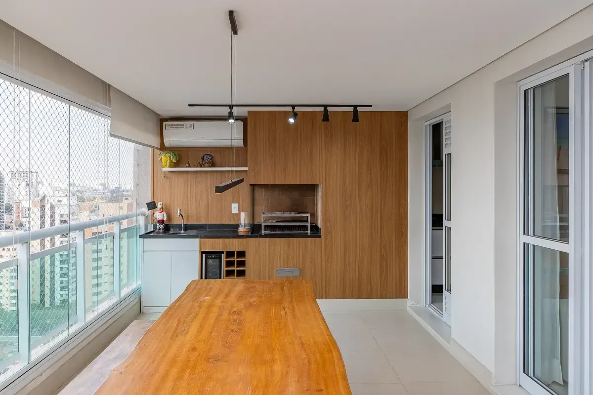 Características do imóvel: Área útil de 151m², 3 suítes espaçosas, garantindo privacidade e conforto, 5 banheiros bem distribuídos, incluindo lavabo e banheiro de serviço, 3 vagas determinadas de garagem, Ambientes planejados com móveis sob medida, piso de madeira e porcelanato, Living amplo, integrado ao home theater e home office, Varanda gourmet com churrasqueira, ideal para receber convidados, Cozinha funcional com despensa e área de serviço completa, Aquecimento de água em todo o apartamento