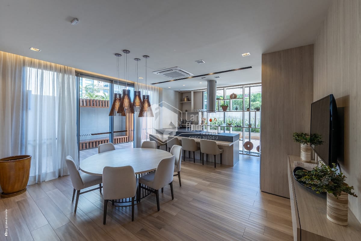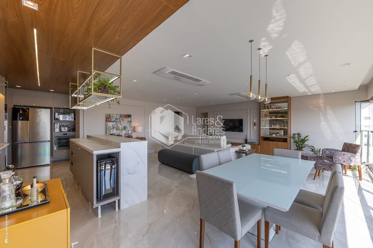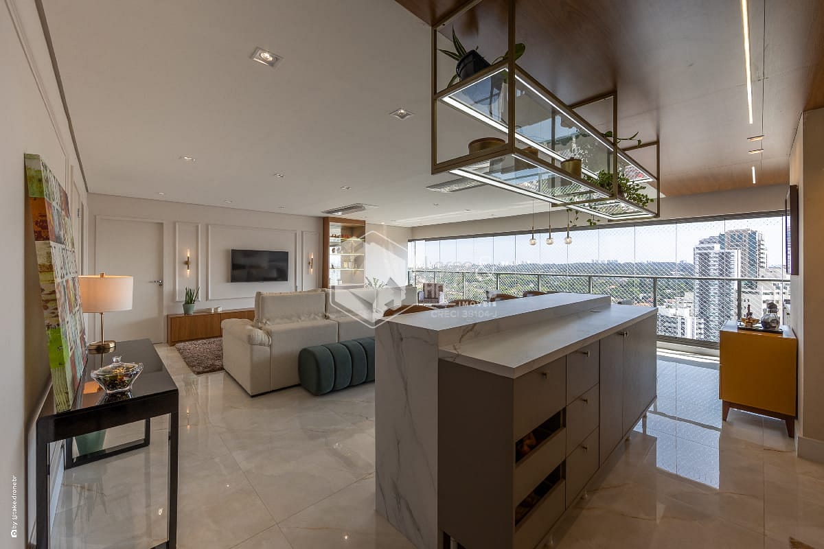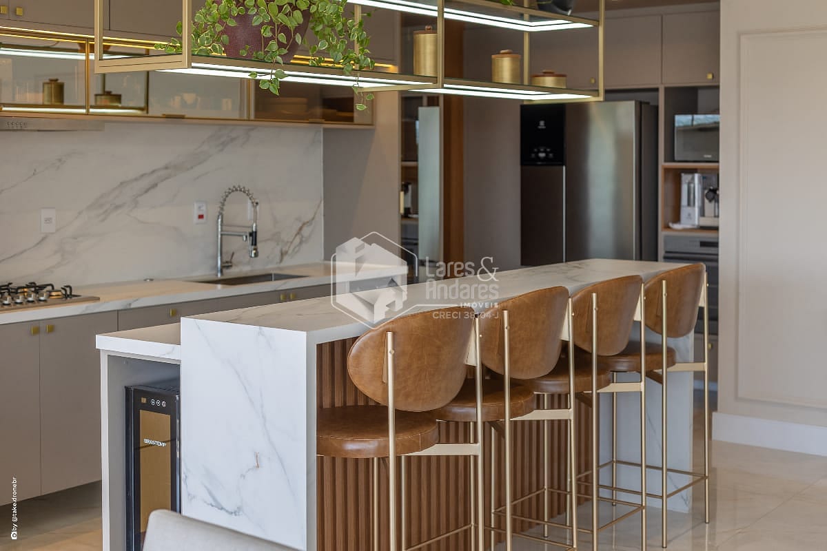 A cozinha americana, totalmente reformada, segue um conceito contemporâneo com linhas limpas e materiais de alto padrão. Ela se conecta naturalmente à área social, tornando o ambiente prático e convidativo. Os eletrodomésticos premium já instalados agregam funcionalidade imediata, facilitando a rotina e garantindo um toque a mais de requinte. O lavabo, projetado com acabamentos sofisticados, complementa o living com elegância e é ideal para receber convidados.
