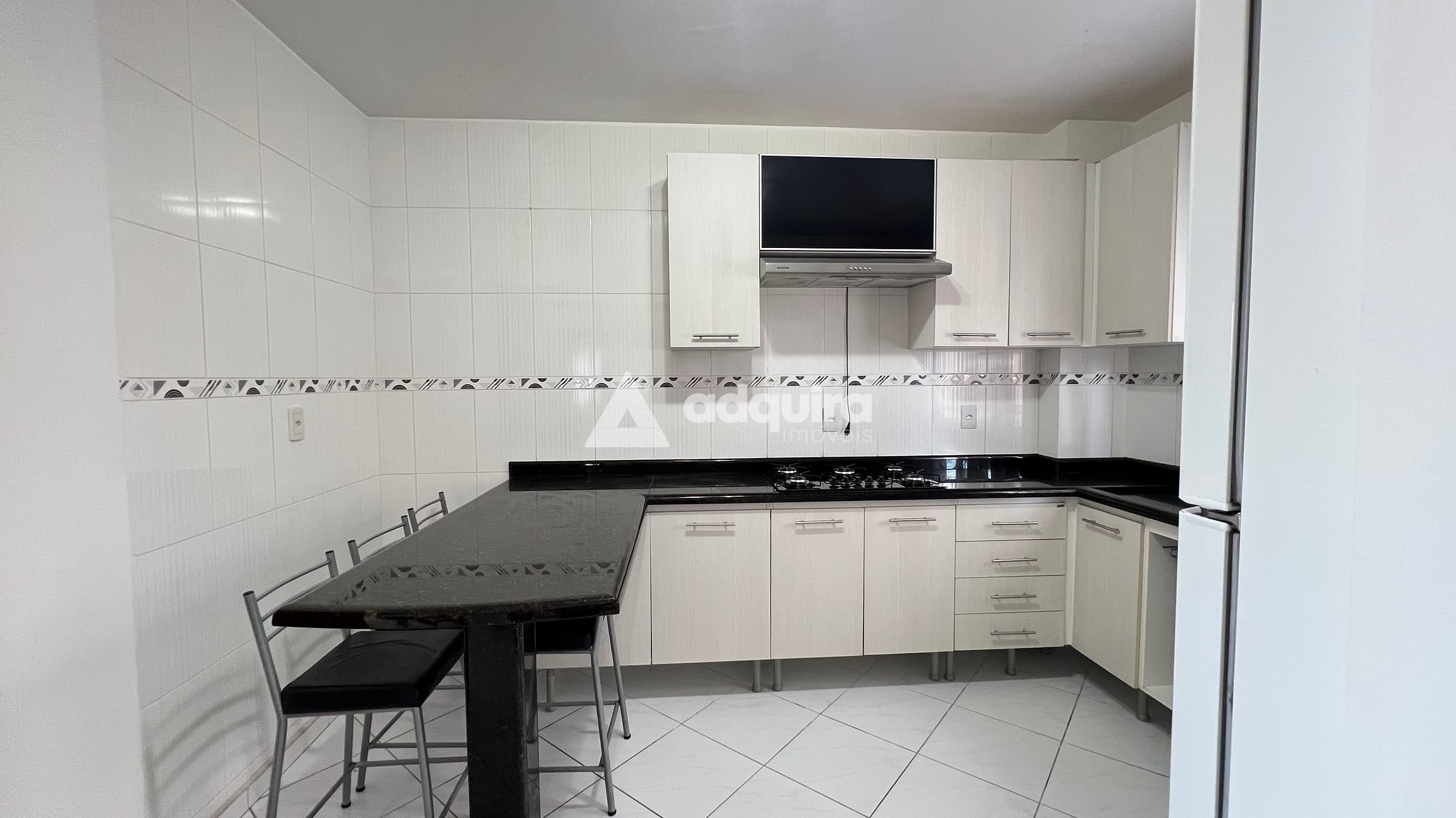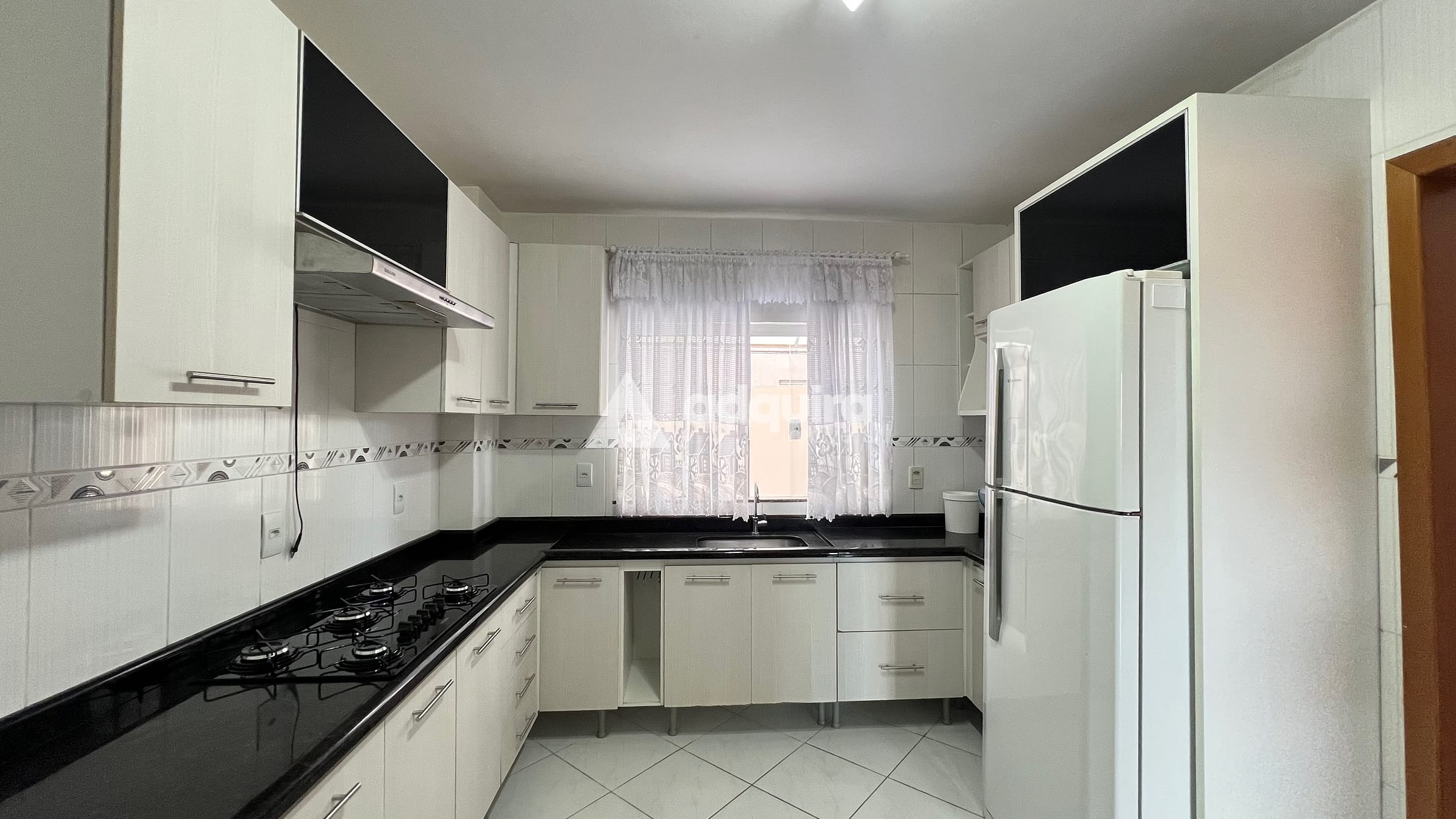 Cozinha com armários planejados, geladeira e cooktop