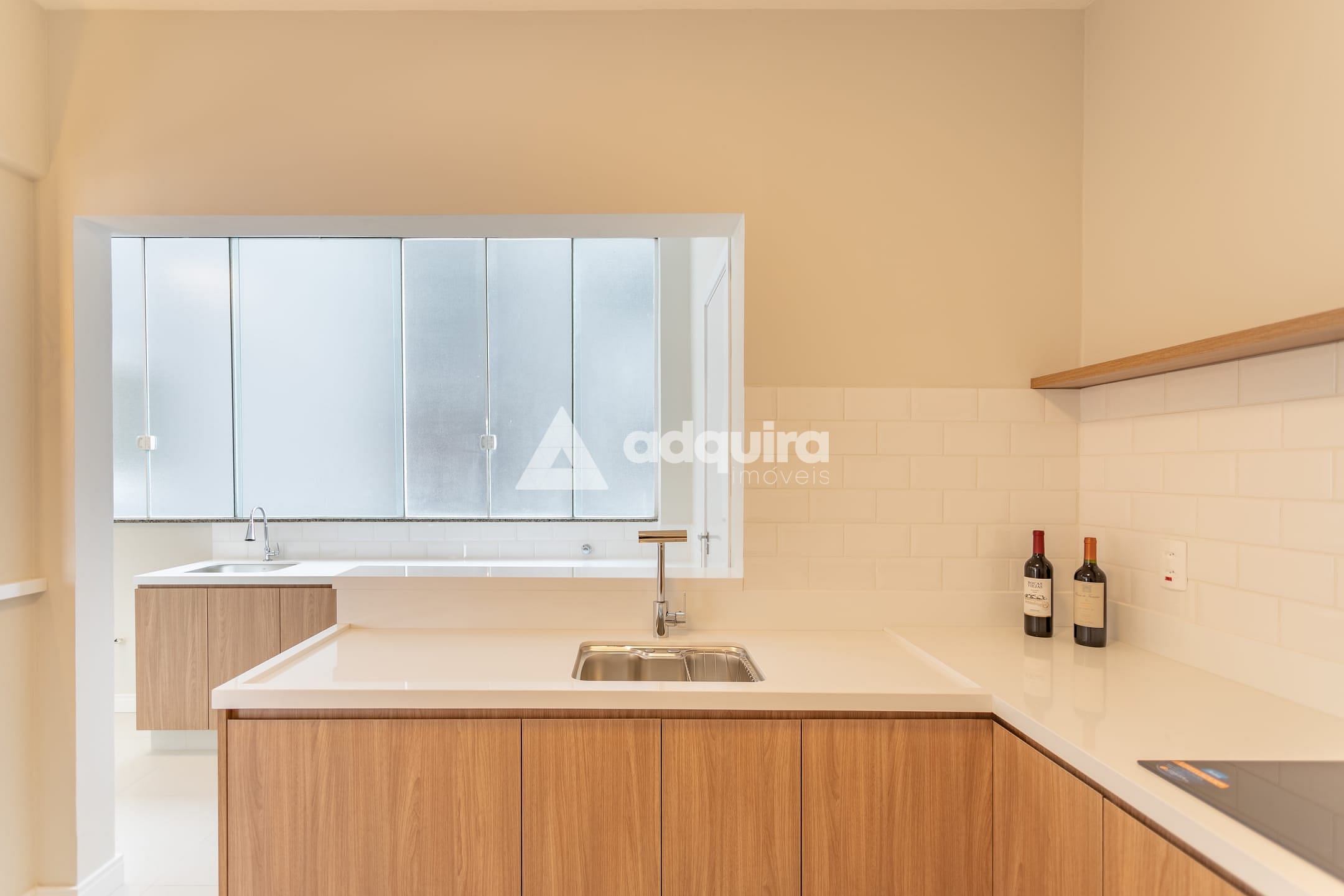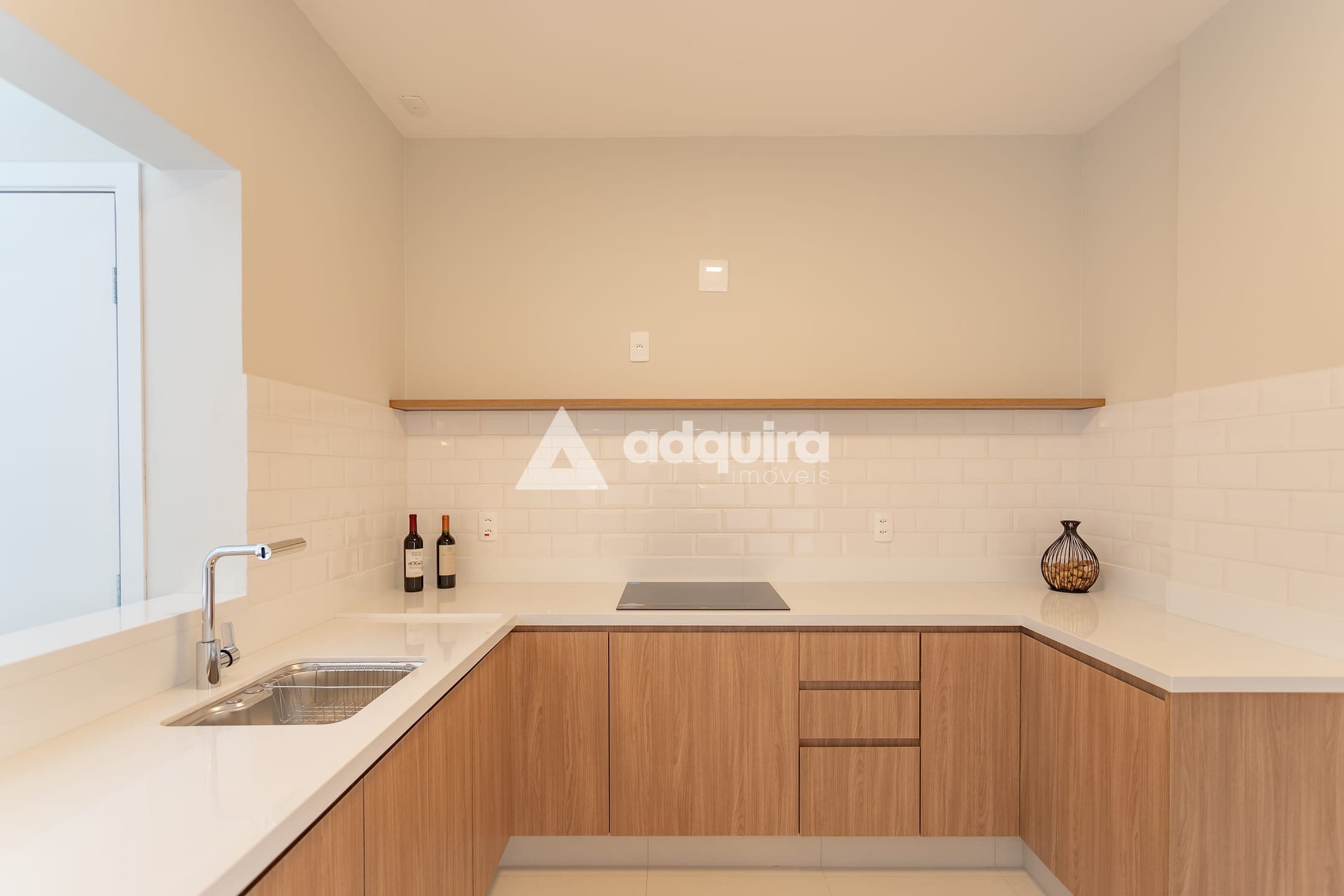 Cozinha planejada com bancada, cooktop a indução já instalado, e infraestrutura para máquina de lavar louça.