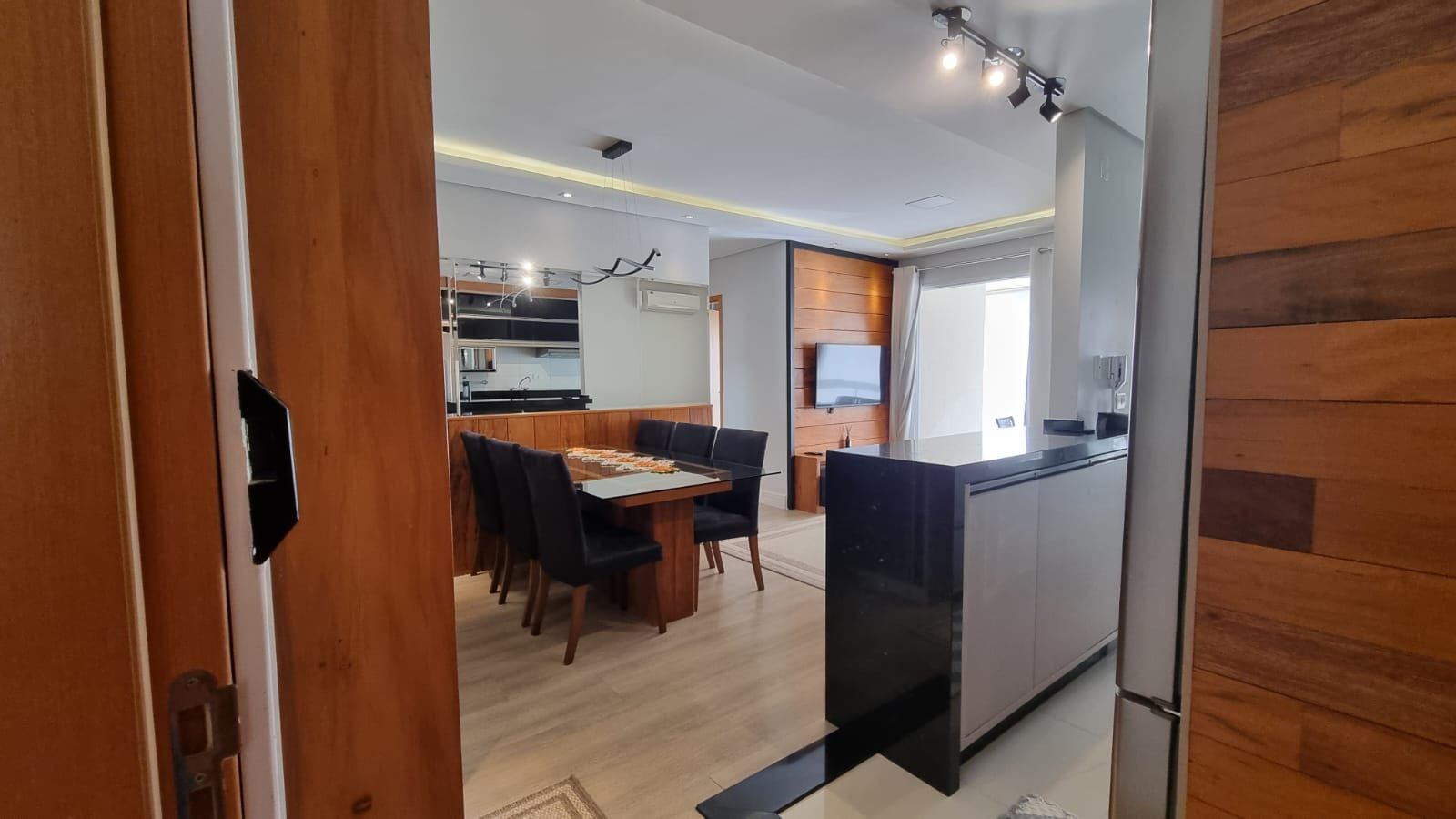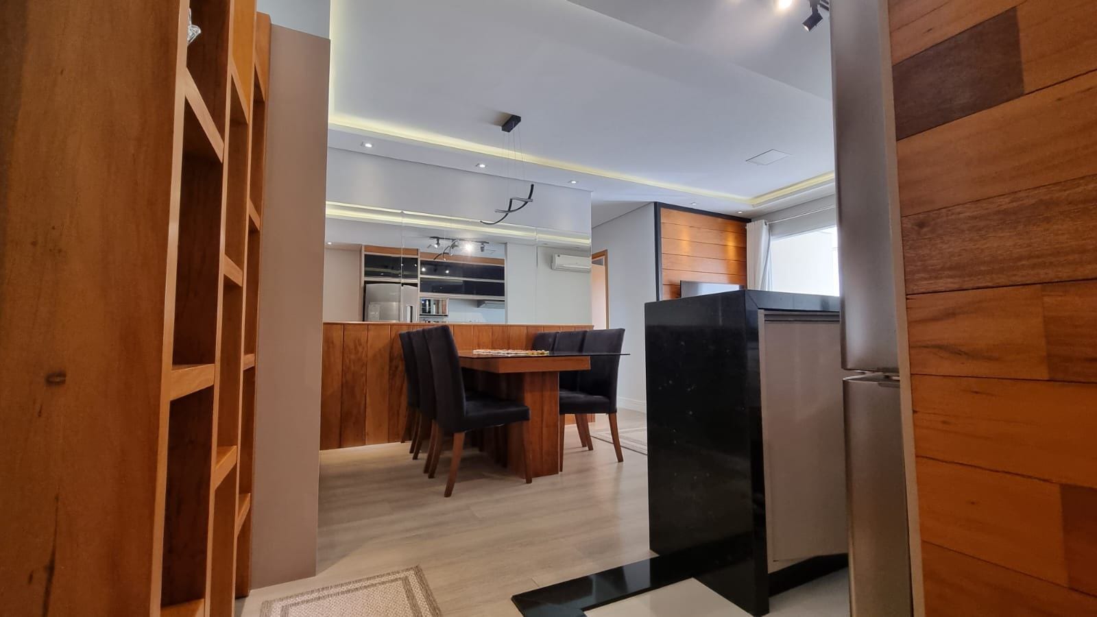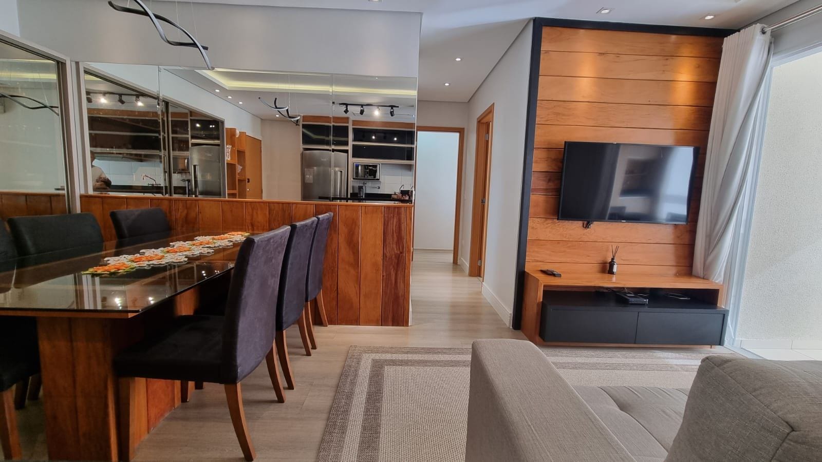 Cada detalhe foi pensado estrategicamente: revestimento em espelho que expande visualmente, paleta neutra sofisticada, granito preto polido na cozinha com eletrodomésticos em inox. Painel de madeira nobre na tv, iluminação linear e cortinas brancas que trazem harmonia aos ambientes.