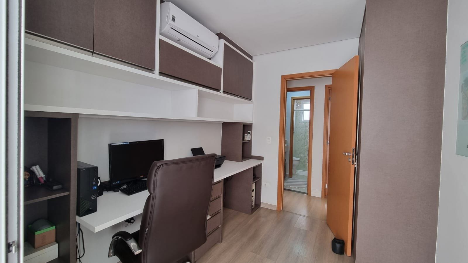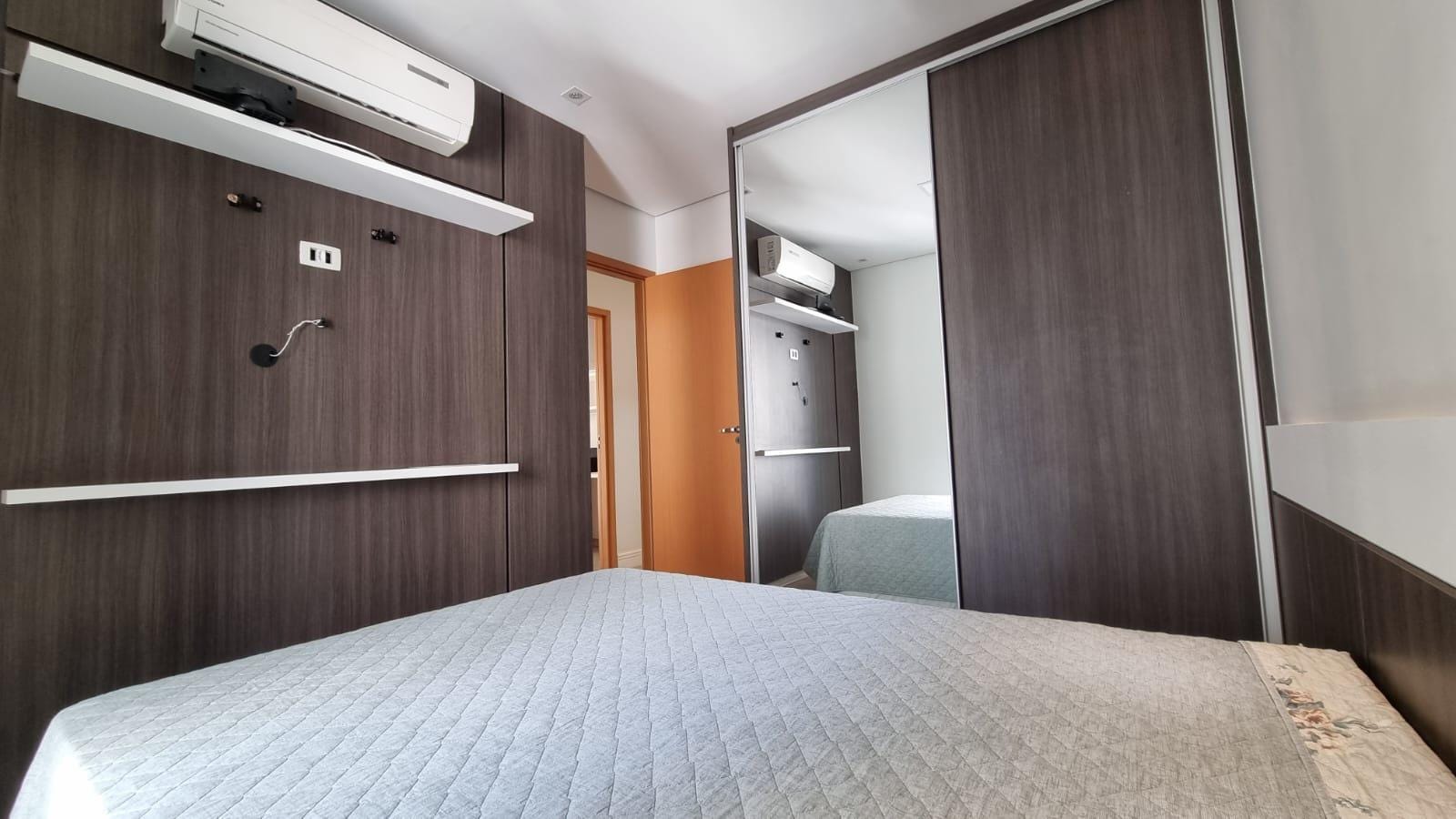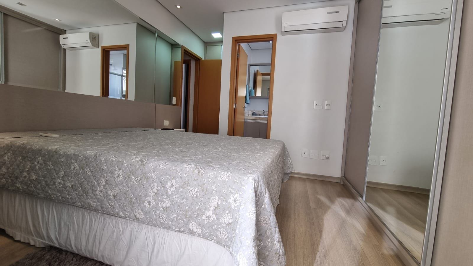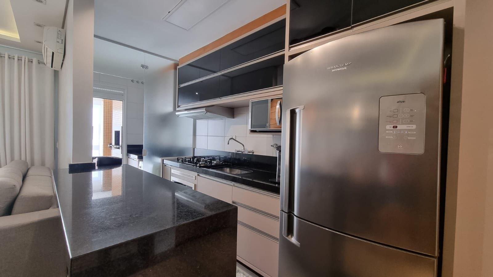 Cada detalhe foi pensado estrategicamente: revestimento em espelho que expande visualmente, paleta neutra sofisticada, granito preto polido na cozinha com eletrodomésticos em inox. Painel de madeira nobre na tv, iluminação linear e cortinas brancas que trazem harmonia aos ambientes.