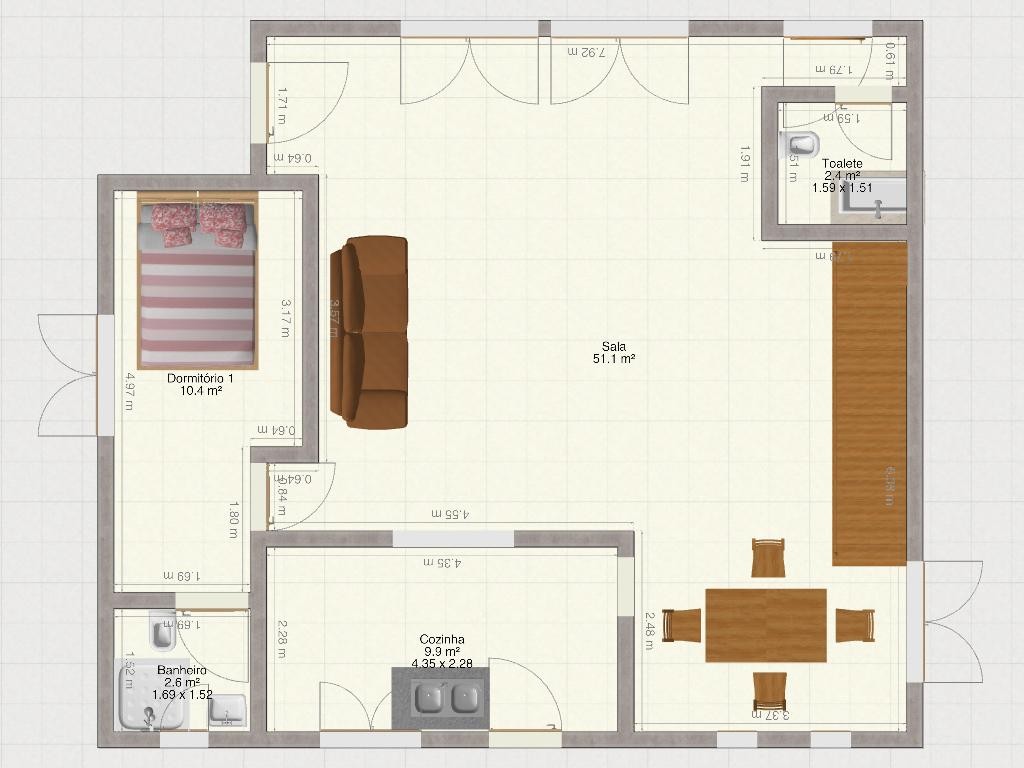 O imóvel é composto, no pavimento térreo, por ampla sala de estar e jantar com 51,1 m², cozinha, 01 suíte, lavabo e banheiro social.