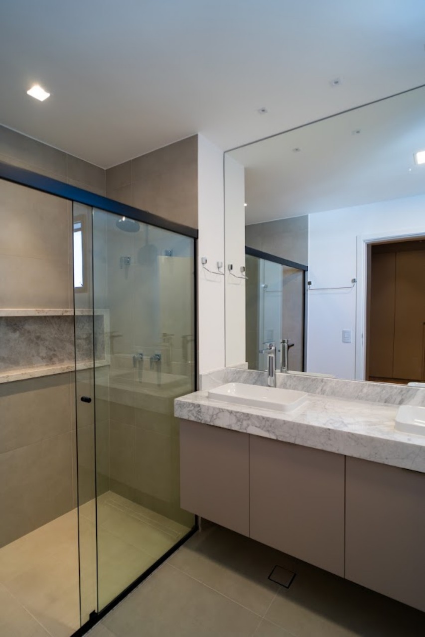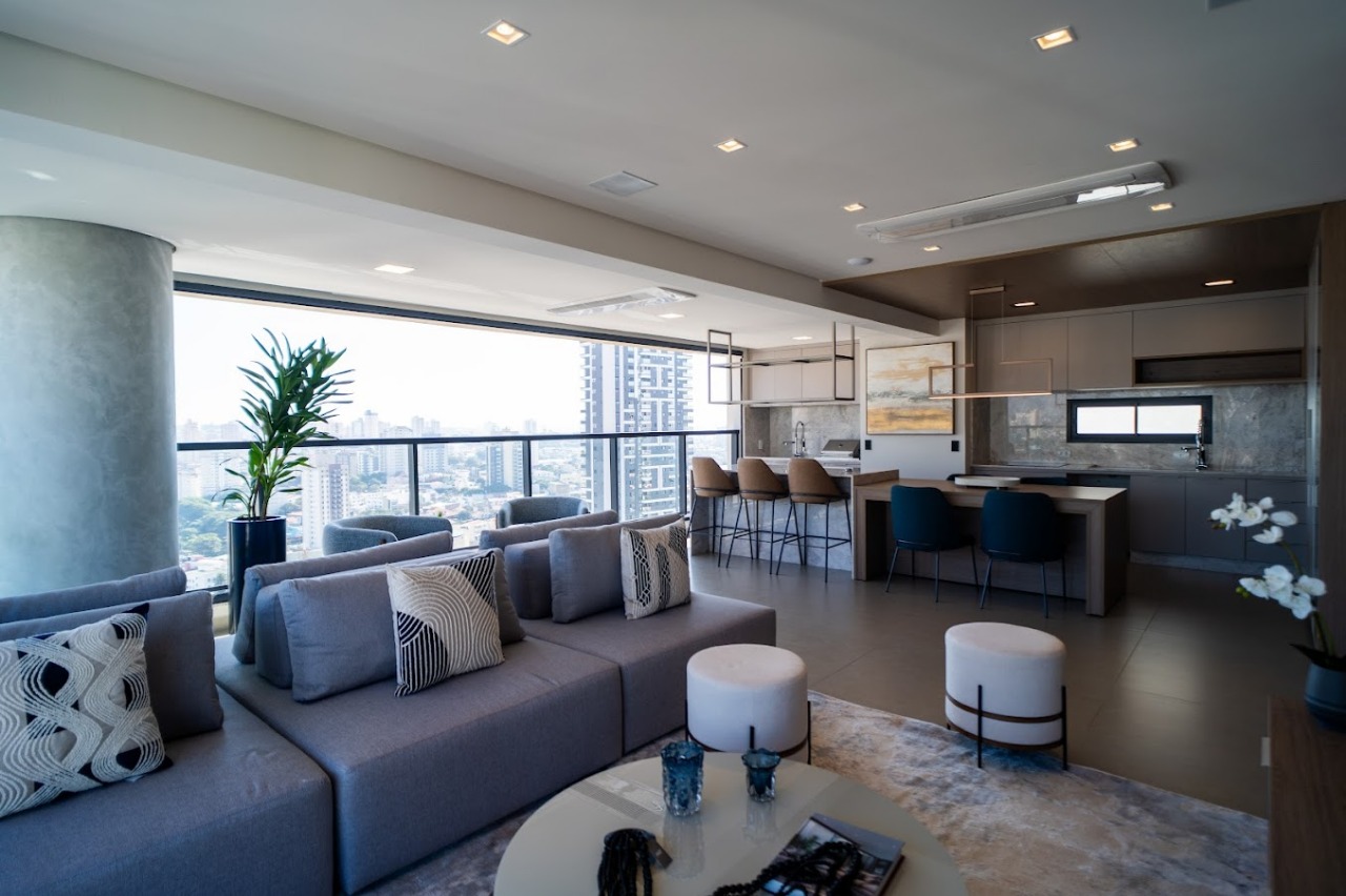 Apartamento com sala ampla, cozinha, espaço gourmet, 3 suítes, 4 banheiros, lavanderia e 3 vagas de garagem.