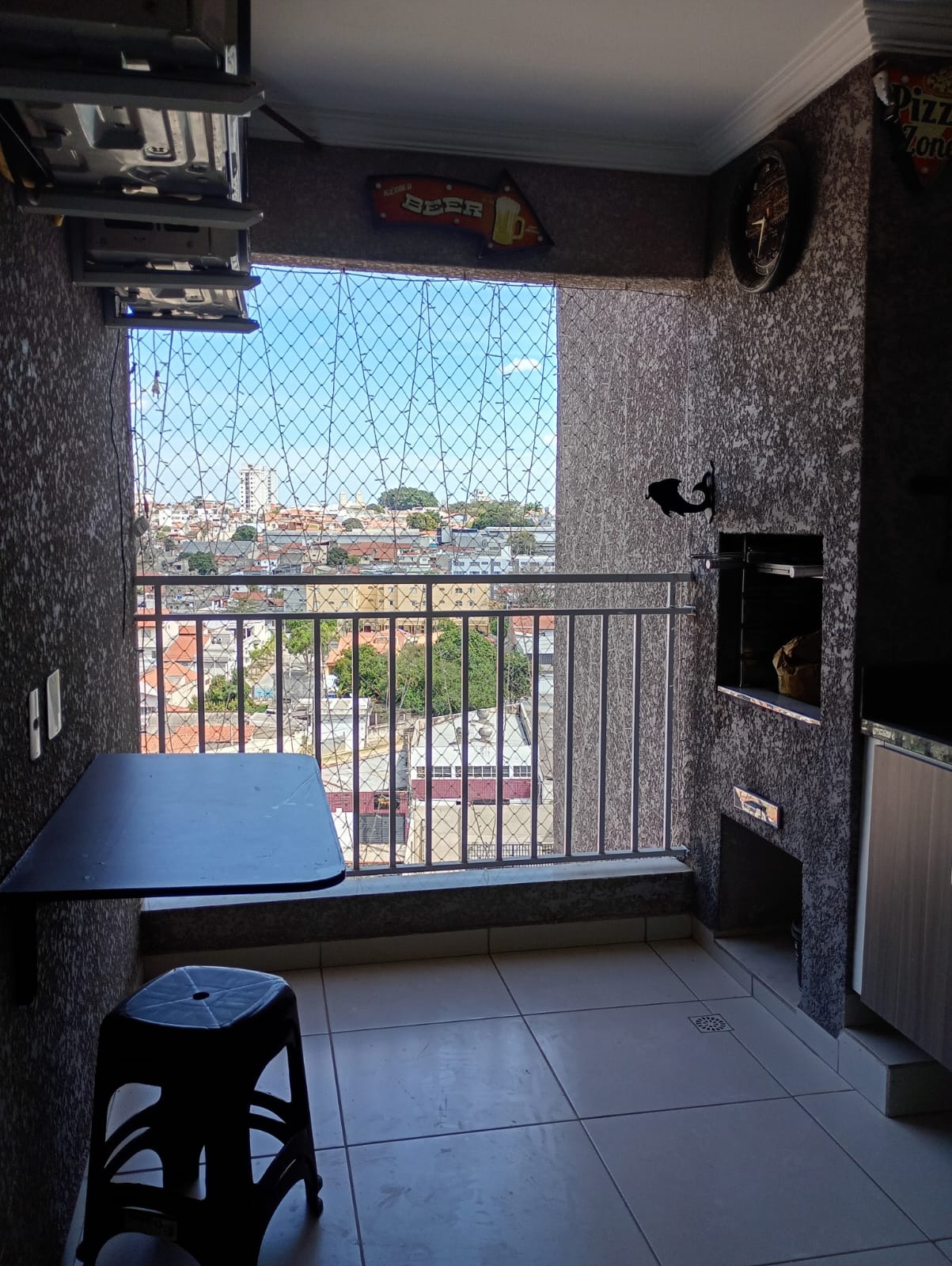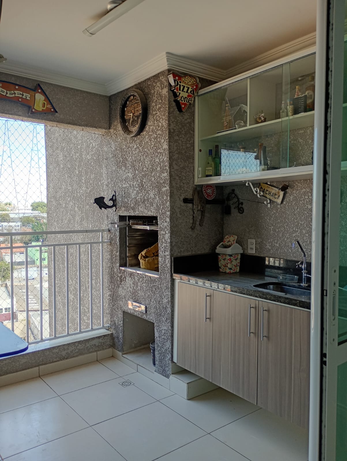 Sacada gourmet, churrasqueira carvão, armário e pia