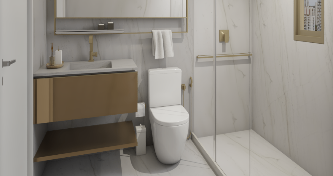 Banheiros: Elegantes, com acabamento de primeira linha e box blindex.