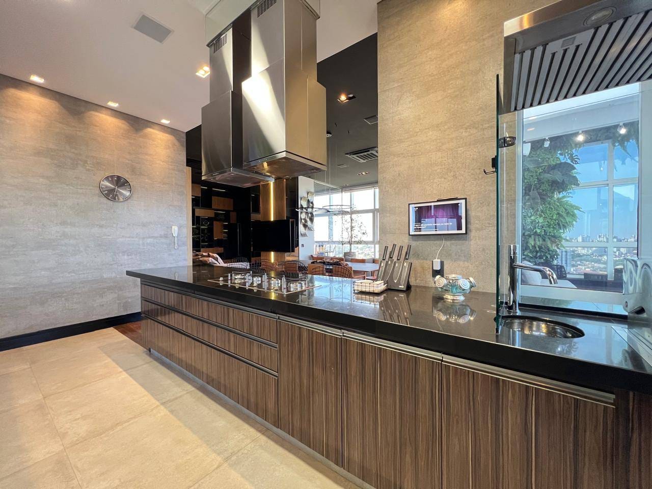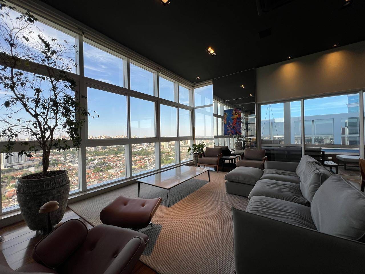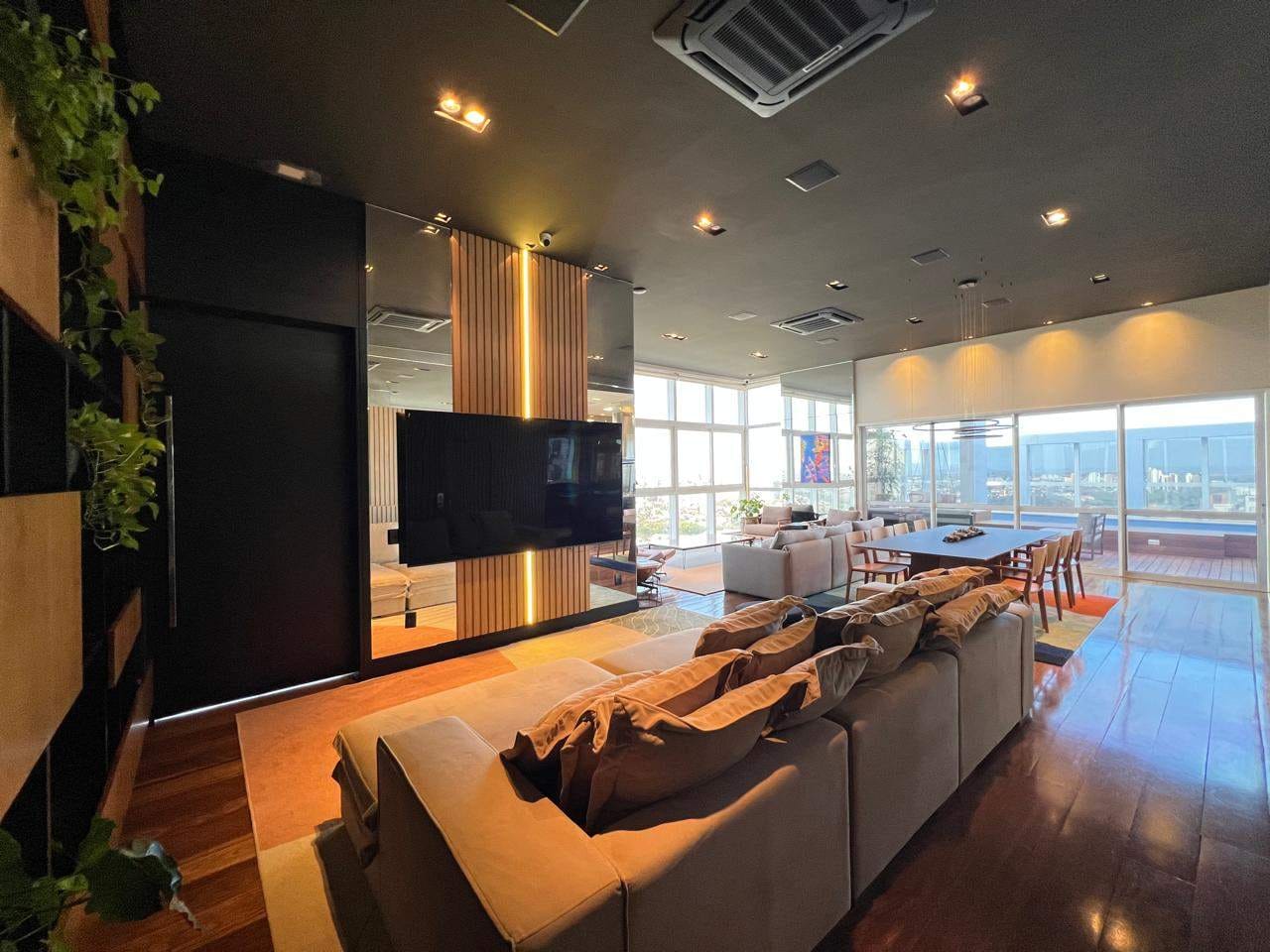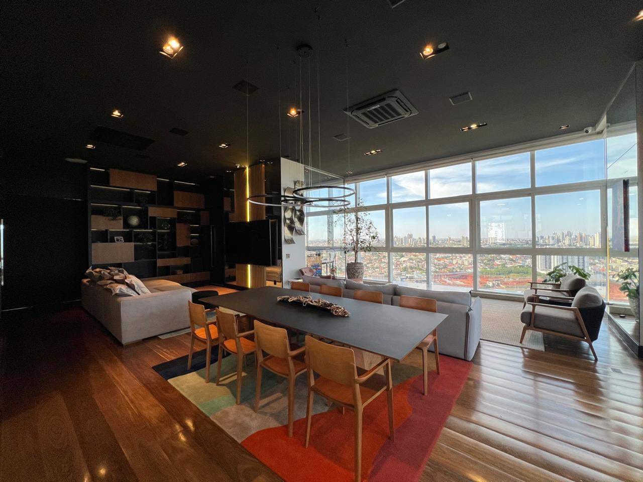 O apartamento ainda conta com escritório, sala de estar e jantar integradas, além de uma sala mirante um espaço único, com sofá voltado para a paisagem urbana de Londrina, ideal para contemplar o pôr do sol.