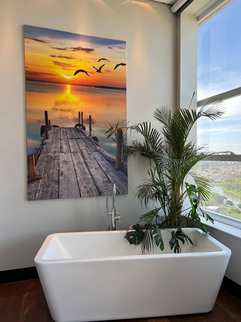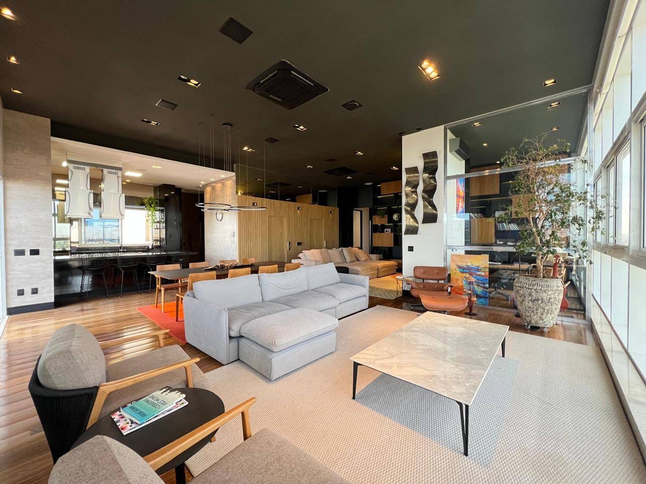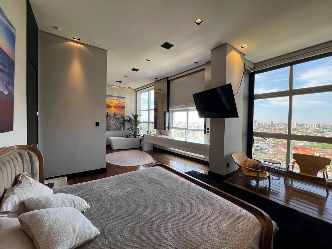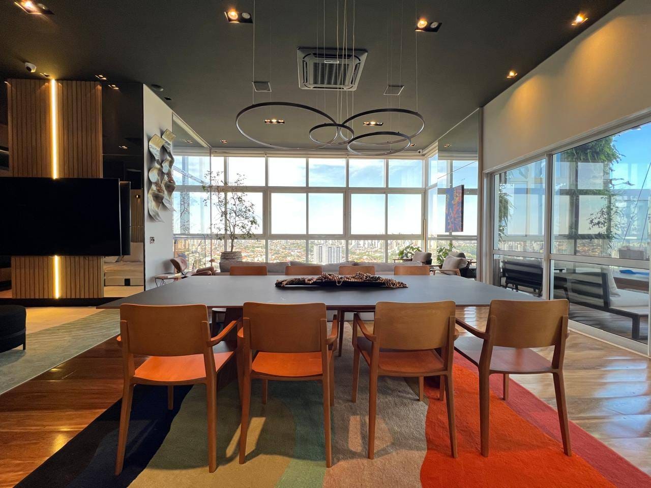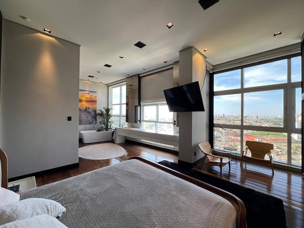 O apartamento ainda conta com escritório, sala de estar e jantar integradas, além de uma sala mirante um espaço único, com sofá voltado para a paisagem urbana de Londrina, ideal para contemplar o pôr do sol.