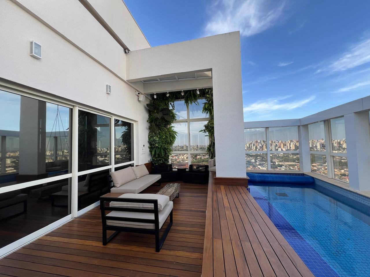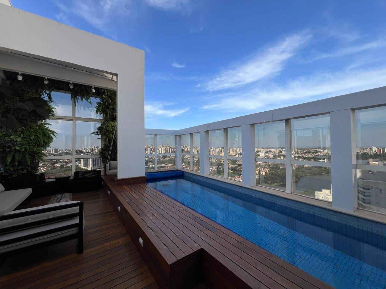 No espaço externo, uma piscina com deck convida ao lazer e à tranquilidade nas alturas.
