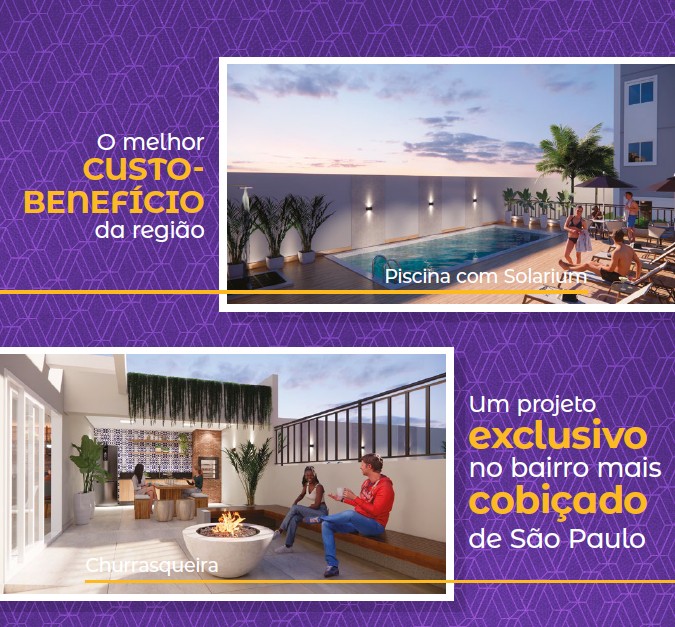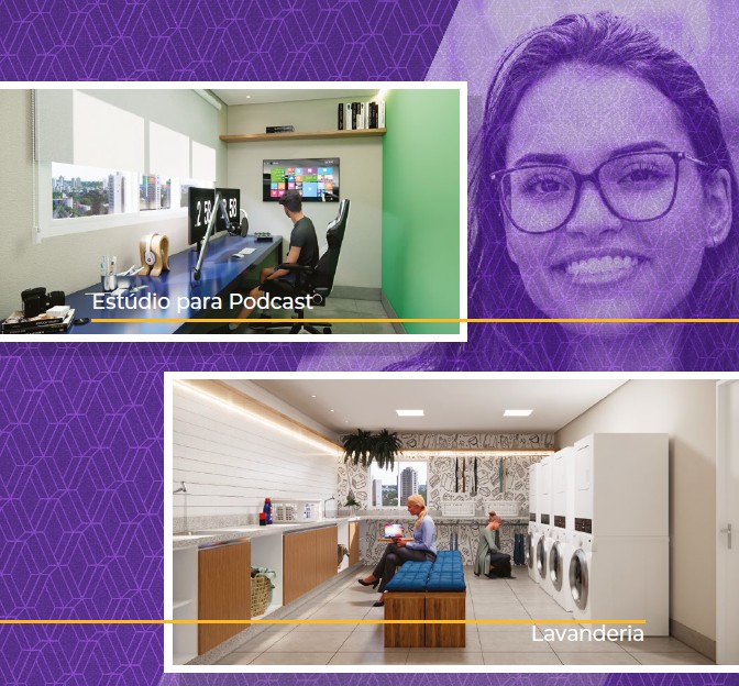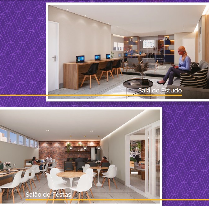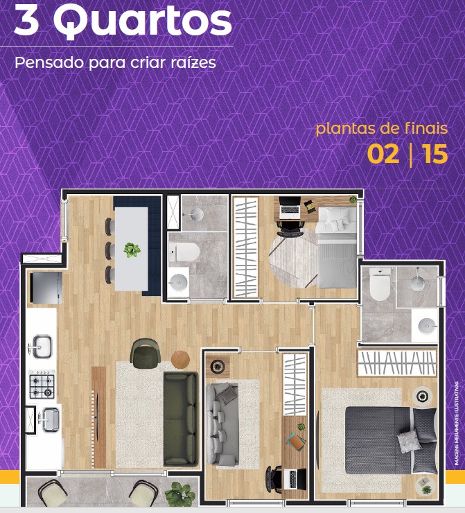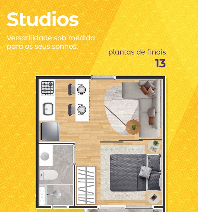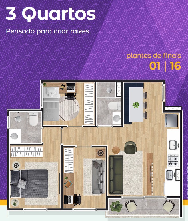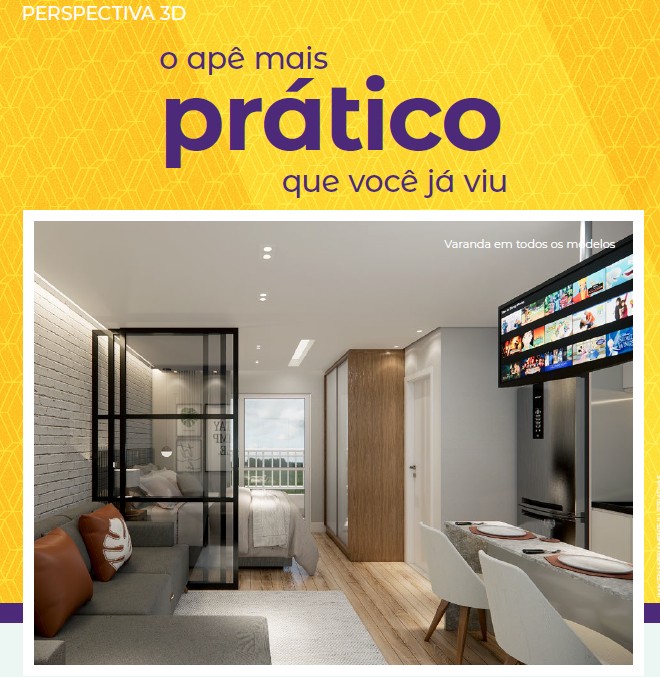 Apartamentos 1 e 2 dormitórios com varanda e plantas inteligentes que privilegiam luz, ventilação e integração dos ambientes.