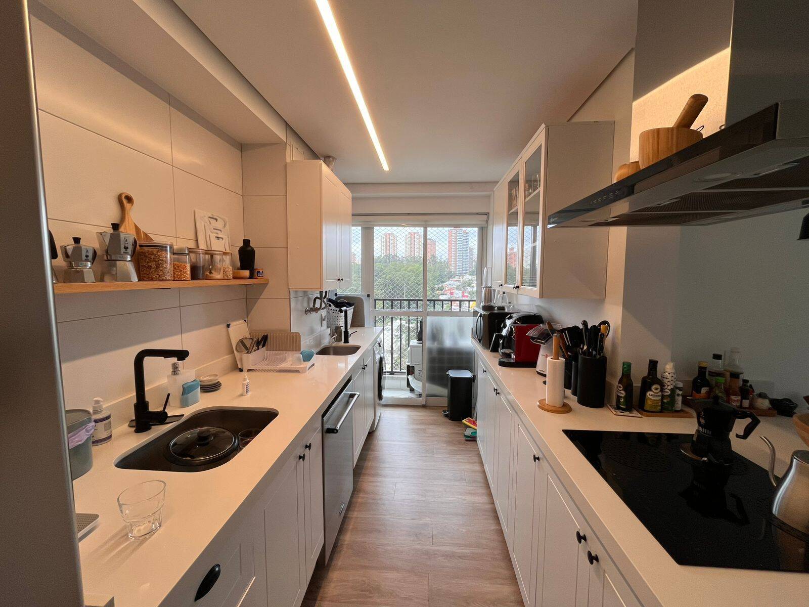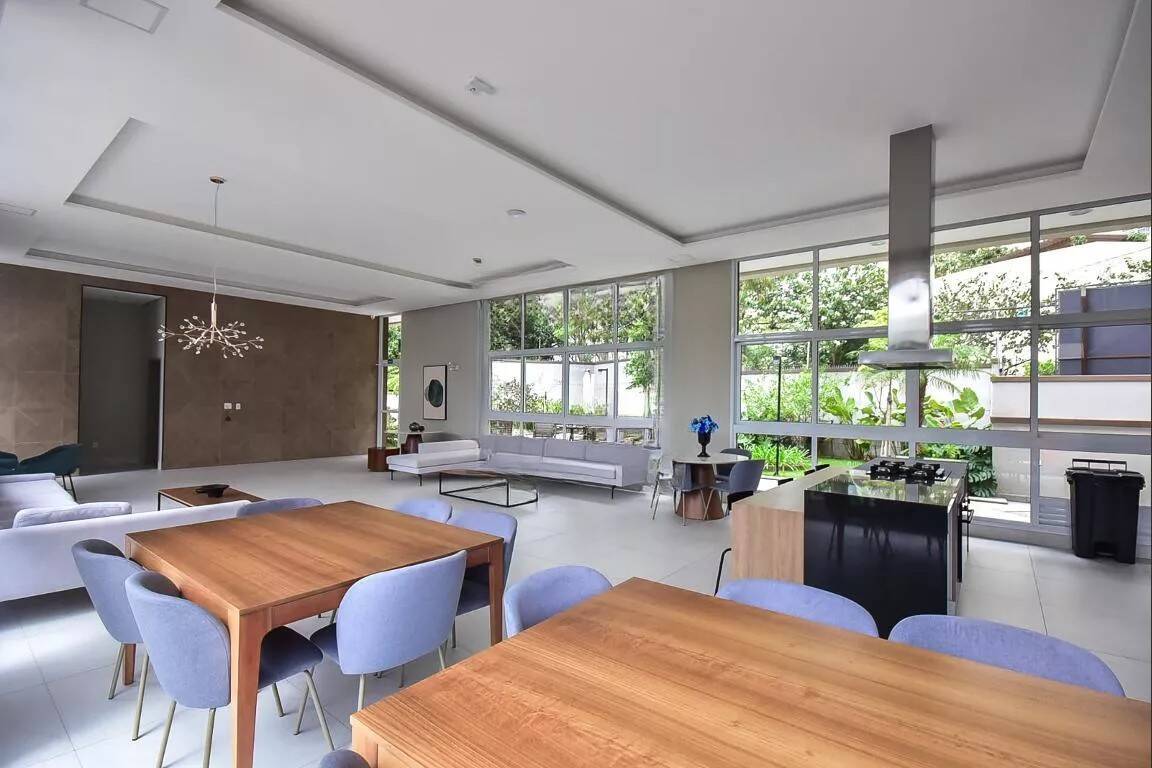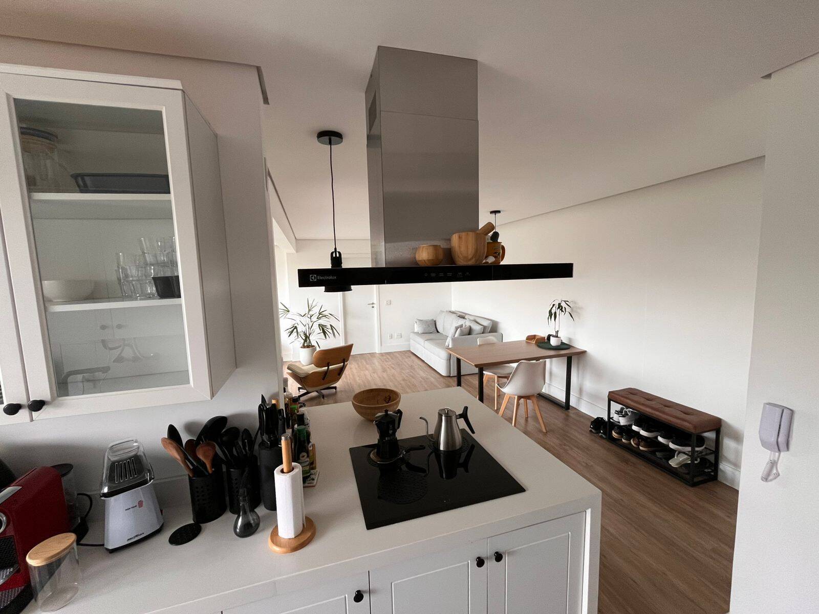 A cozinha americana integra-se à sala e à área de serviço, equipada com planejados, ilha central com cooktop e coifa, além de lava-louças. Solução prática para quem valoriza rotina funcional sem abrir mão de convivência.