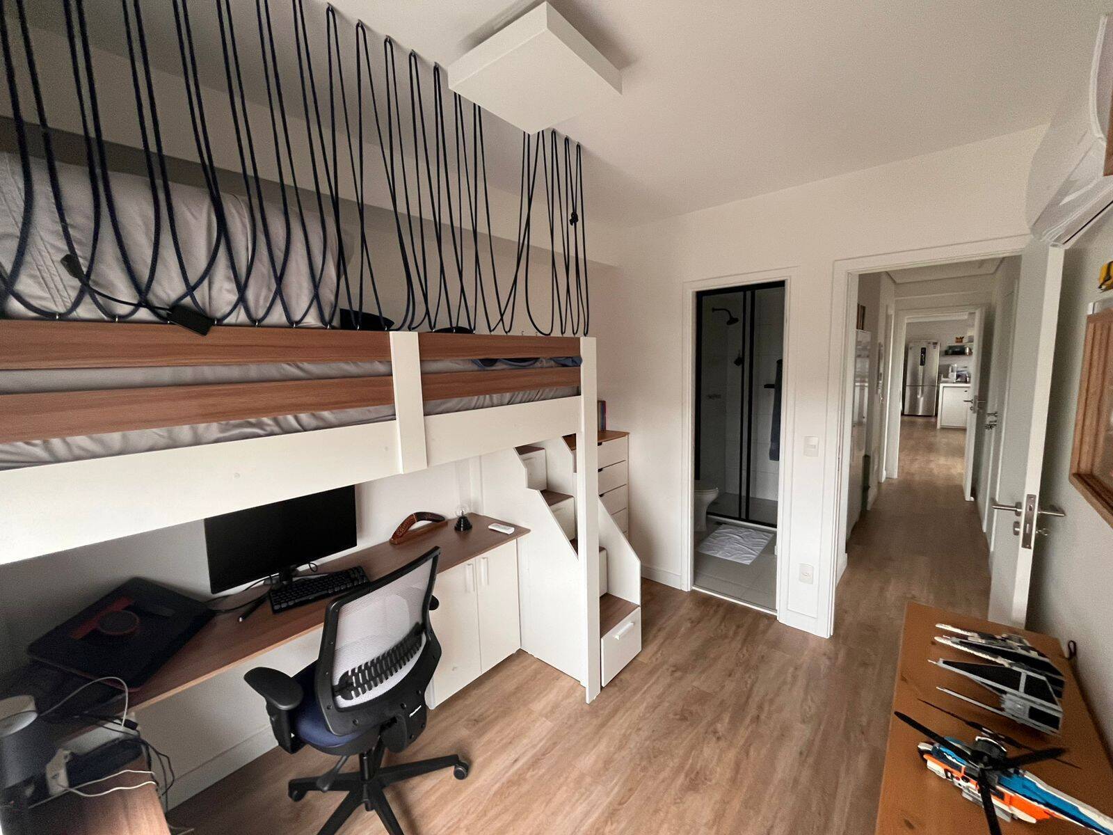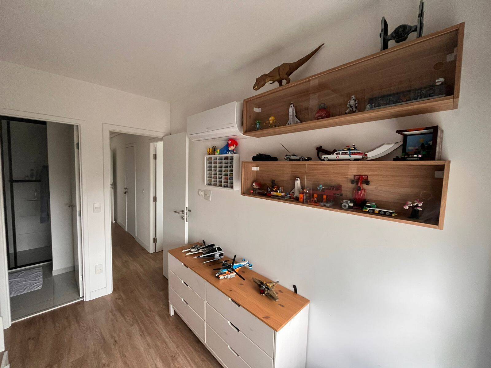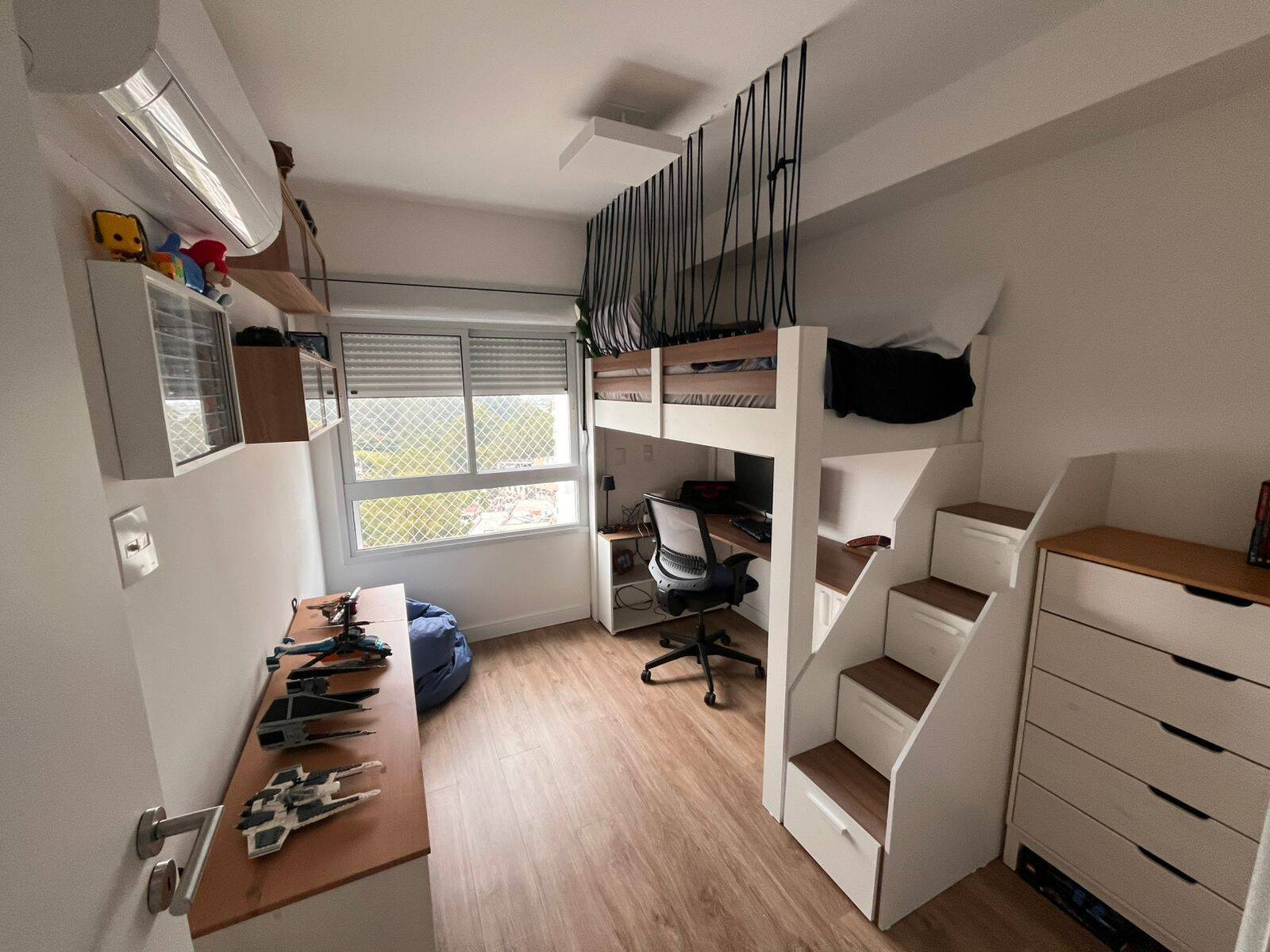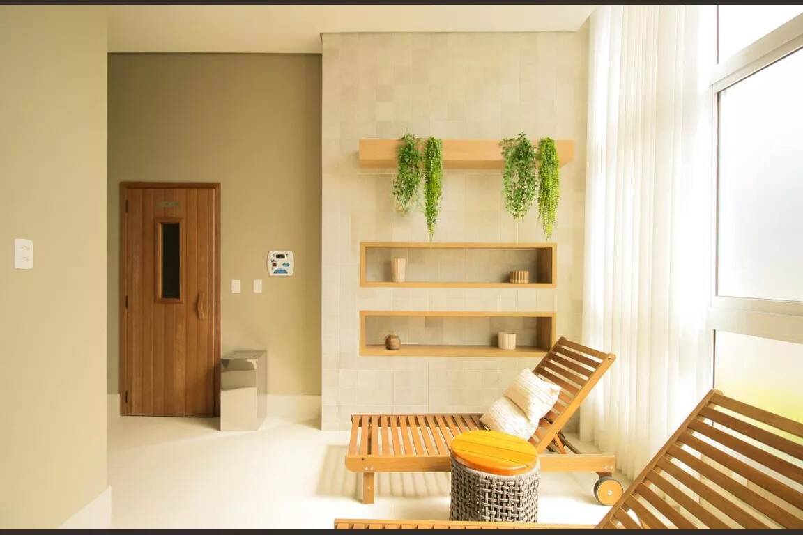 A planta prioriza integração e fluidez. A varanda gourmet envidraçada com churrasqueira amplia a área social e cria um ambiente versátil para receber ou para o uso cotidiano da família. A sala comporta dois ambientes com conforto e conta com ar-condicionado já instalado.