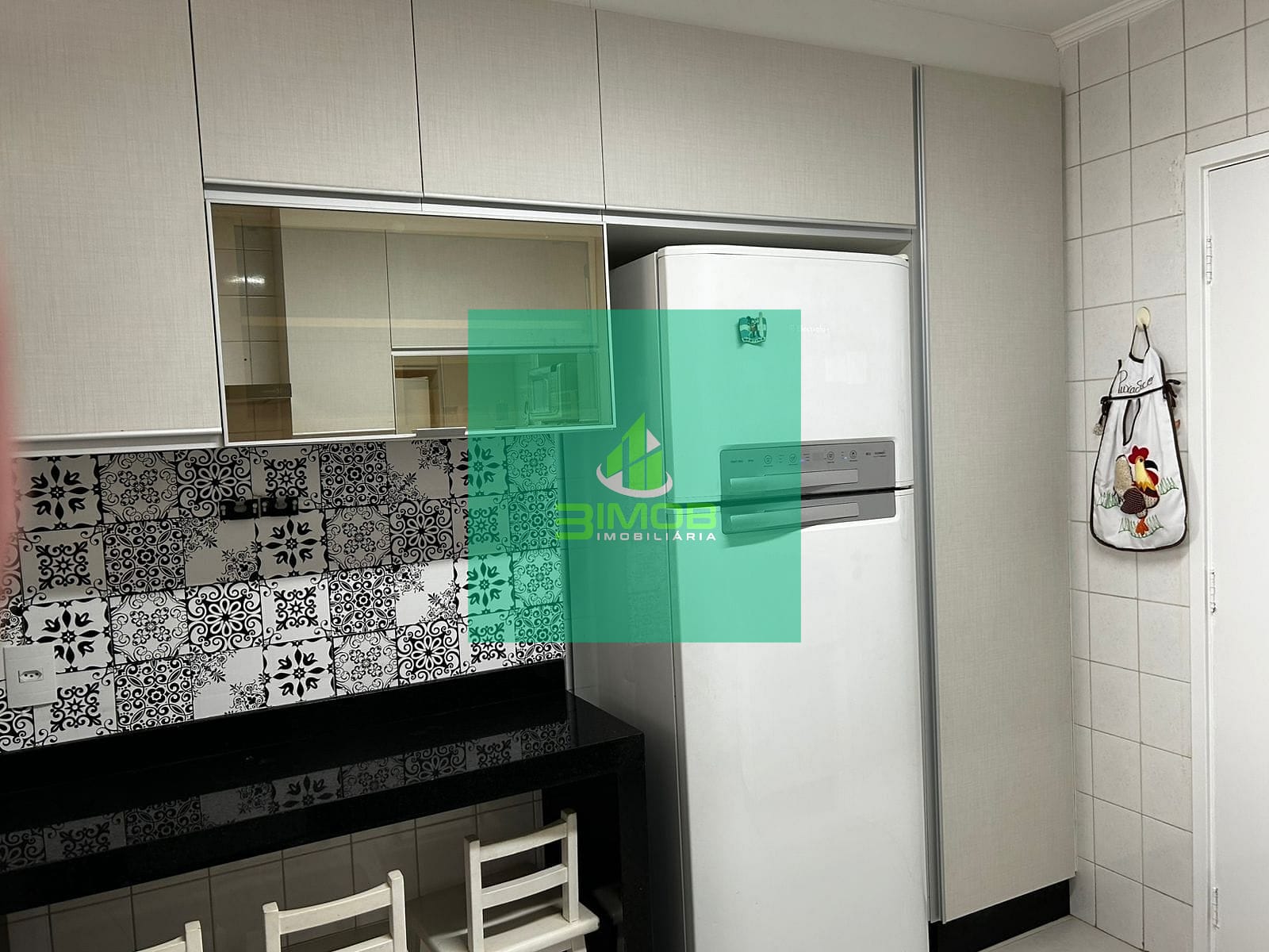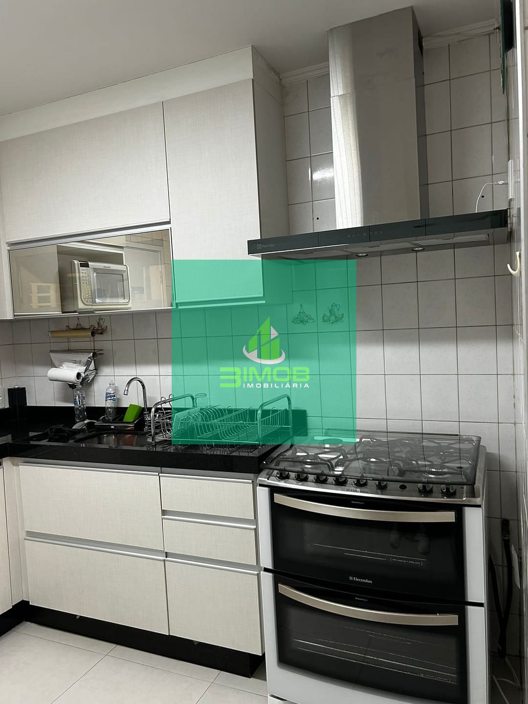 Cozinha planejada com armários, fogão, coifa, microondas e geladeira