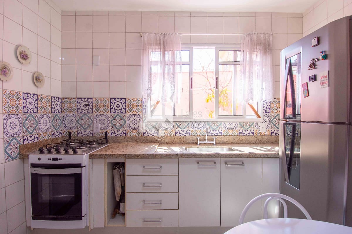 Pavimento térreo com sala ampla para dois ambientes, lavabo, cozinha com armários planejados e bancada de granito, área de serviços e quintal;