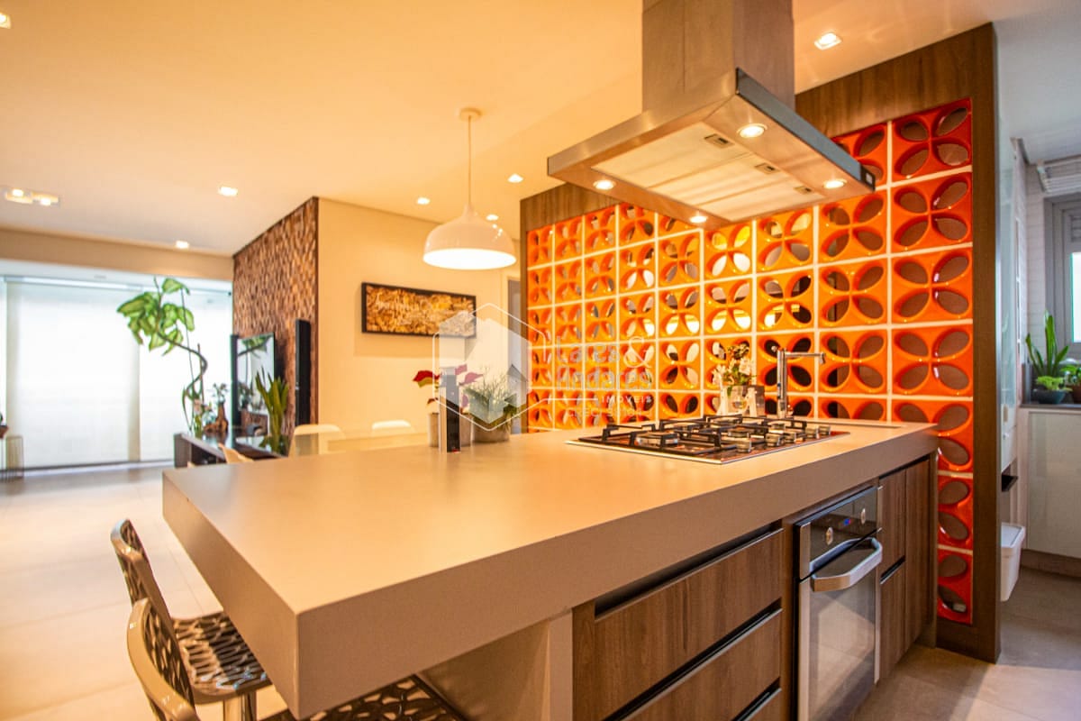 Cozinha americana integrada com os ambientes, equipada e com armários planejados.