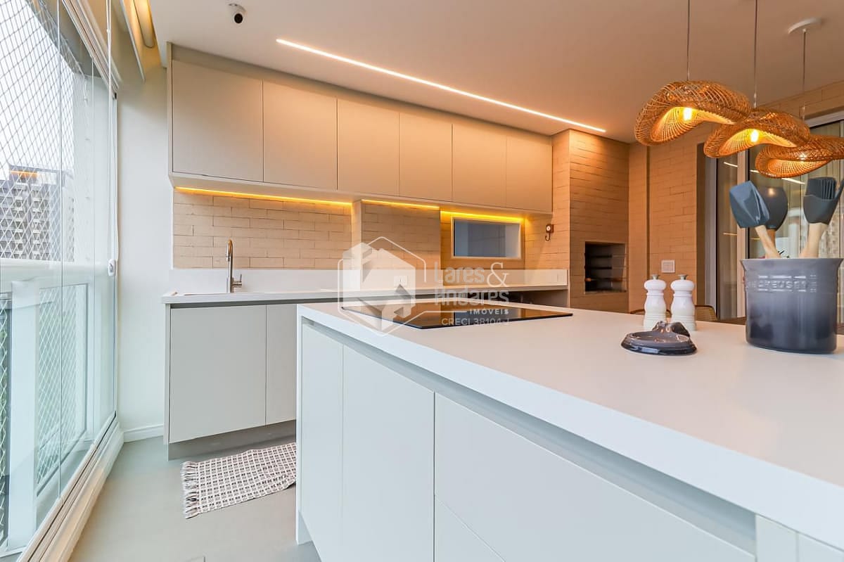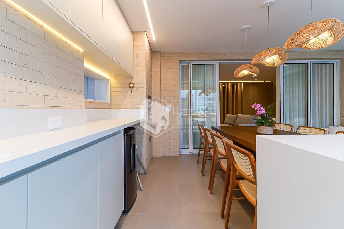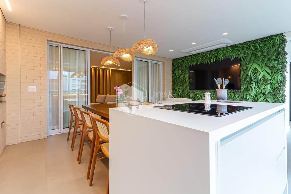 Na área social, a varanda gourmet é um verdadeiro convite ao convívio. Além da churrasqueira a carvão, ela conta com uma ilha gourmet equipada com cooktop de indução, perfeita para quem aprecia receber amigos e familiares com estilo e praticidade.