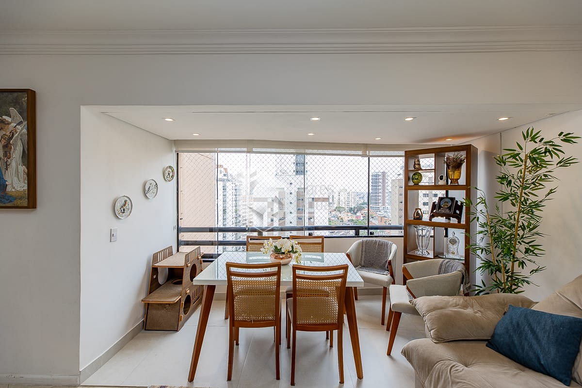 Logo na entrada, a sala ampla se integra à varanda fechada com vidro, criando um ambiente acolhedor para receber amigos, relaxar ou simplesmente apreciar o dia com conforto.
