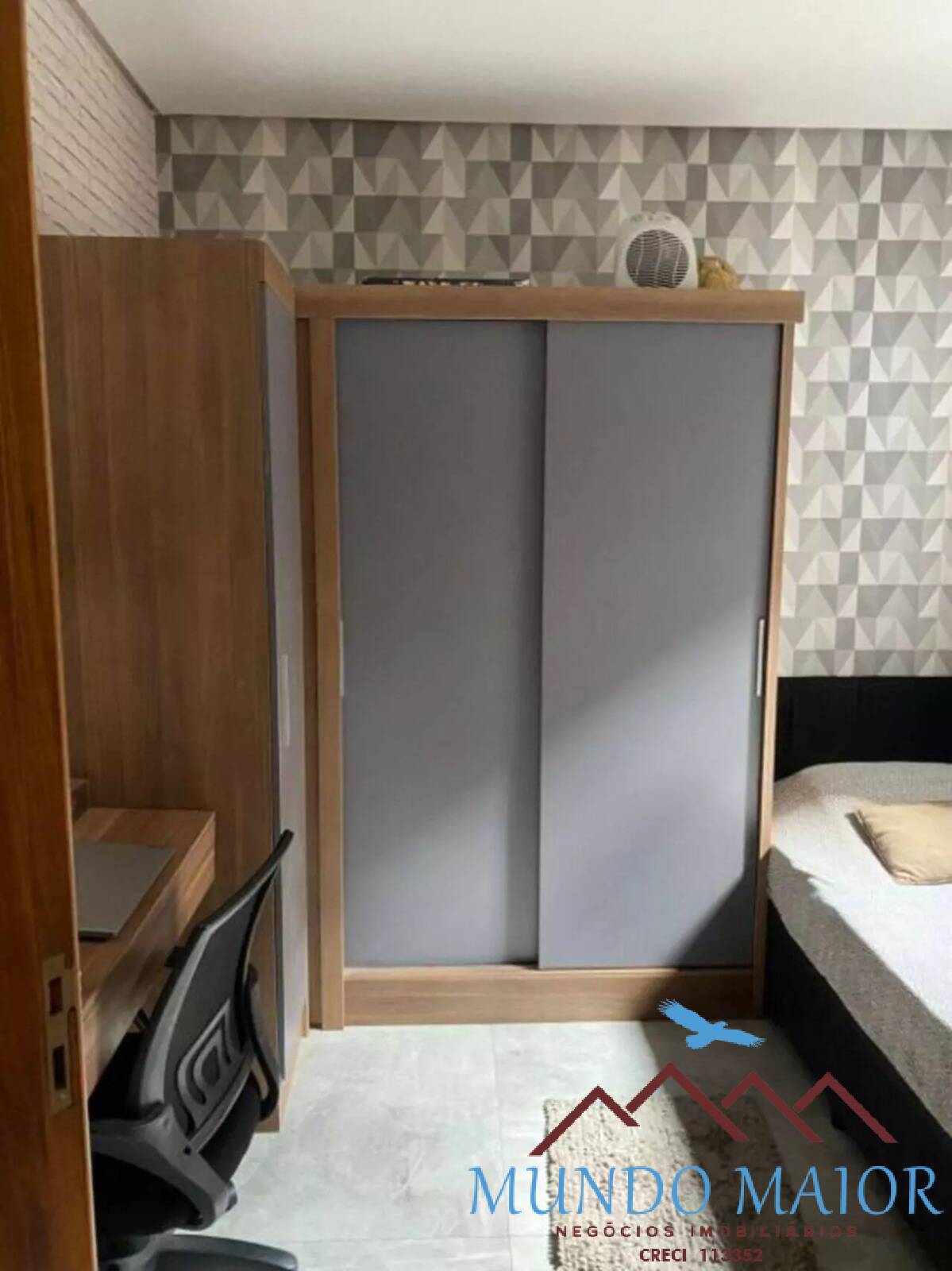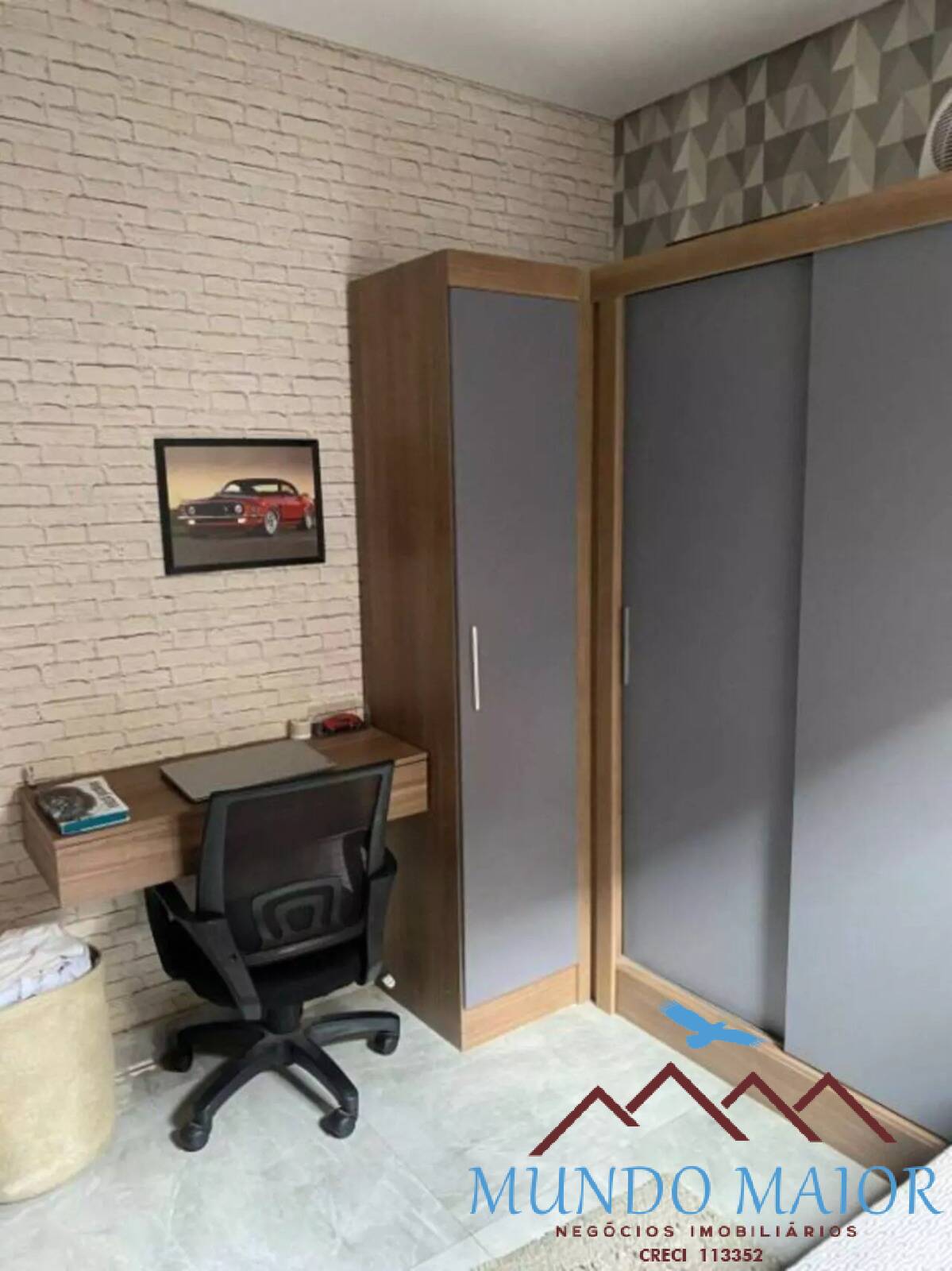 O quarto do casal possui papel de parede decorativo e o segundo dormitório conta com guarda-roupa planejado.