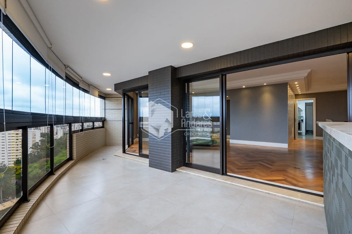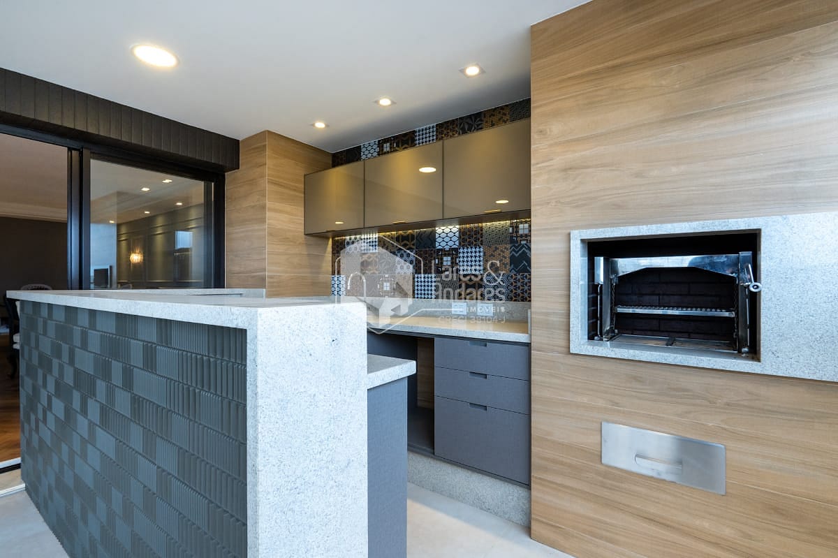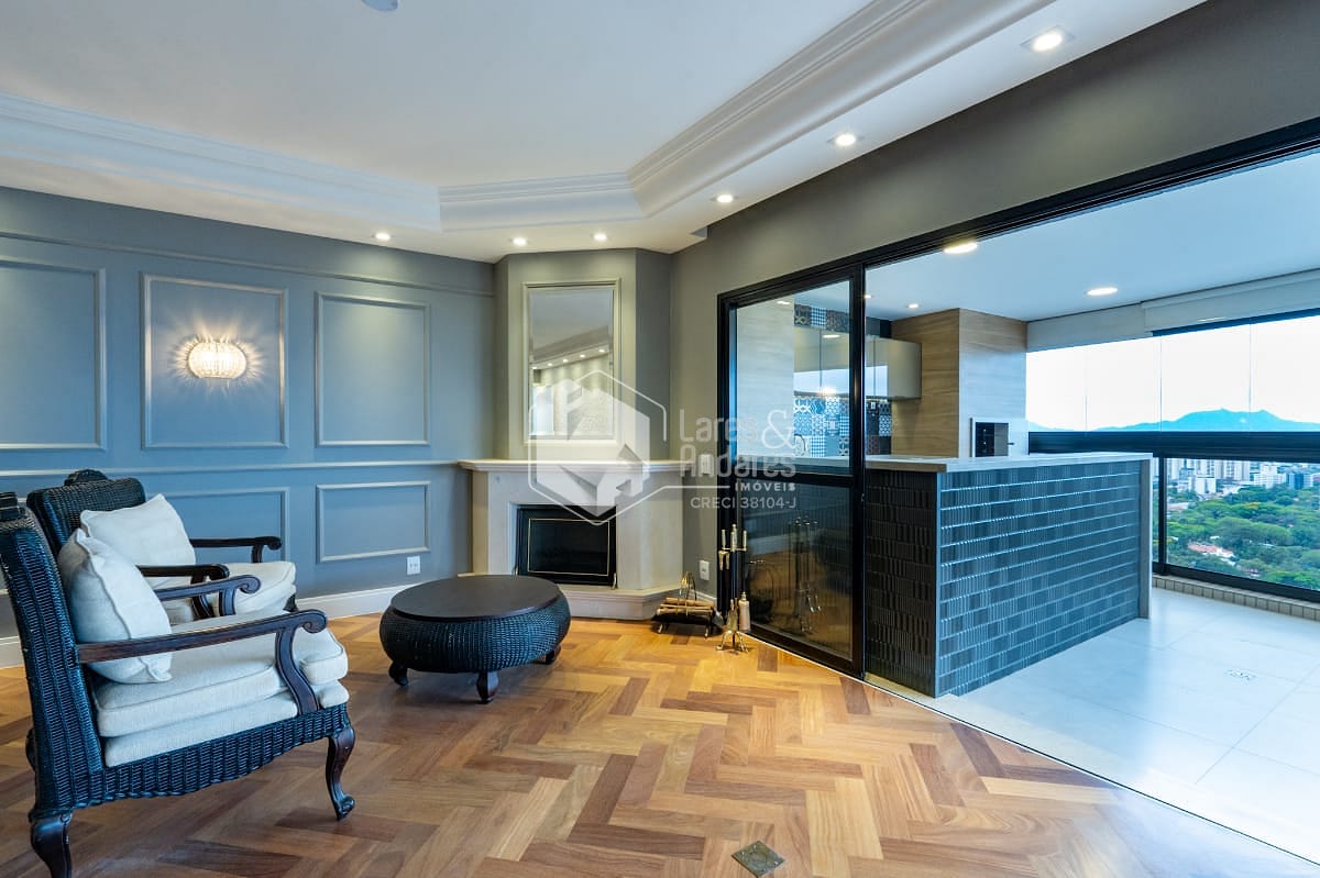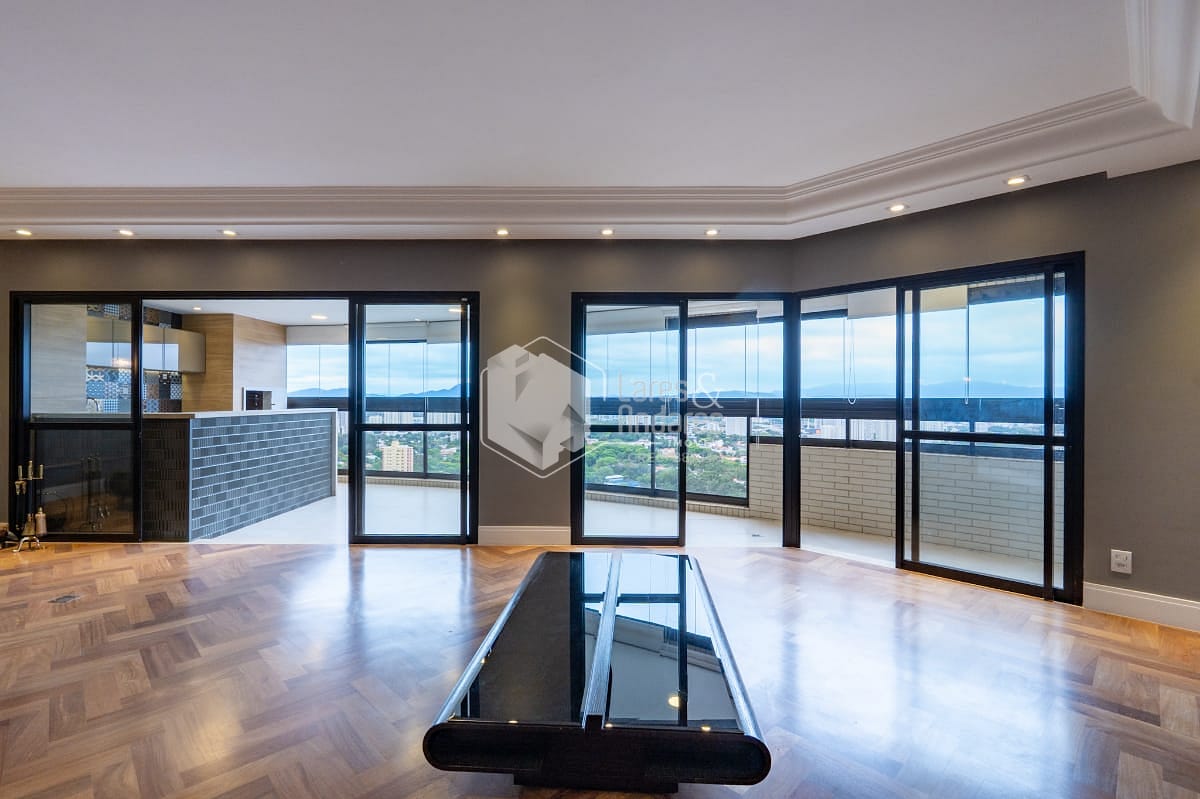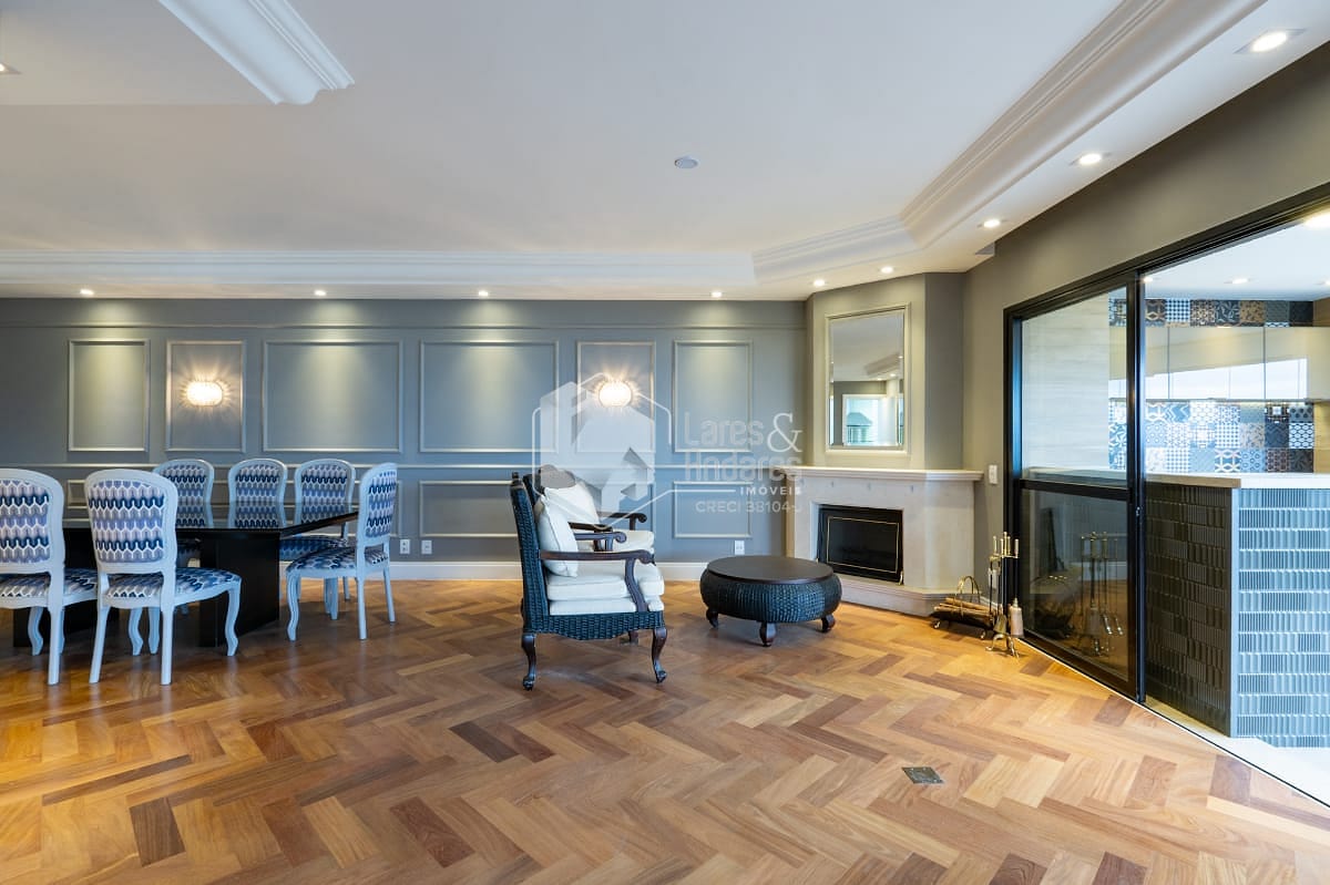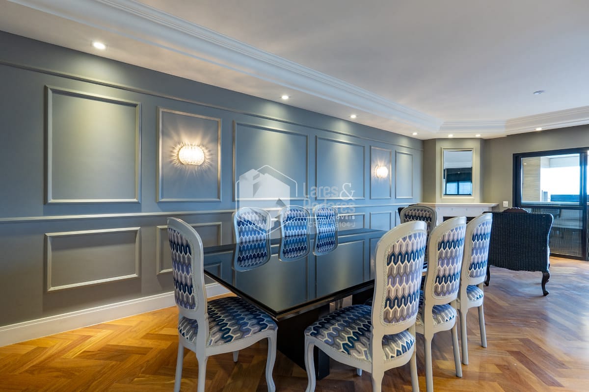 São 247 m2, em andar alto com hall privativo, varanda gourmet com churrasqueira a carvão, toda fechada com vidro e integrada ao amplo living com 3 ambientes - sala de jantar, estar e TV, lavabo, 04 suítes. Além de uma sala intima/escritorio, corredor com roupeiro, cozinha com armários planejados, despensa, copa espaçosa, área de serviço, com dormitório para funcionário e banheiro. Vale destacar que a suíte principal possui closet e banheiro com banheira. Todos os comodos internos possuem ar condicionado, piso de madeira e armários planejados.