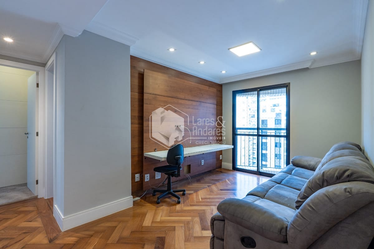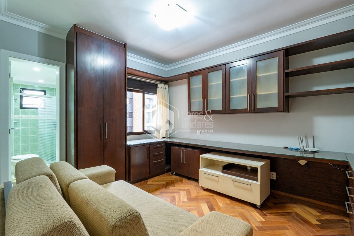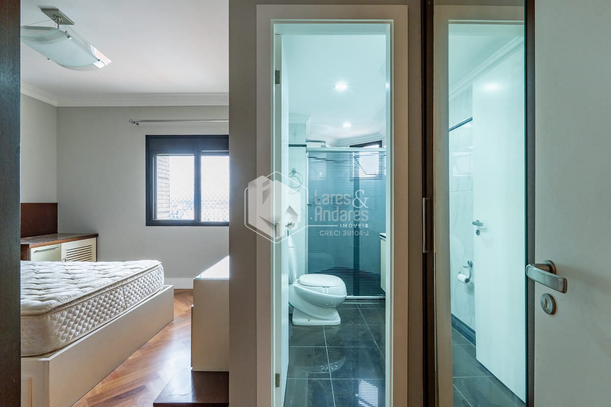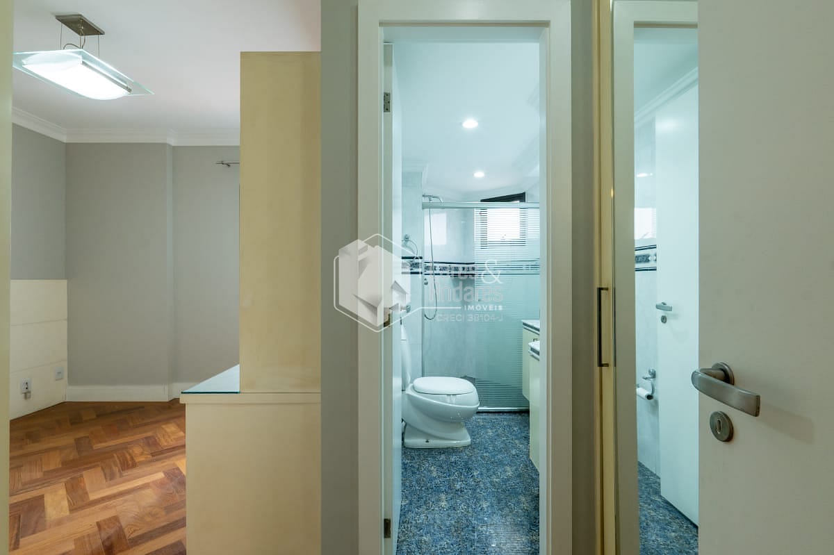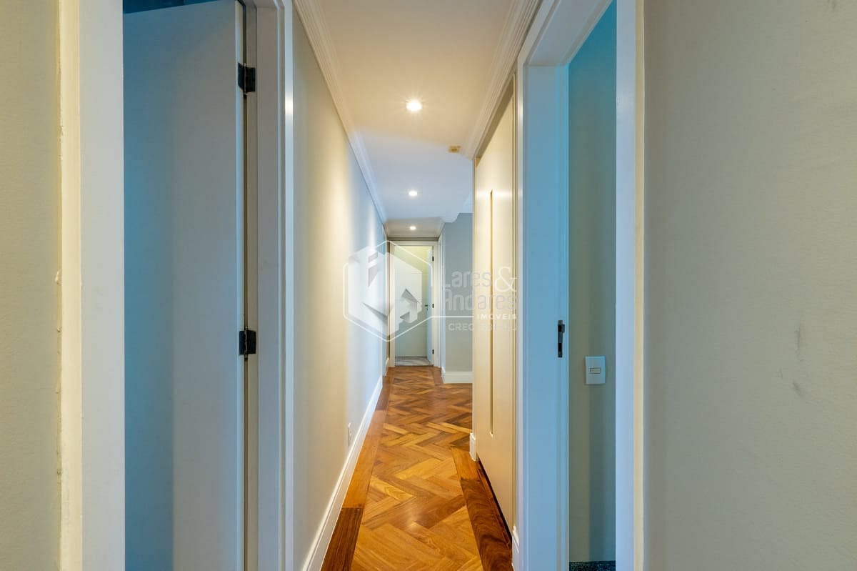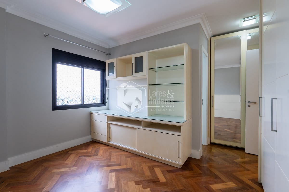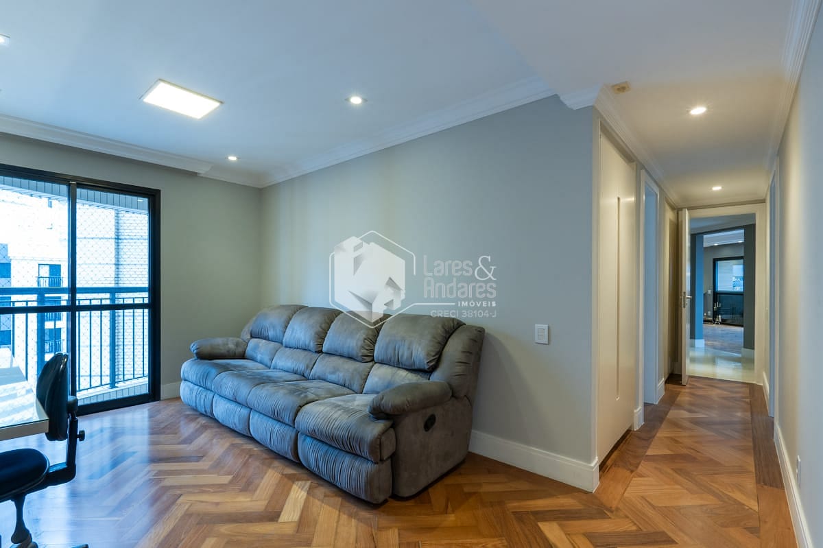 São 247 m2, em andar alto com hall privativo, varanda gourmet com churrasqueira a carvão, toda fechada com vidro e integrada ao amplo living com 3 ambientes - sala de jantar, estar e TV, lavabo, 04 suítes. Além de uma sala intima/escritorio, corredor com roupeiro, cozinha com armários planejados, despensa, copa espaçosa, área de serviço, com dormitório para funcionário e banheiro. Vale destacar que a suíte principal possui closet e banheiro com banheira. Todos os comodos internos possuem ar condicionado, piso de madeira e armários planejados.