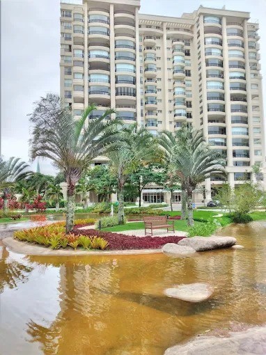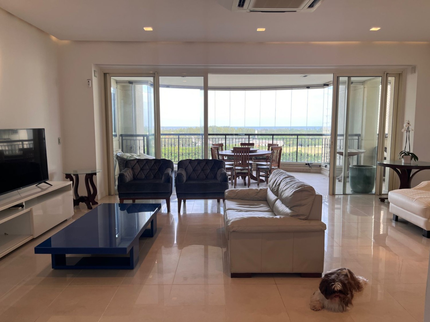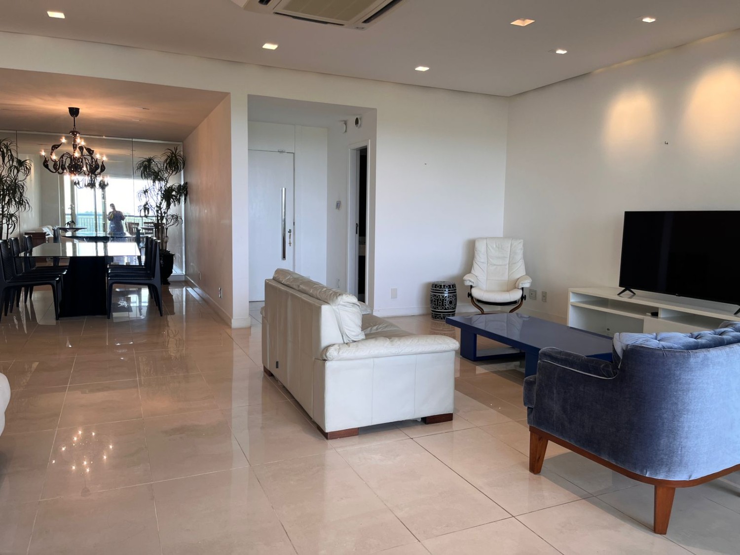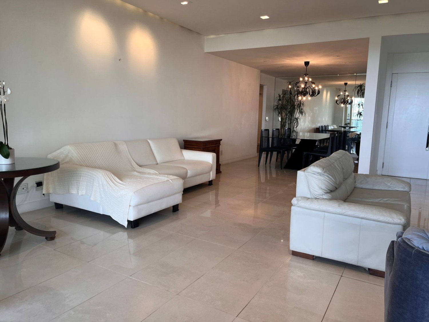 • Ampla sala com piso em porcelanato, dividida em três ambientes: duas salas de estar e uma de jantar com mesa de 8 lugares, espelho e lustre de cristal, com projeto de iluminação totalmente automatizada e ar cassete potente. Lavabo com pia de pedra e papel de parede.