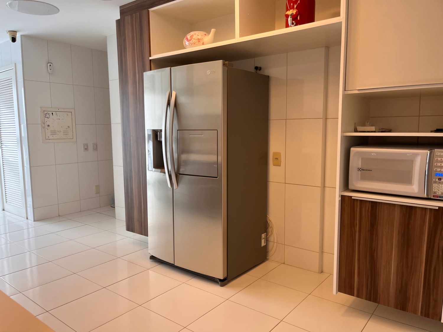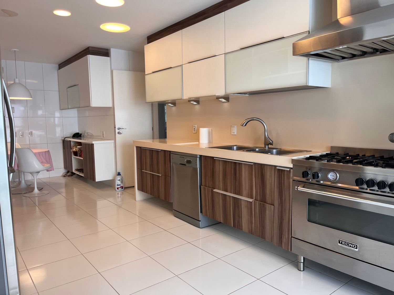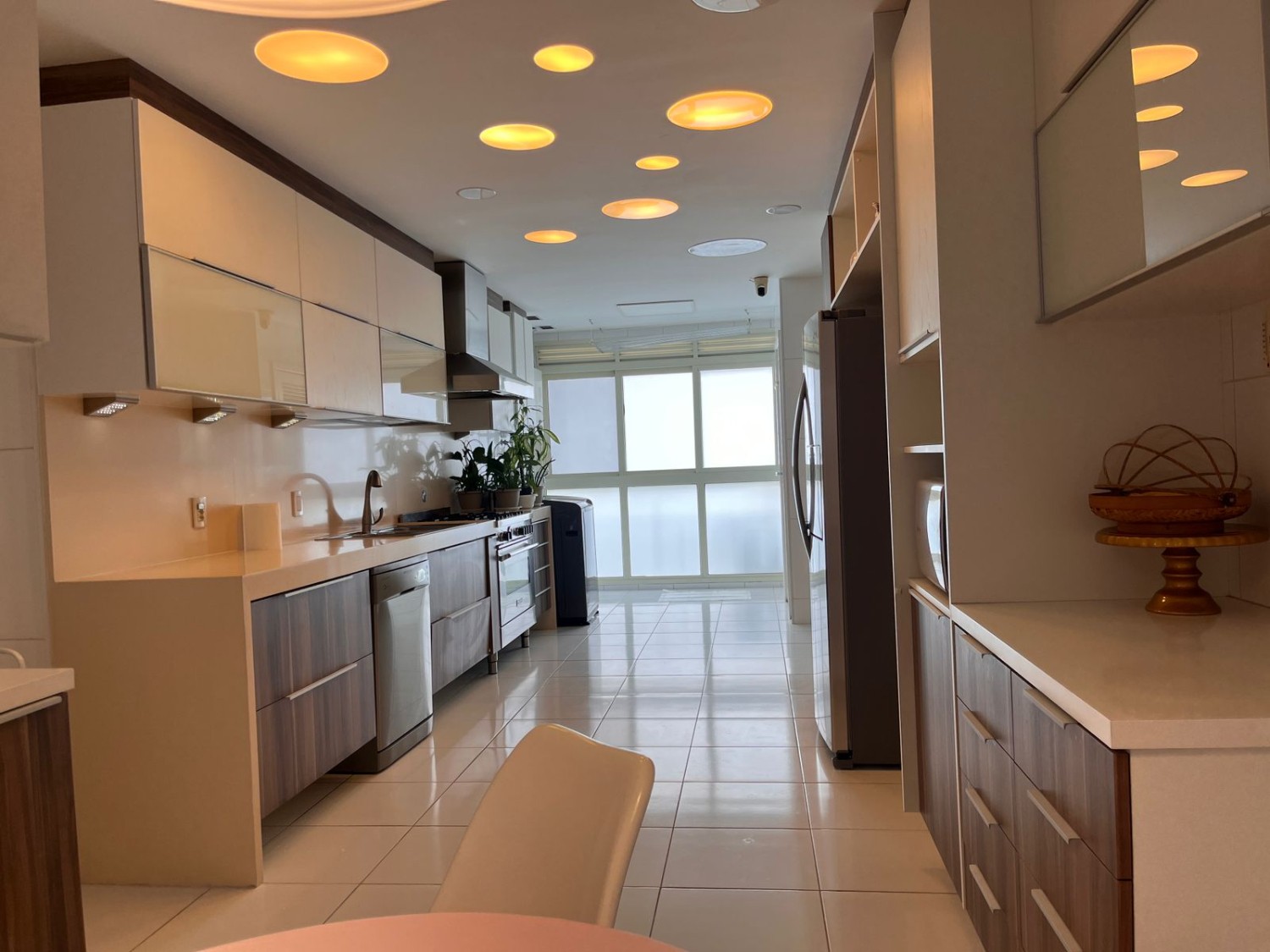 • Copa cozinha toda planejada, com mesa, com projetode iluminação, mesa de almoço, fogão 5 bocas semi profissional Lofra, geladeira dupla LG, microondas, máquina de lavar roupa Brastemp, máquina de secar roupas Brastemp e máquina de lavar louças Brastemp.