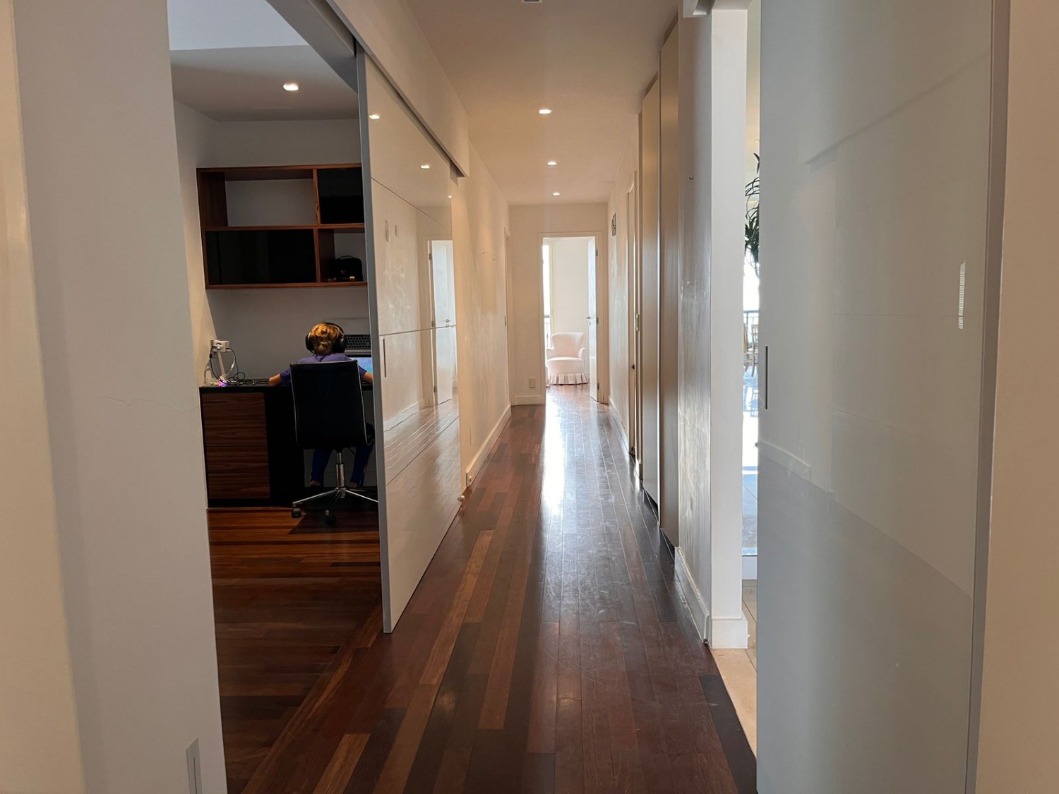 Apartamento com planta com longo corredor com roupeiro, permitindo ampla circulação de ar.