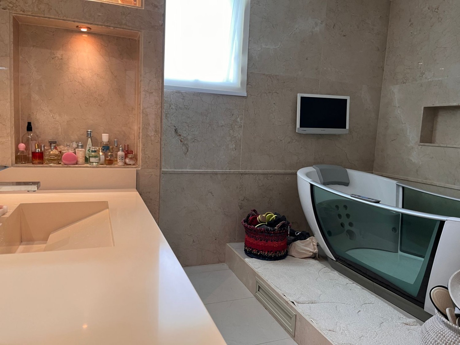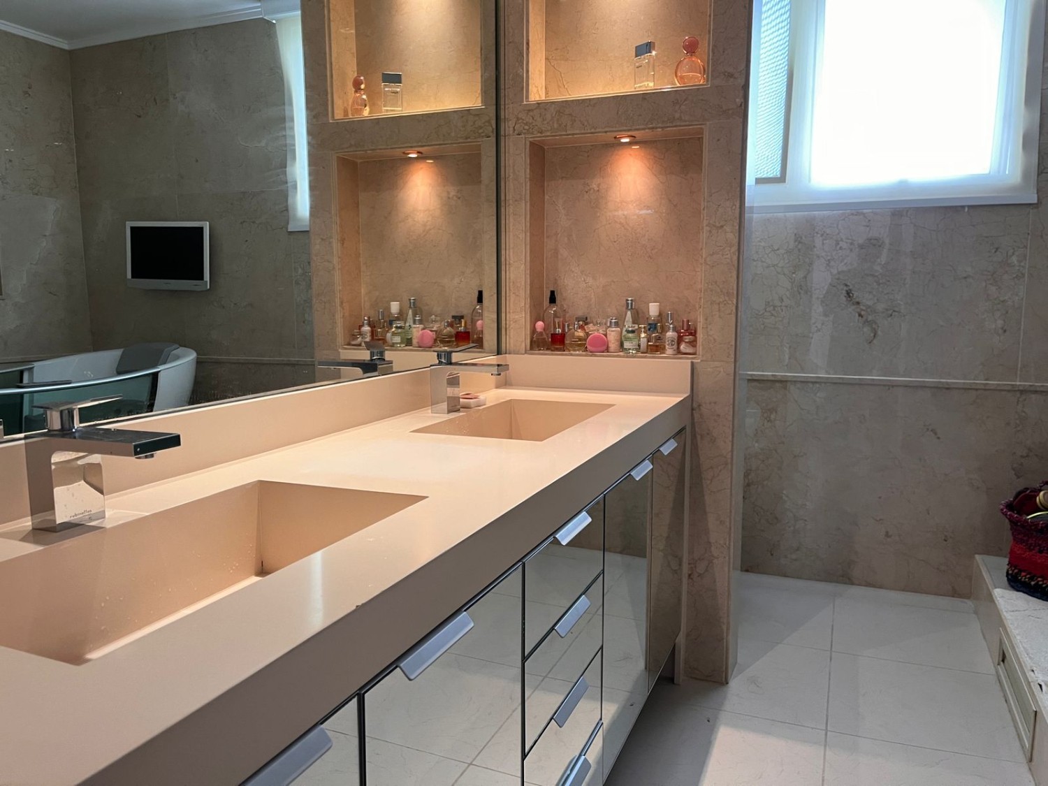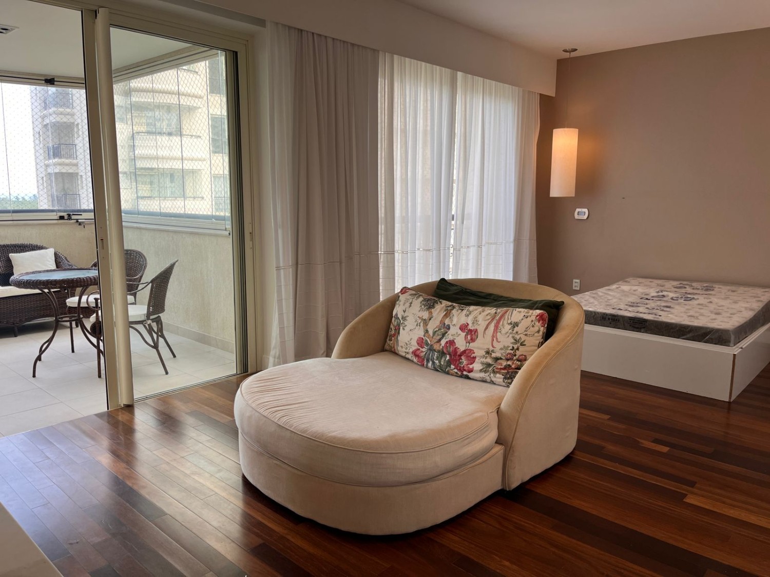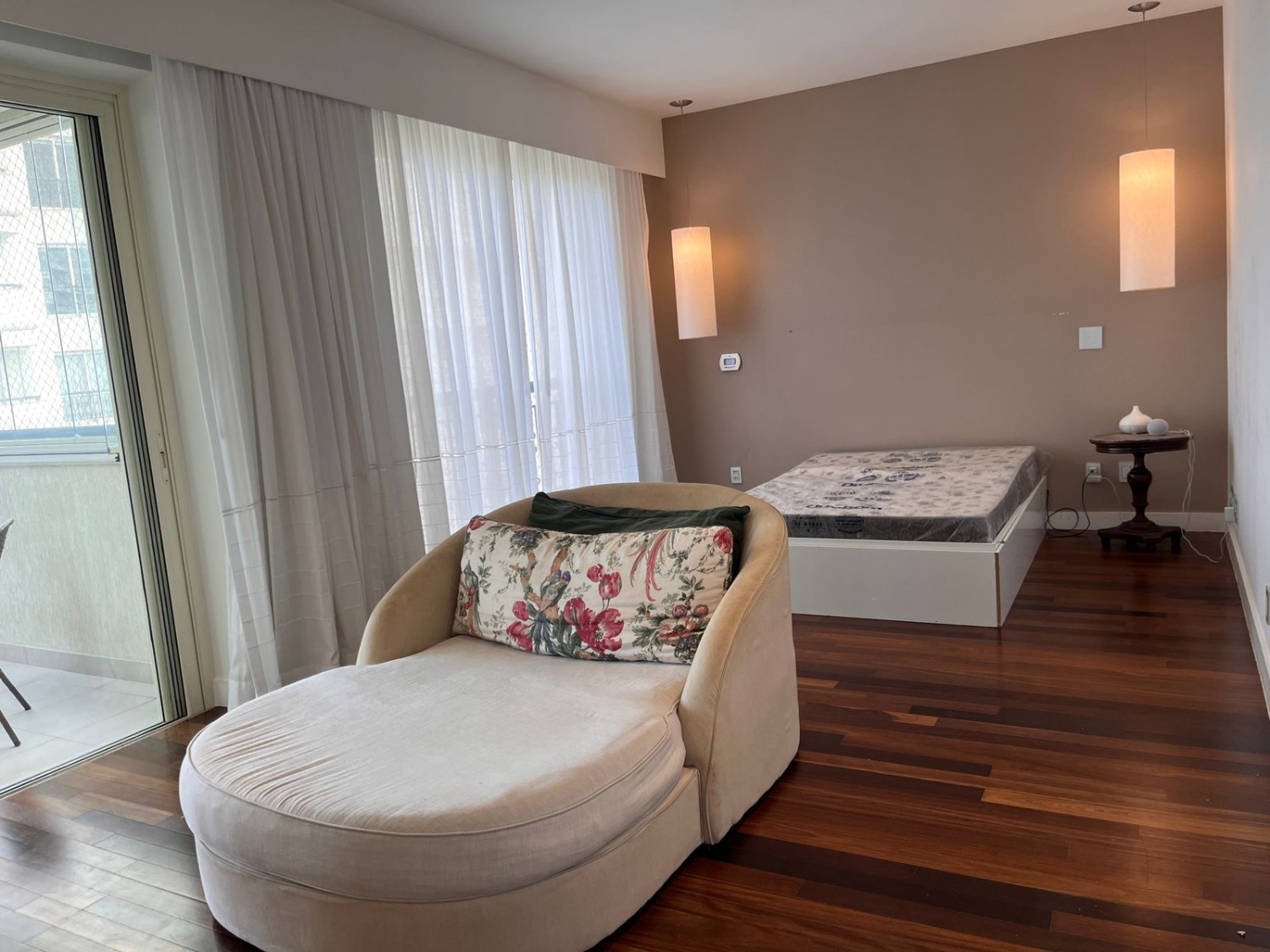1. Suíte master com janelas e varanda, automação de luz, cortinas black out via Alexa, ar split, estante fixa em laca branca, cortinas de linho, cama de casal e chaise lounge. Banheiro com pia dupla, com mármore nas paredes, cortinas, banheira de hidromassagem, televisão, e fechamento de blindex no chuveiro.2.