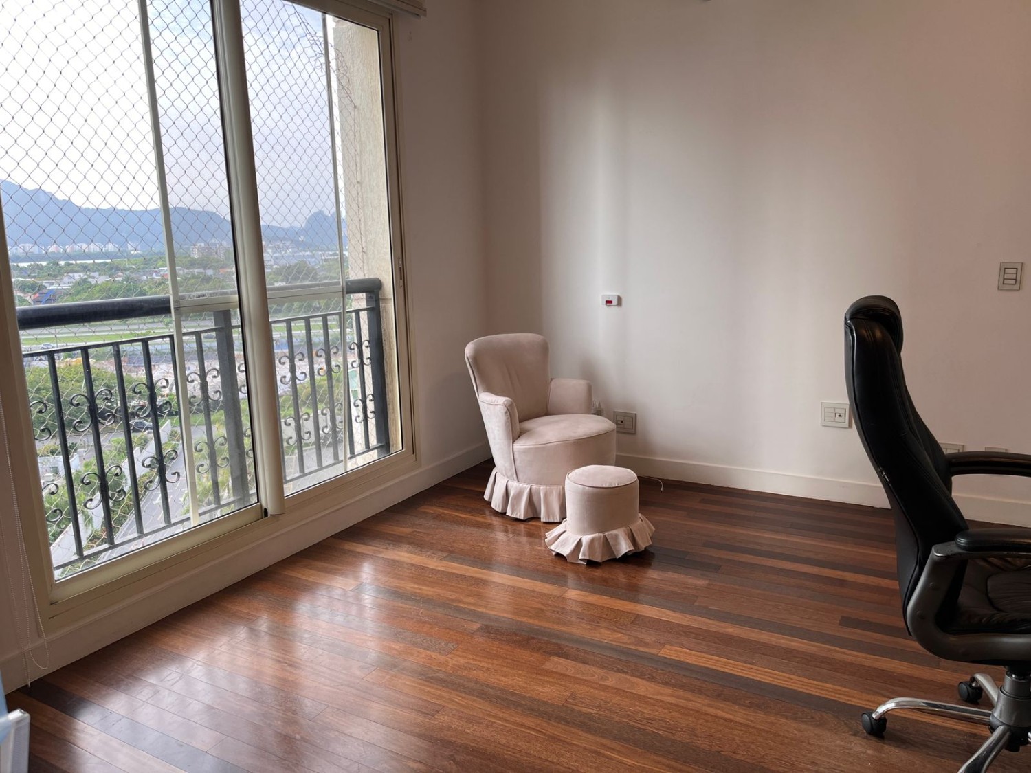 com porta de correr Cinex acústica, estante de laca preta com iluminação , mesa e estante para estudos. Contém sofá com chaise e duas poltronas de couro, banheiro banheiro com pia de celestone, pastilhas e blindex.