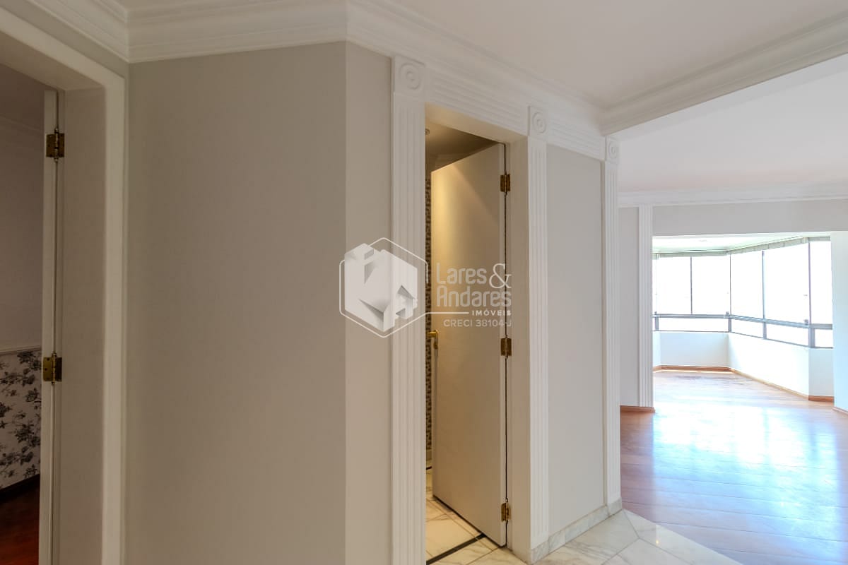 Localizado no 9º andar, o apartamento possui 4 quartos, sendo 2 suítes. Na suíte do casal há varanda privativa e na outra suíte juntamente com um dos quartos há uma interligação por outra charmosa varanda.