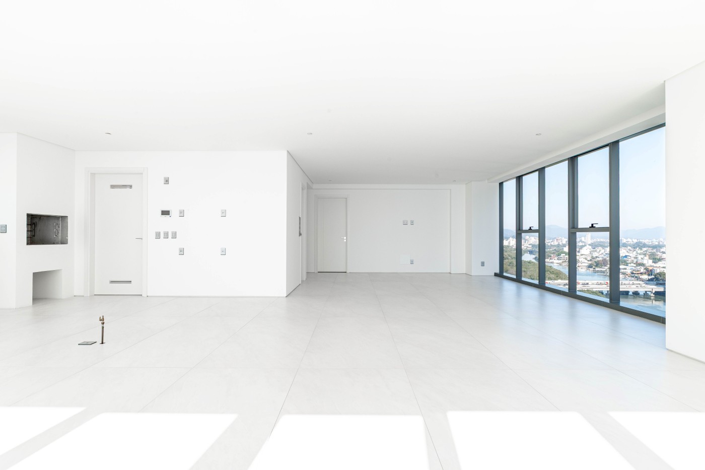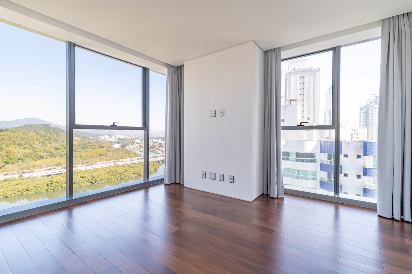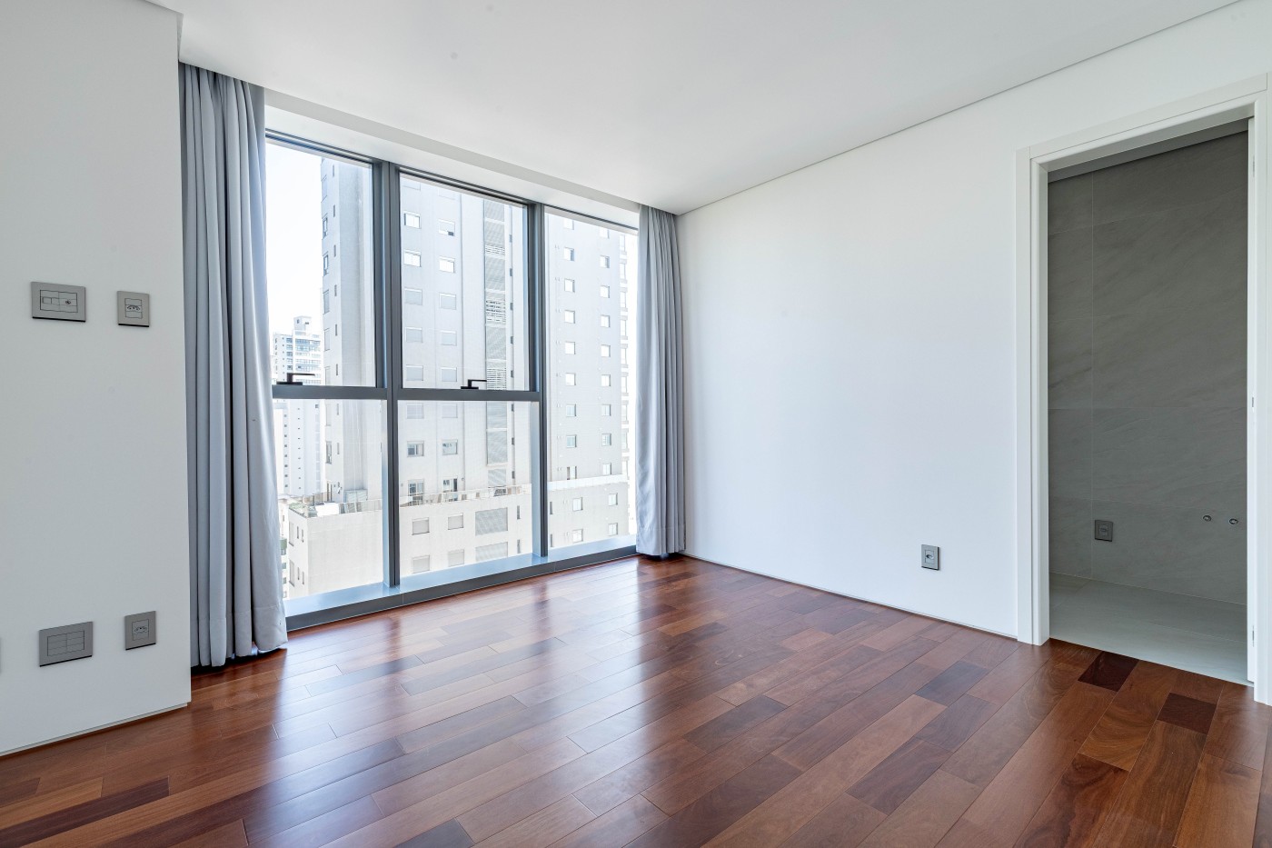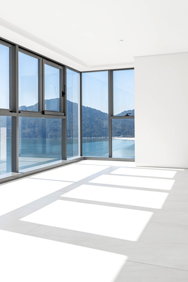 marca alemã Schüco piso porcelanato 1,2m x 1,2m na área social piso de madeira na área íntima