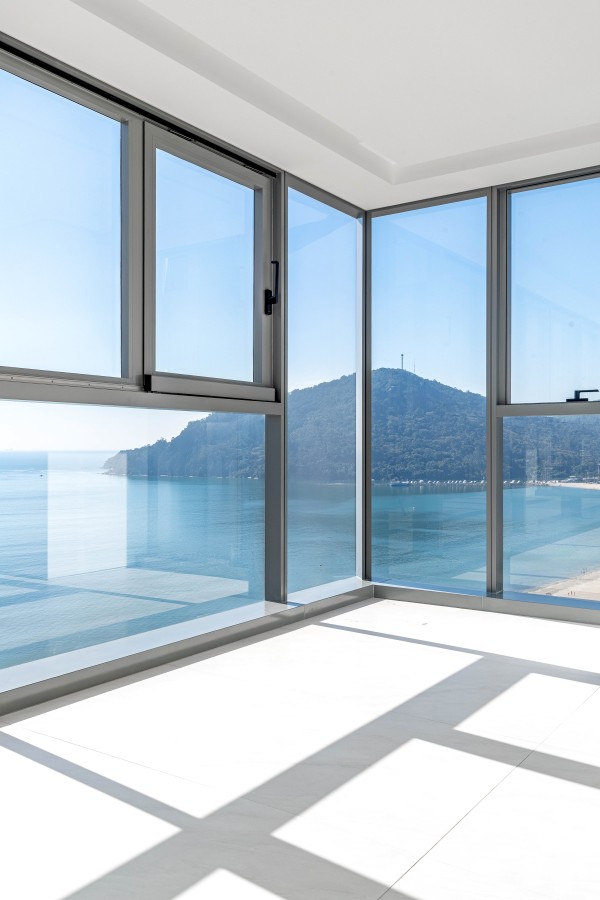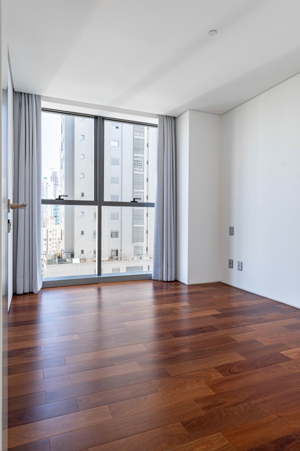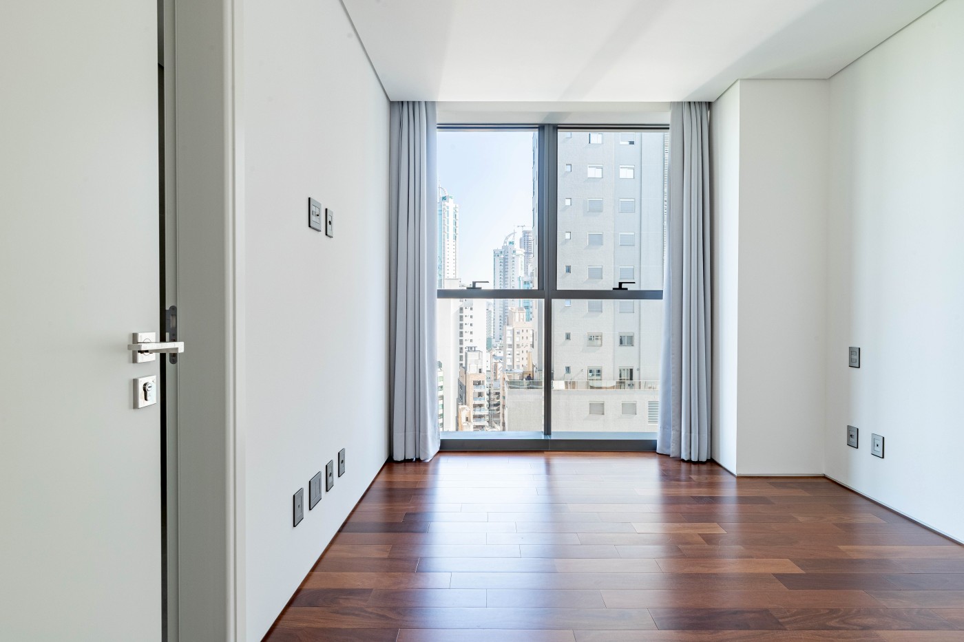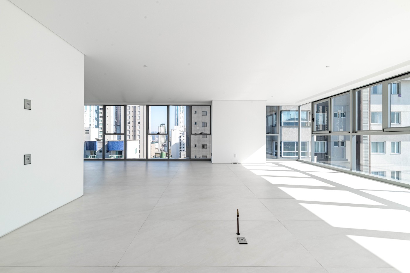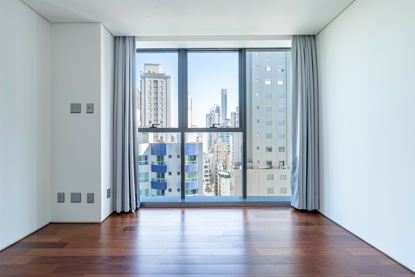 marca alemã Schüco piso porcelanato 1,2m x 1,2m na área social piso de madeira na área íntima