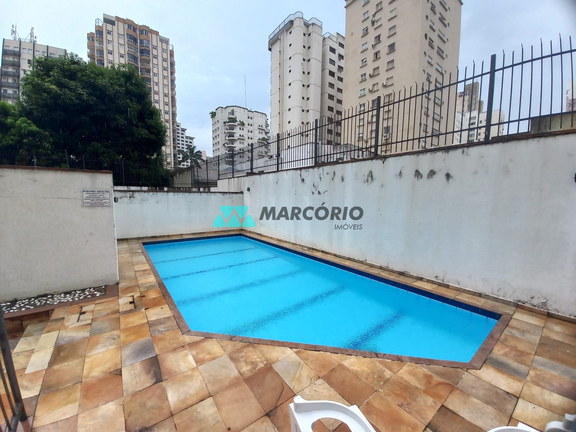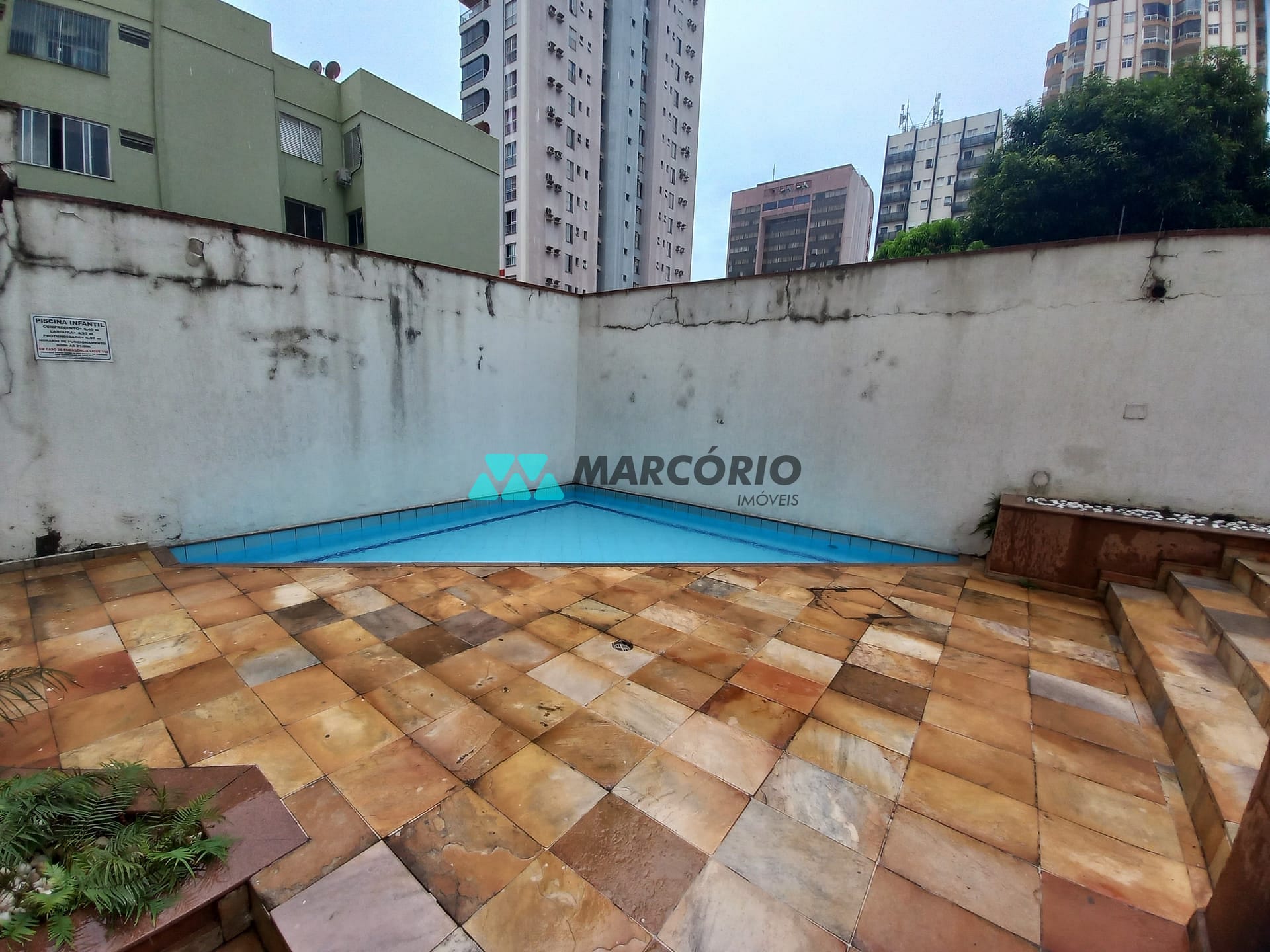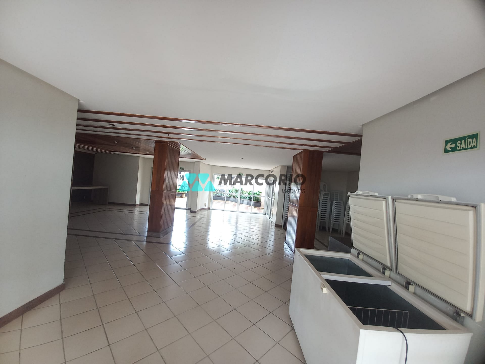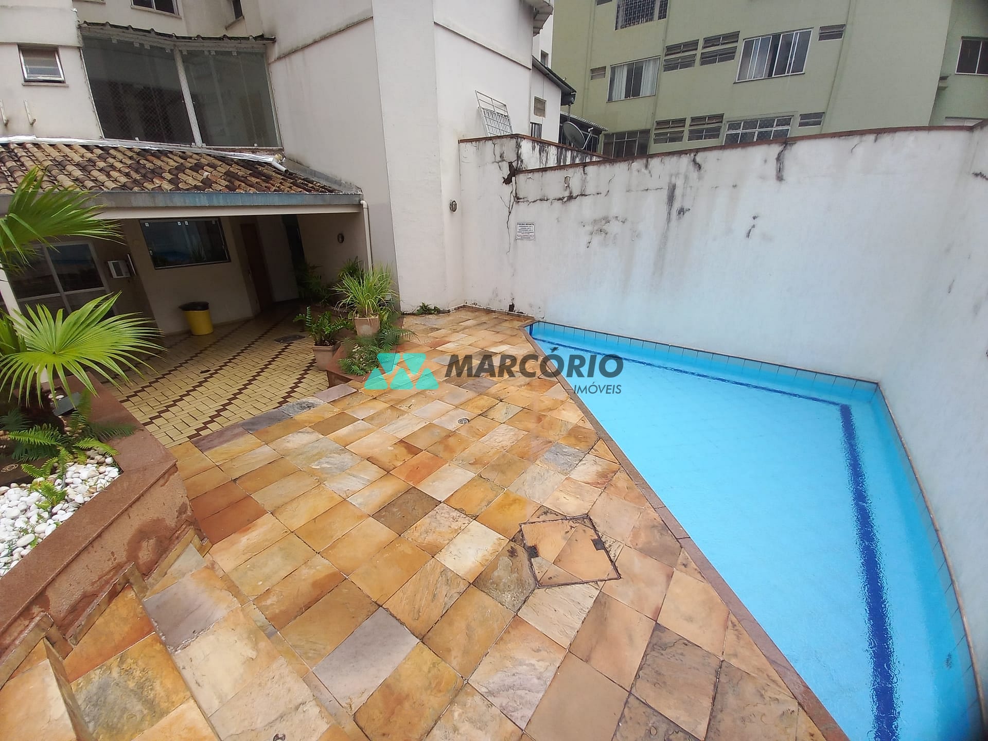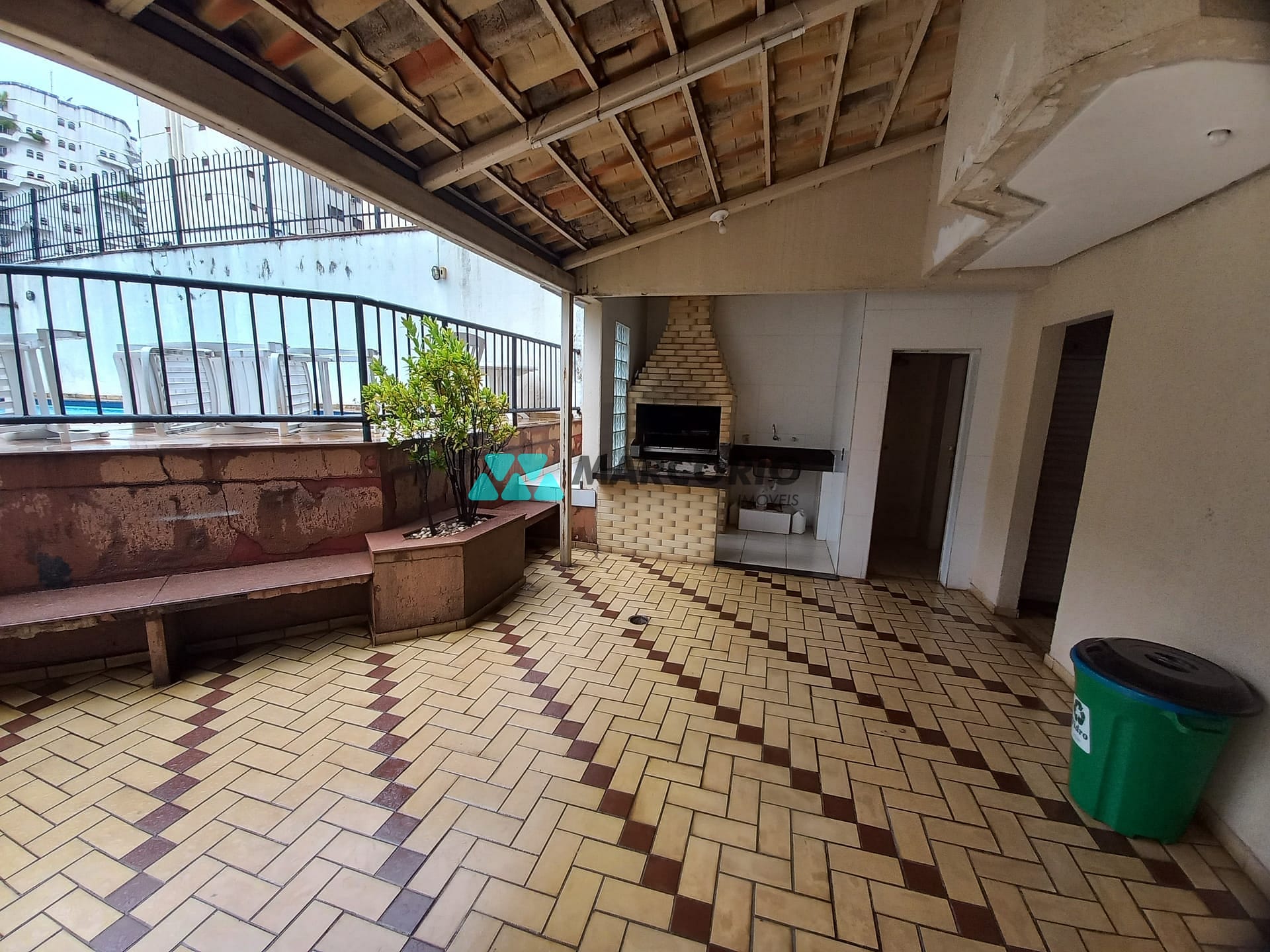 Condomínio com Área de lazer com churrasqueira, salão de festas e piscina ensolarada.