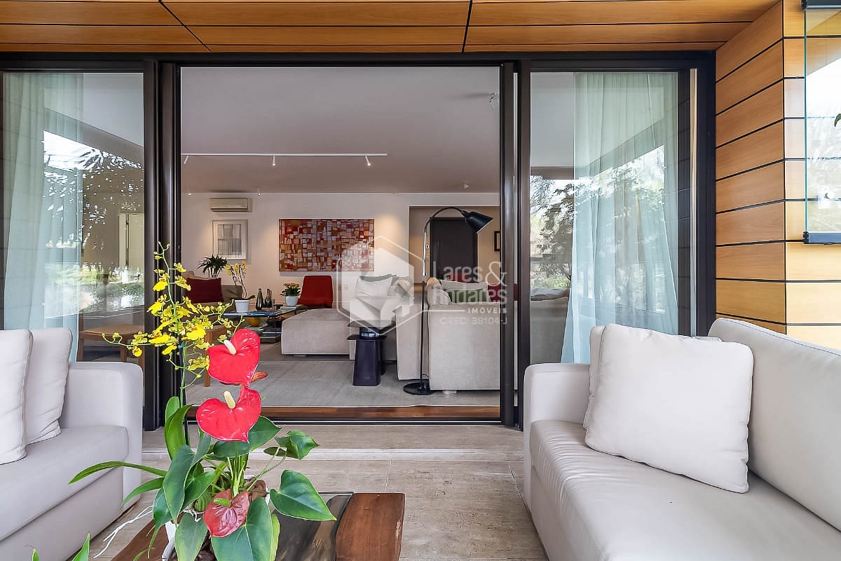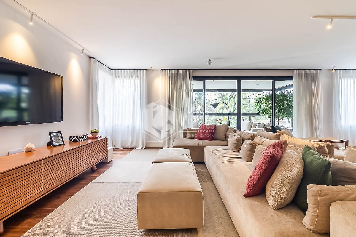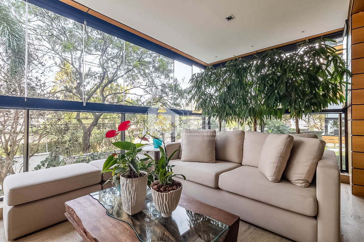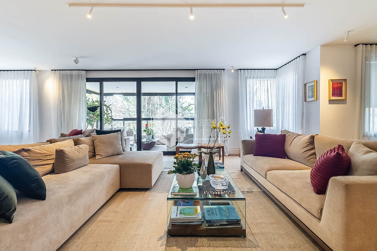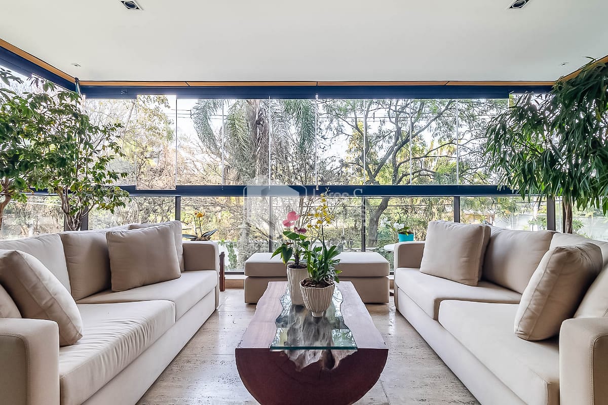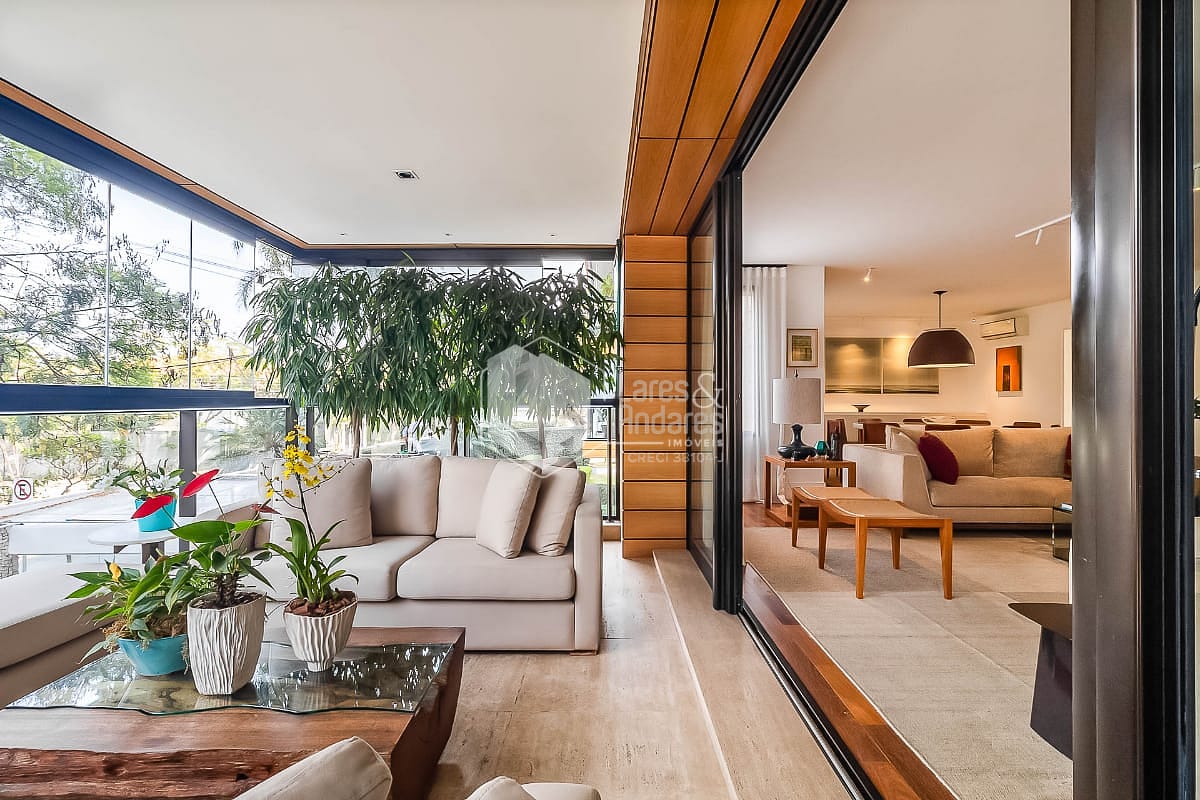 O apartamento foi reformado com cuidado e clareza. A sala generosa acomoda três ambientes e se abre para uma varanda envidraçada, com piso de mármore travertino e vista para as árvores. A luz natural percorre cada canto, reforçando a sensação de amplitude e criando uma atmosfera tranquila e acolhedora.