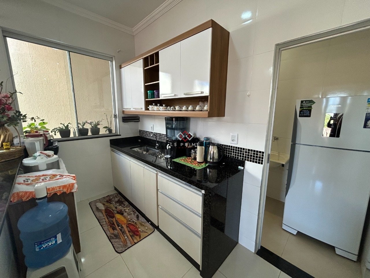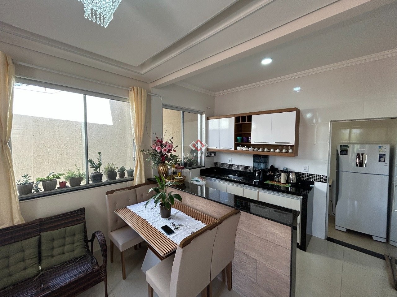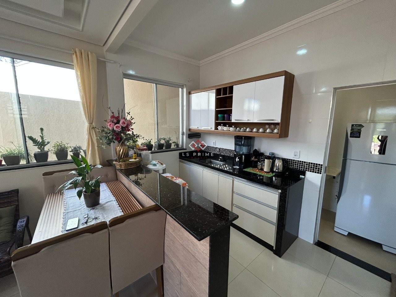 Cozinha americana com bancadas em granito e armários;
