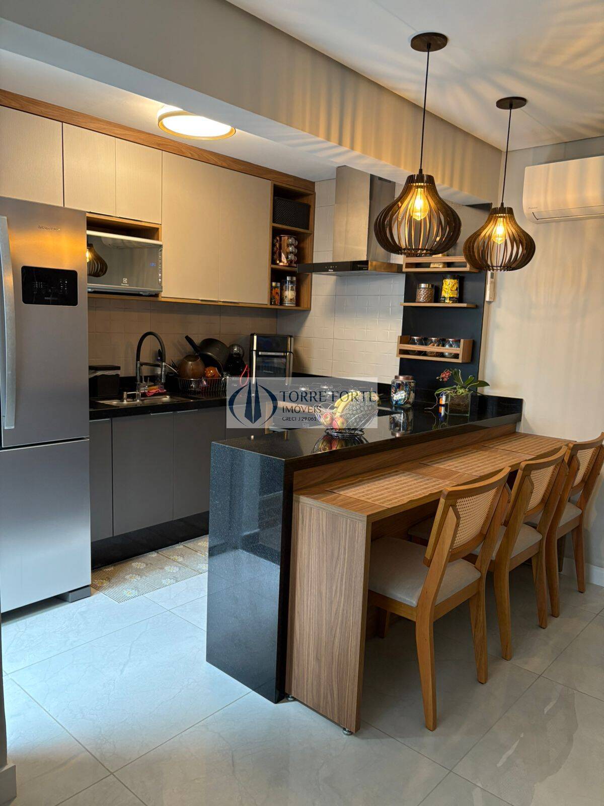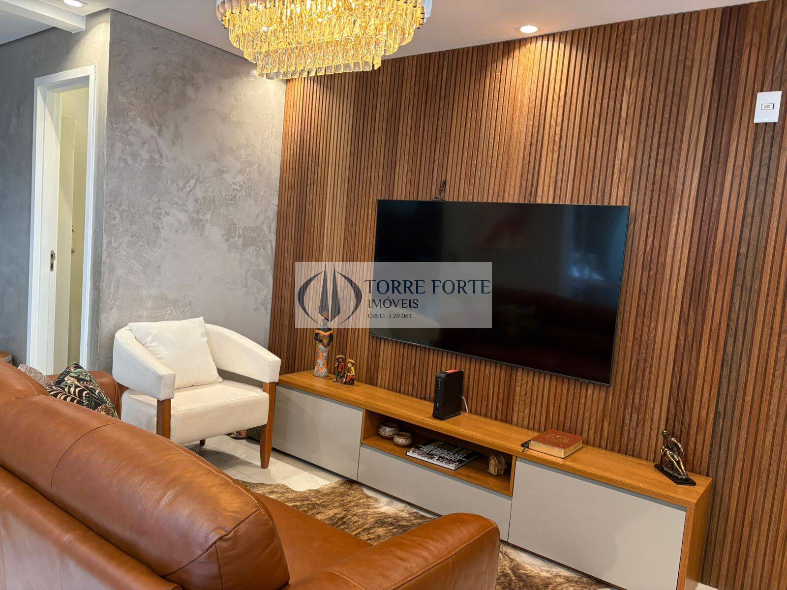 Piso de porcelanato nas área molhadas e sala, dormitórios com piso de madeira, sala com parede ripada com madeira de lei, ar condicionado nos dormitórios e sala.