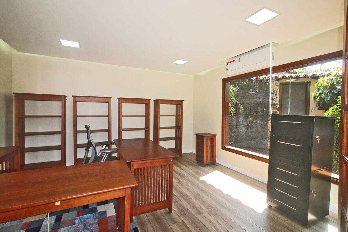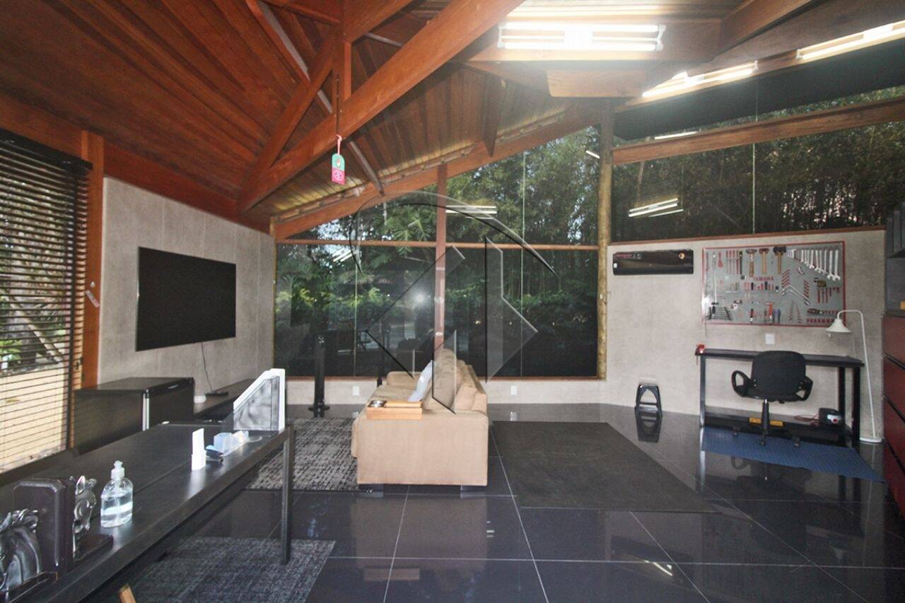 Os dois escritórios proporcionam um ambiente ideal para trabalho e criatividade, com um deles dedicado à temática de uma oficina de carro, ideal para os entusiastas automotivos que escolhem viver na Granja Viana.