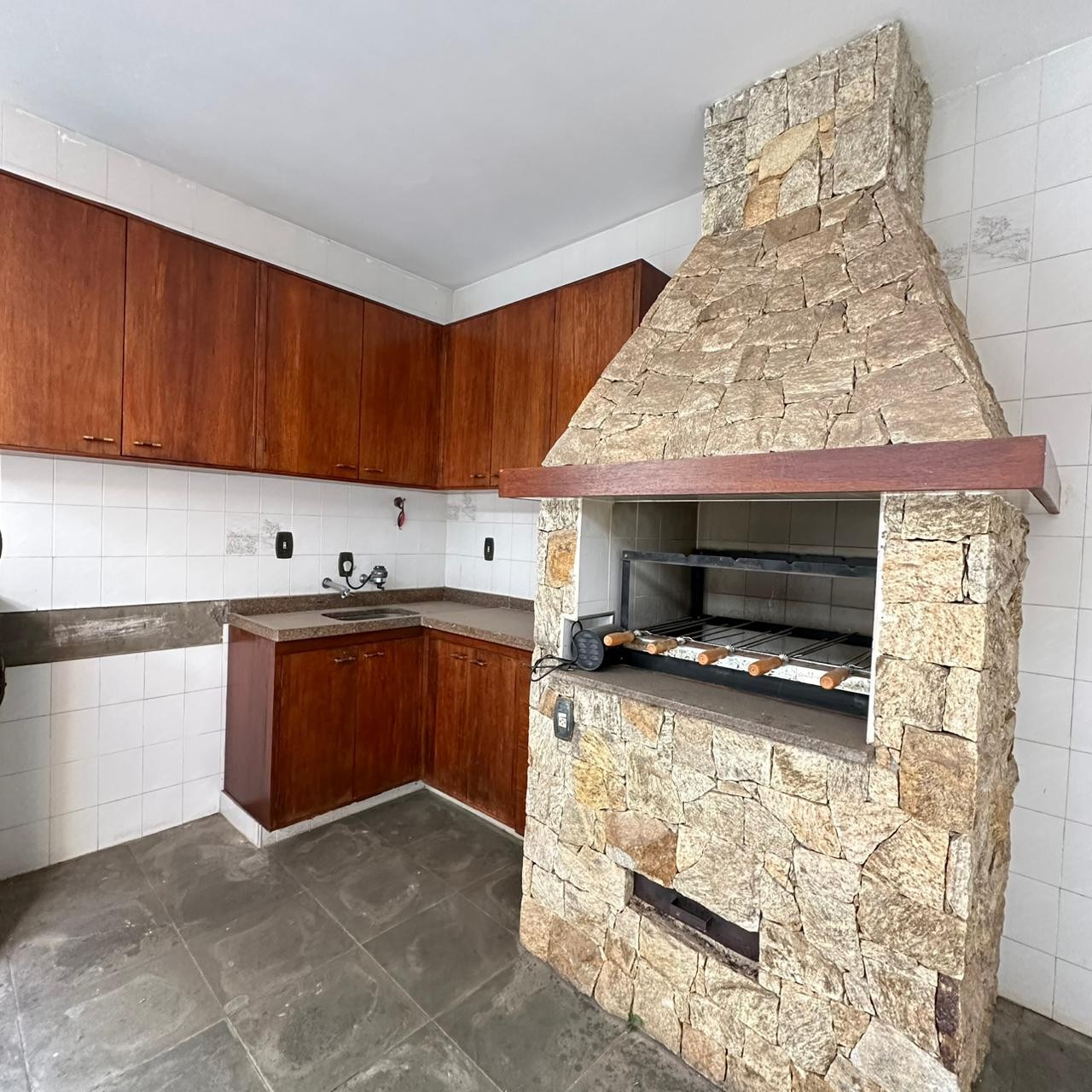 Espaço gourmet com churrasqueira e fogão;