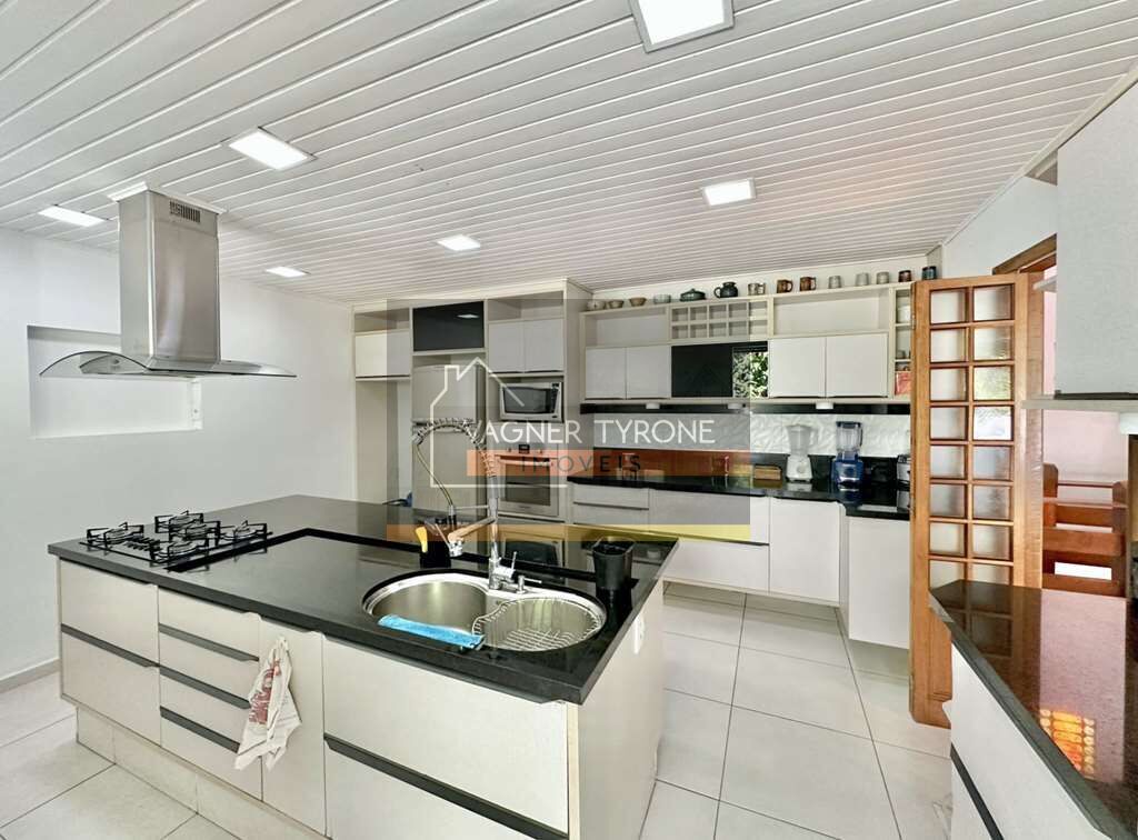 •Copa cozinha modernizada e planejada, integrada à sala de jantar, repleta de armários e gabinetes, com bancadas em granito, 2 cubas inox, torneira gourmet, ilha com coifa inox, com porta de vidro para o quintal.