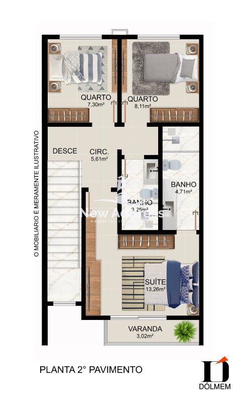 2º Pavimento: Escada, circulação, banheiro social, 3 quartos, sendo 1 deles com suíte e varanda.