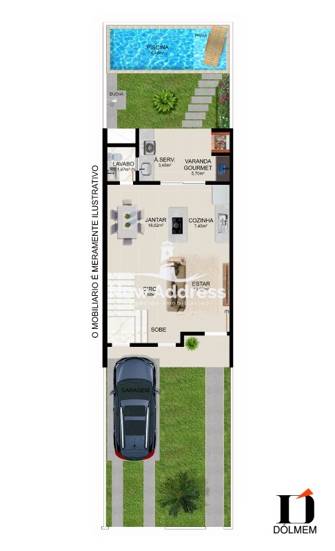 1º Pavimento: Portão de acesso para carro e pedestres, 1 vaga de garagem, jardim, varanda e acesso, sala, circulação, acesso à escada, cozinha com ilha, varanda gourmet, área de serviço, lavabo, piscina, ducha e churrasqueira.