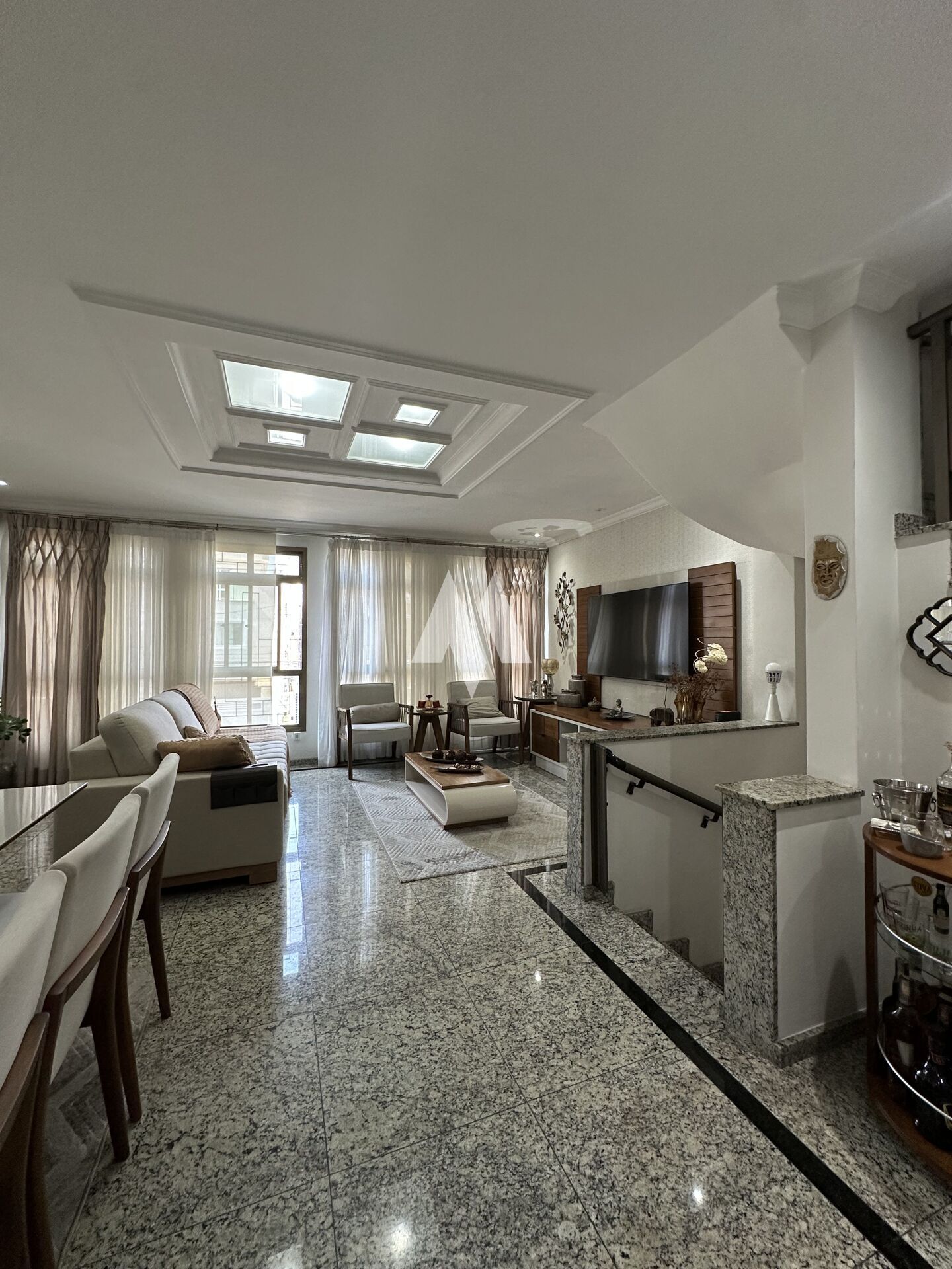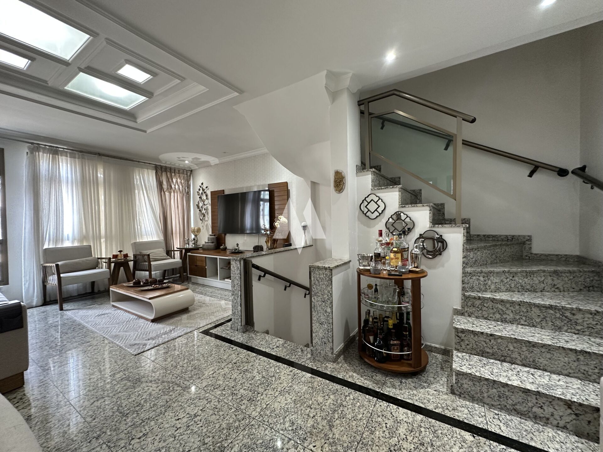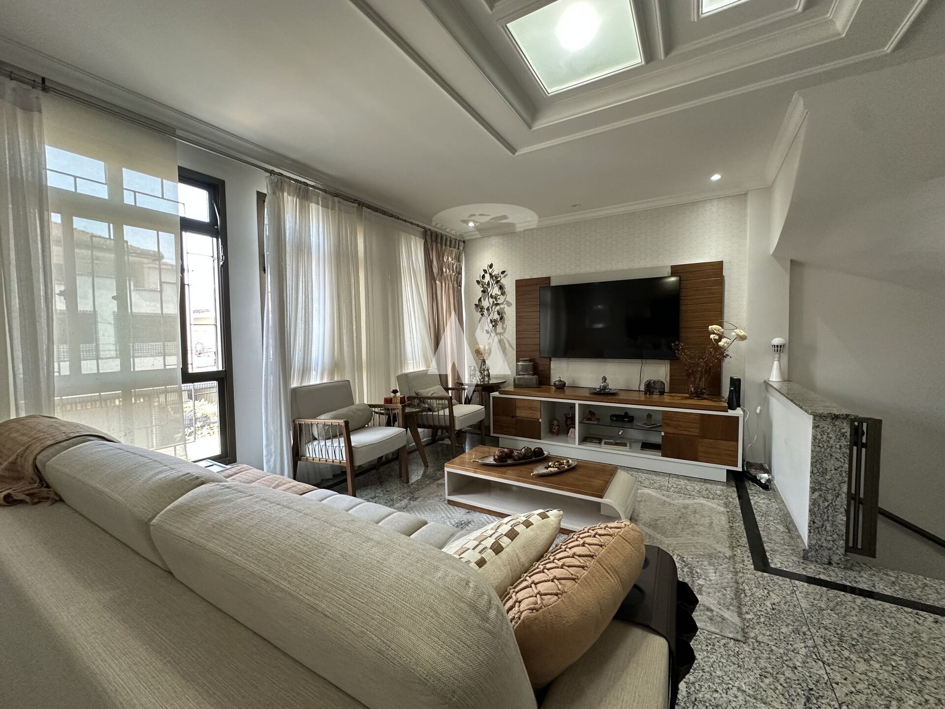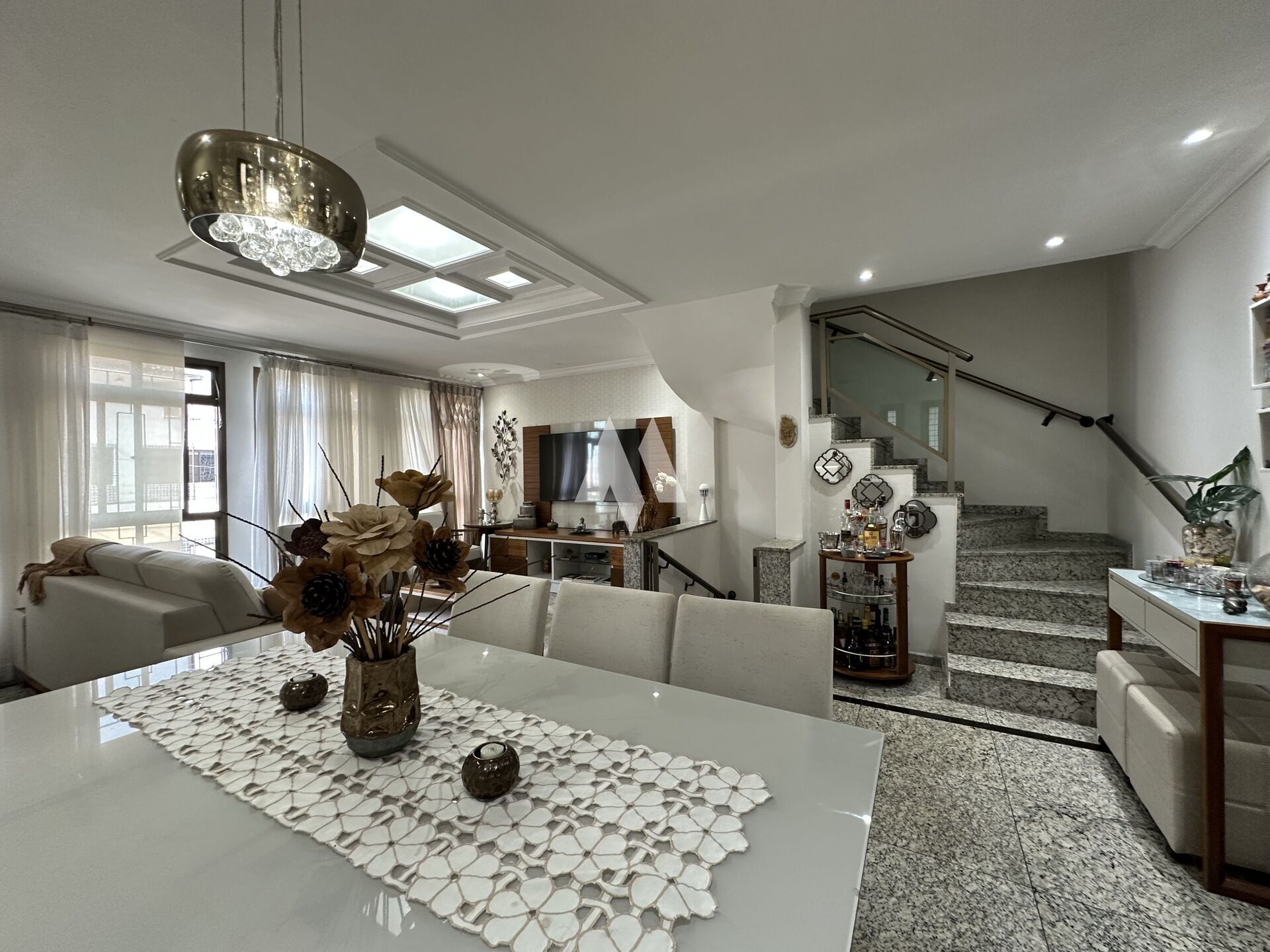 No segundo andar, a sala é ampla e confortável, perfeita para dois ambientes, com integração à cozinha e a um lavabo. No último pavimento ficam os três dormitórios, sendo um deles uma suíte espaçosa, além de um banheiro social.
