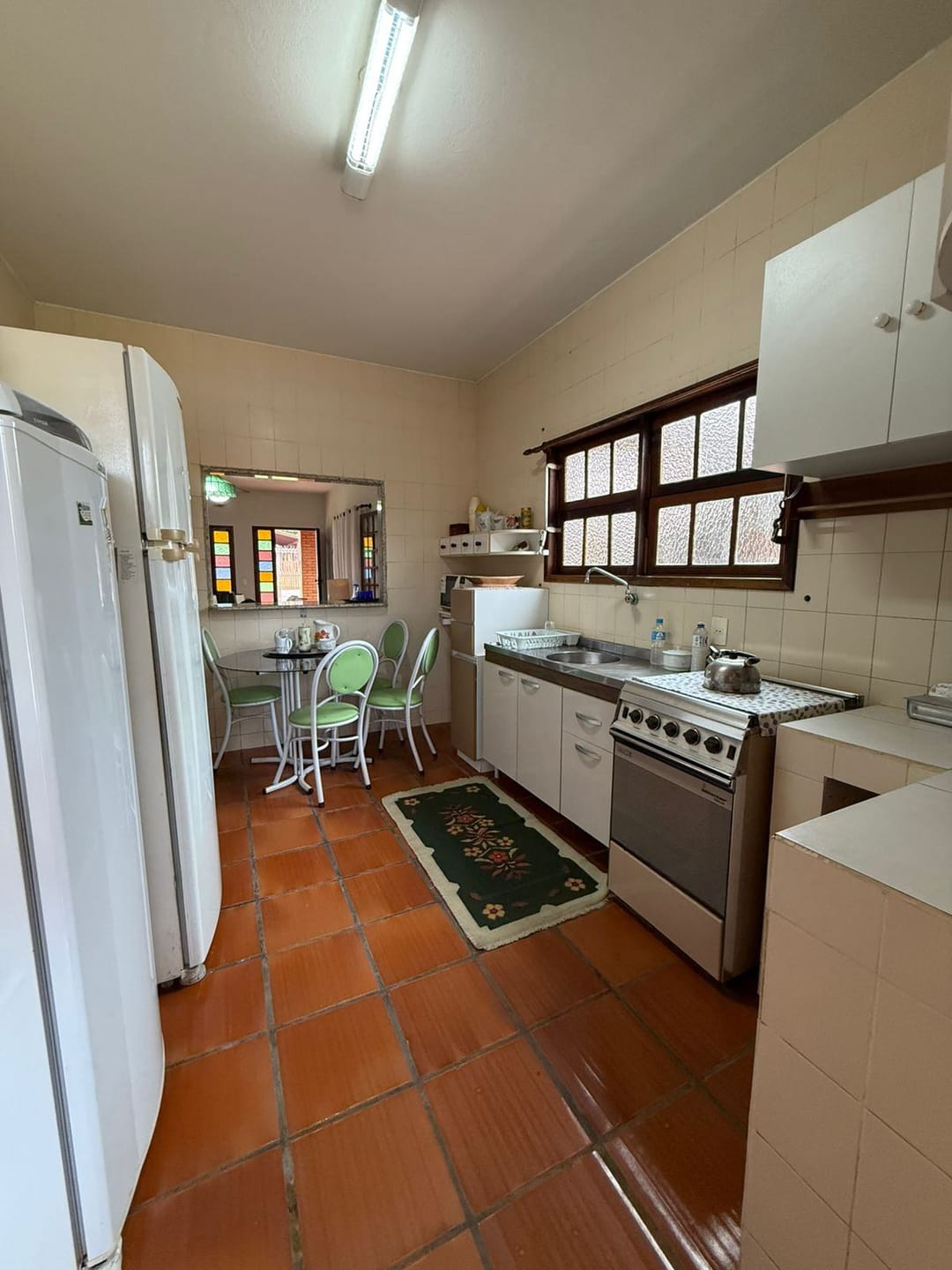 Cozinha equipada com fogão, geladeira duplex, micro-ondas e utensílios