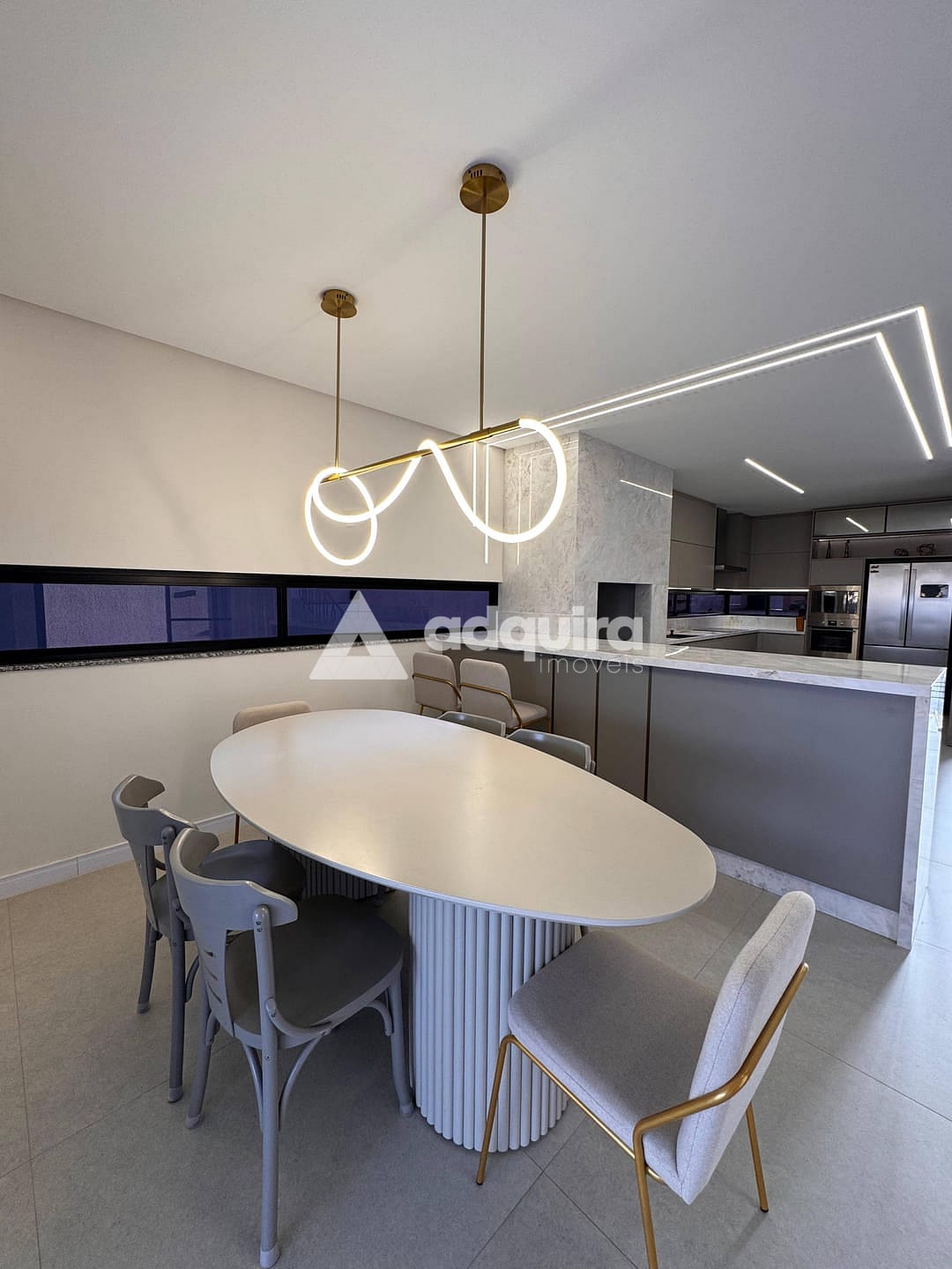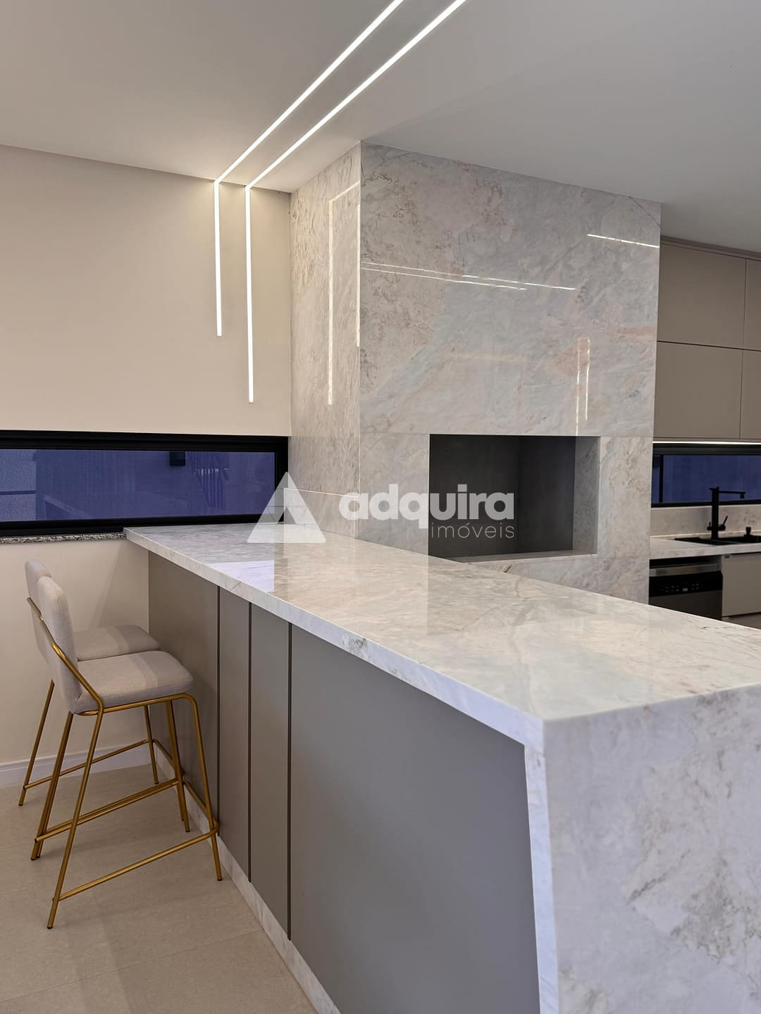Espaçosa área gourmet revestida em mármore branco Paraná um toque de elegância e exclusividade.