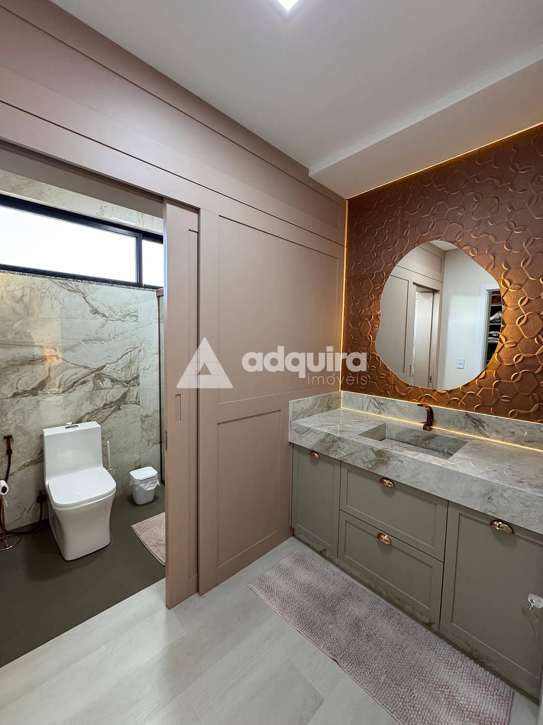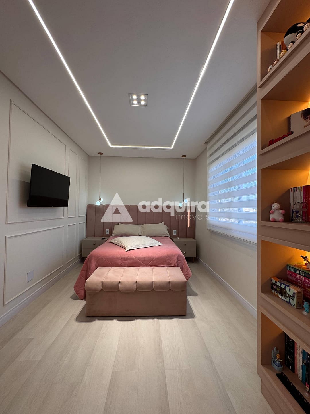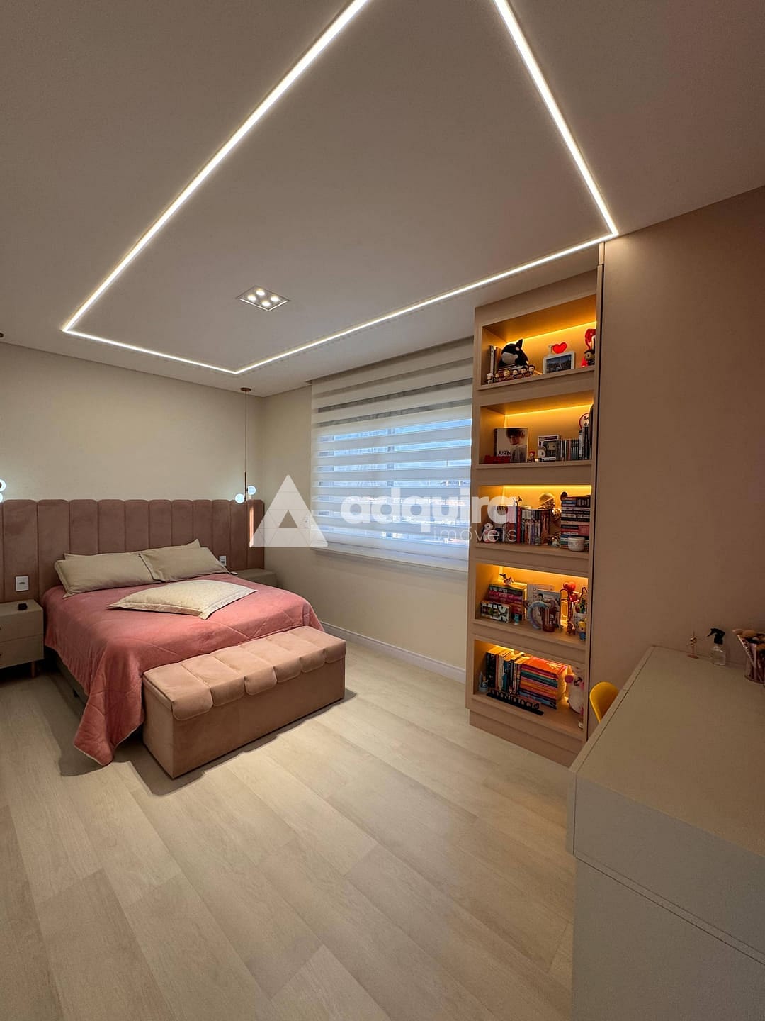 Piso superior com uma suíte master ampla e arejada, além de uma demi-suíte com closet e banheiro de acabamento refinado.