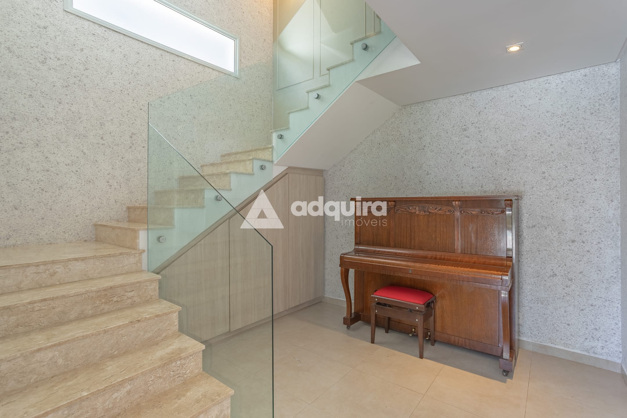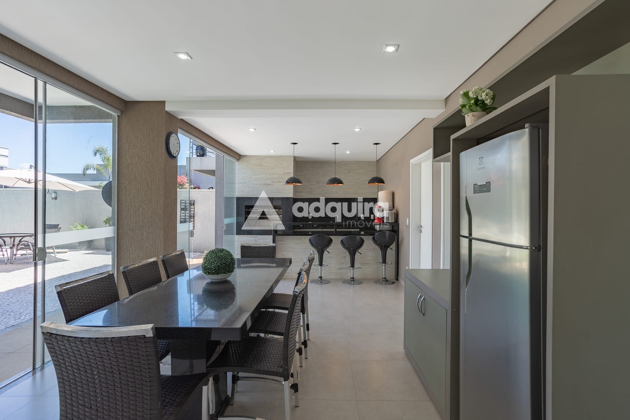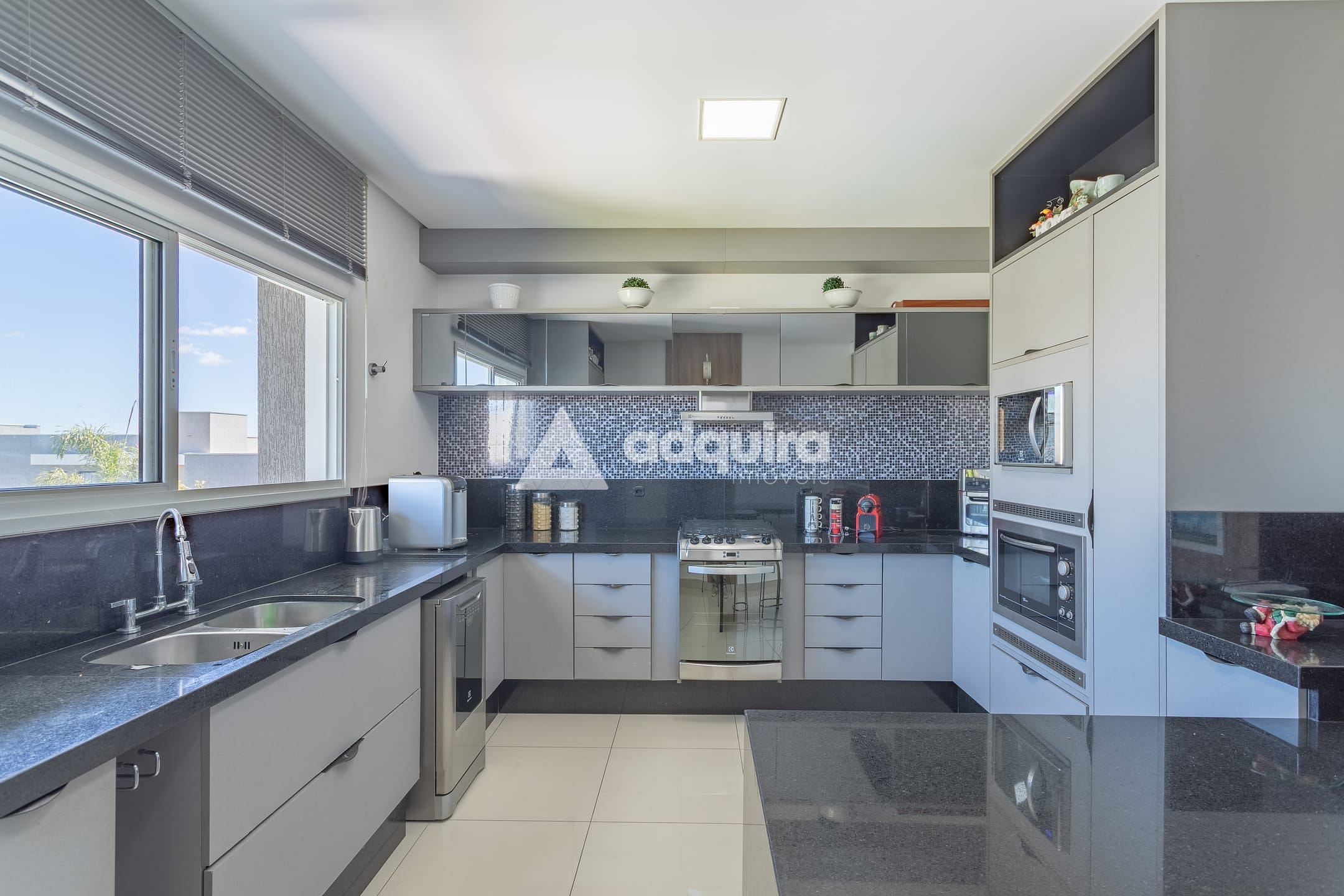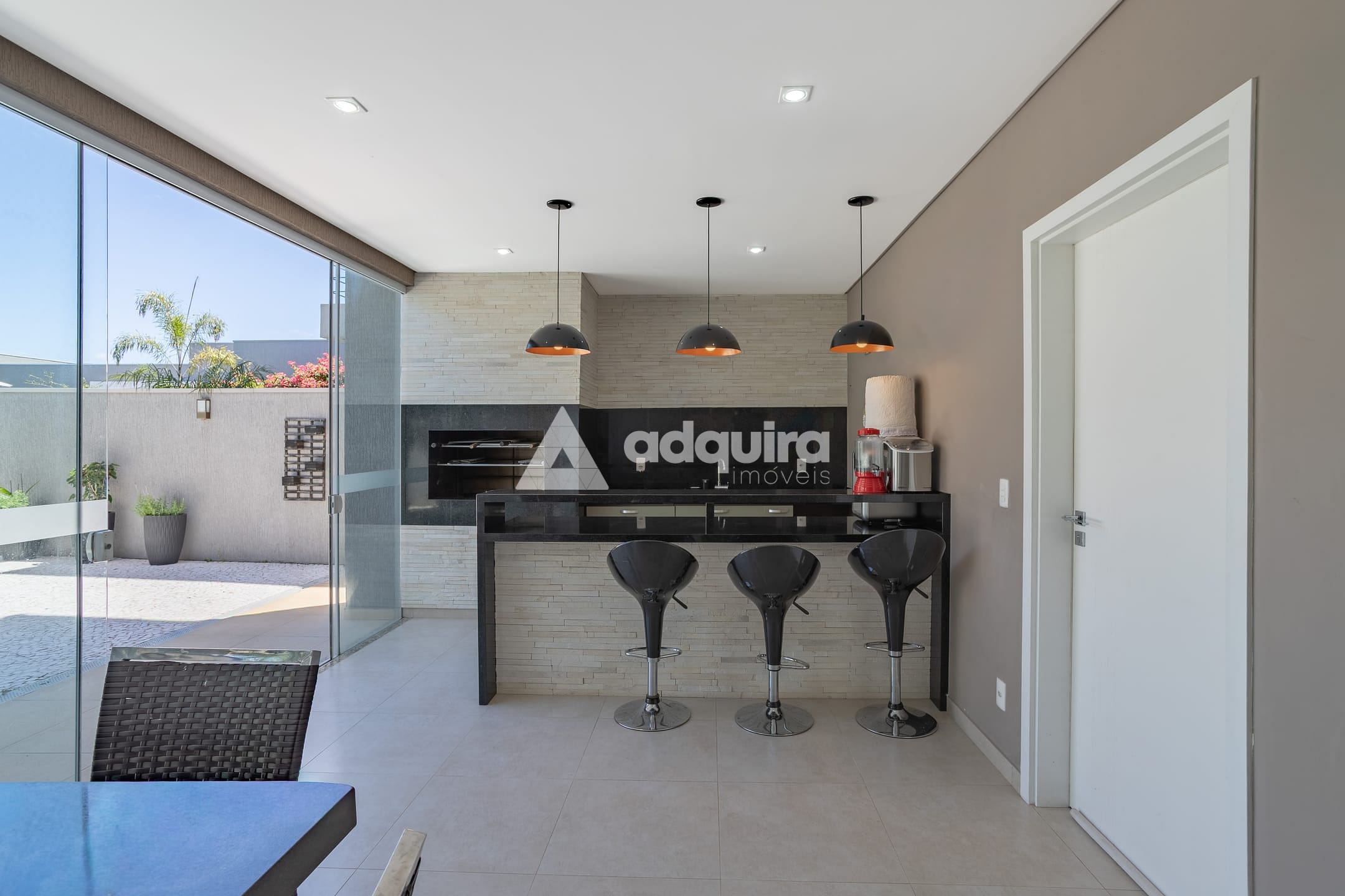 No piso inferior, conta com depósito, hall com armários sob a escada, espaço gourmet completo com churrasqueira e banheiro, lavanderia e amplas portas de vidro que se abrem para o jardim e a piscina, a qual possui preparação para aquecimento. O espaço gourmet possui ainda entrada independente, garantindo maior praticidade e privacidade.